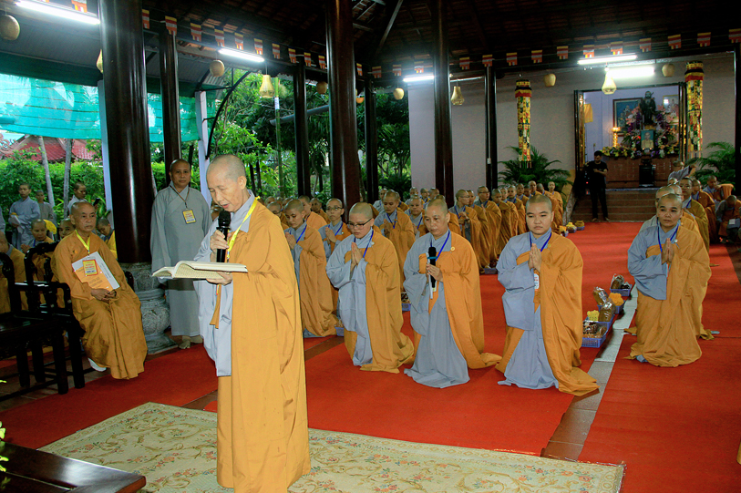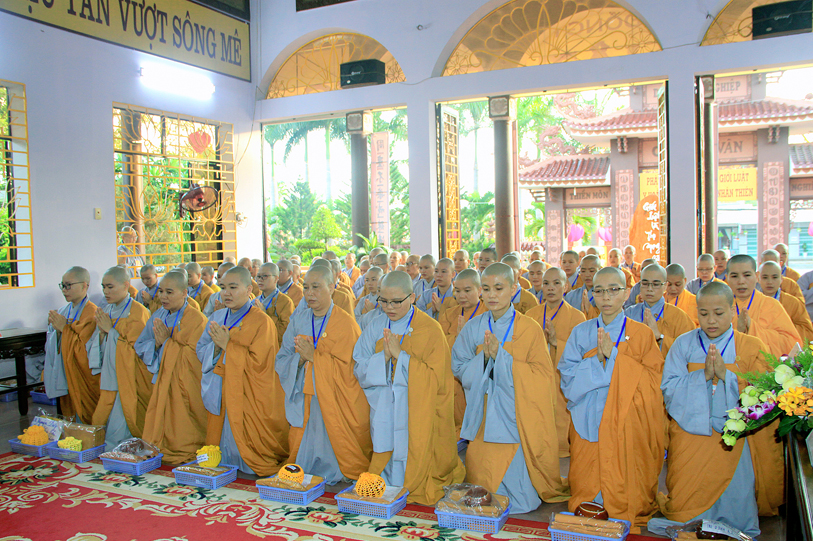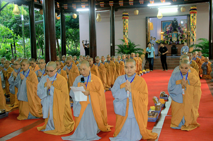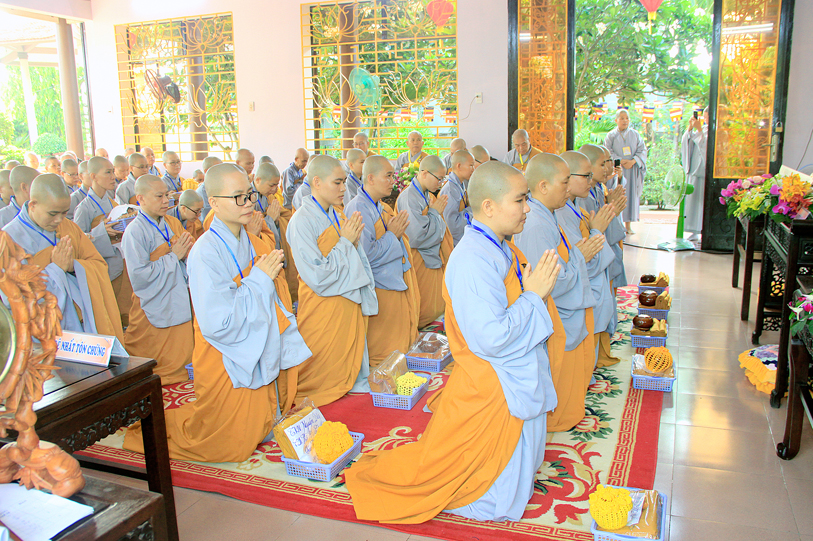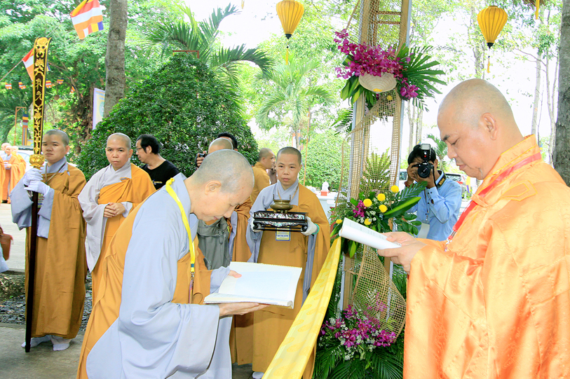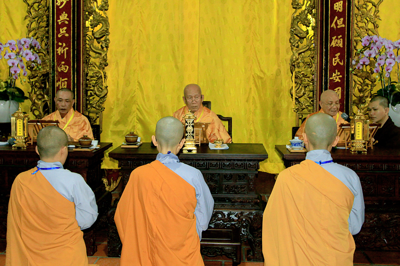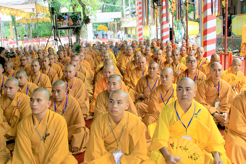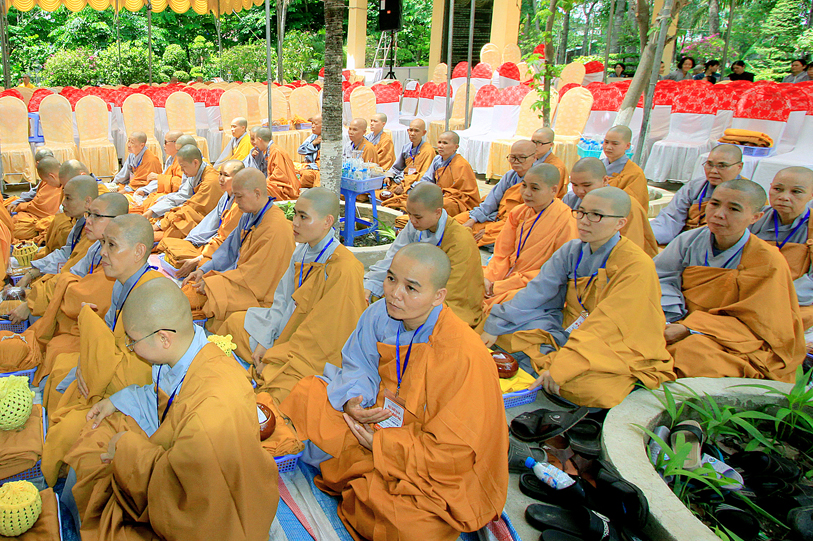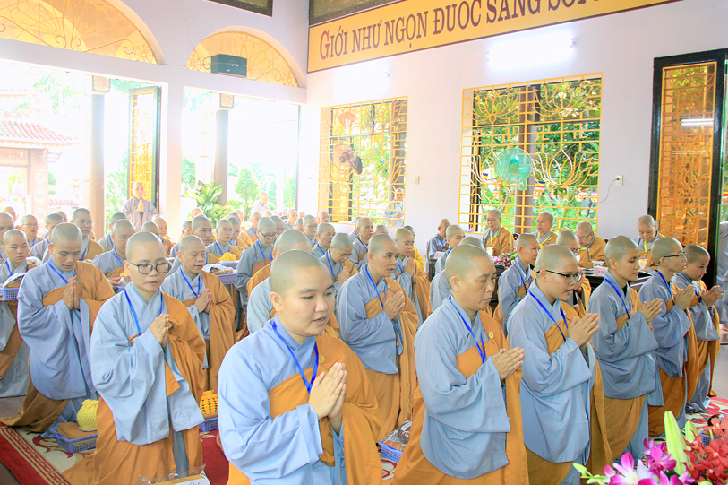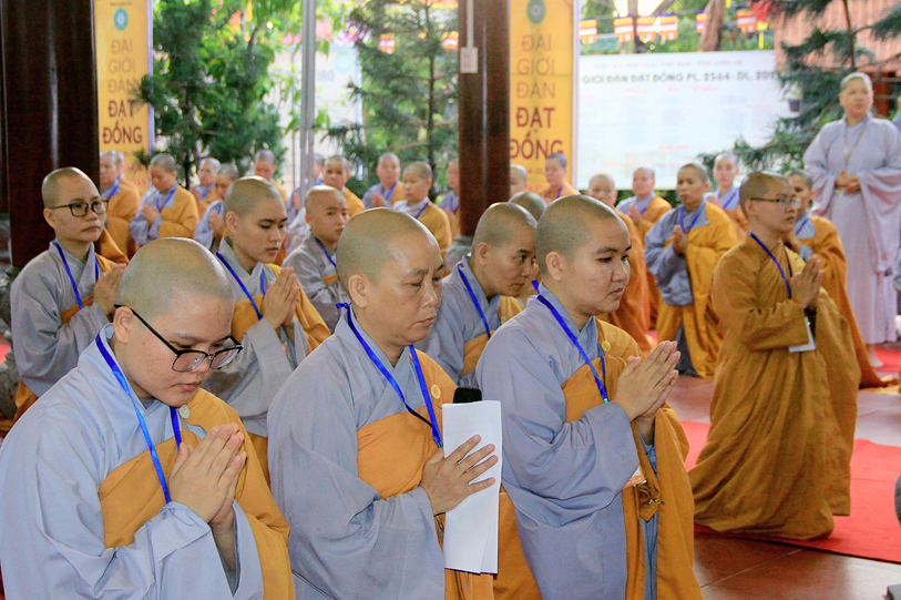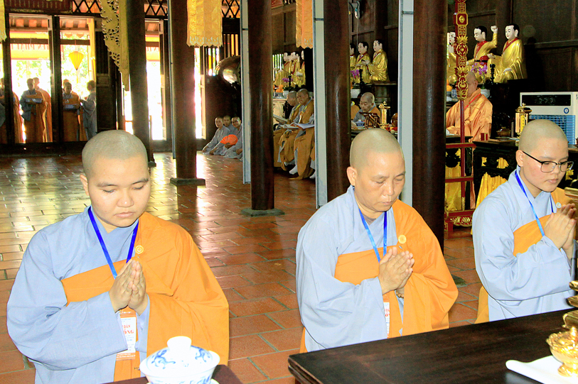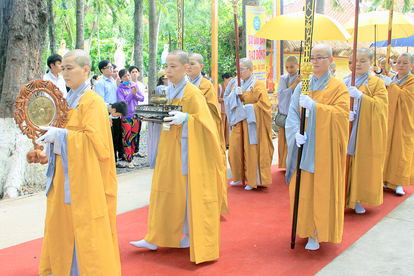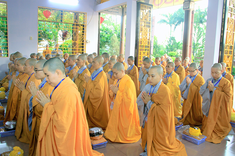 Từng hồi chuông trống trầm hùng đồng trỗi nhịp, các giới tử phủ phục hai hàng, nghi lễ trang nghiêm, tạo nên quang cảnh thiêng liêng vô cùng trang trọng. Lời điển lễ thanh tao, hòa nhịp trong tiếng thủ xích uy nghiêm, giới tử nhiếp phục sáu căn, trần tâm đoạn tuyệt. Ba y vừa đắp, đại nguyện tràn dâng, lối vào Phật đạo thênh thang rộng mở.