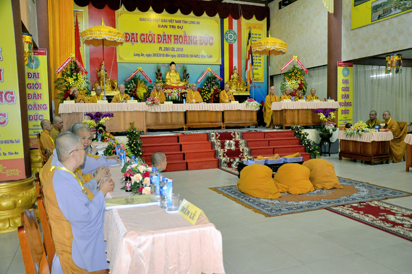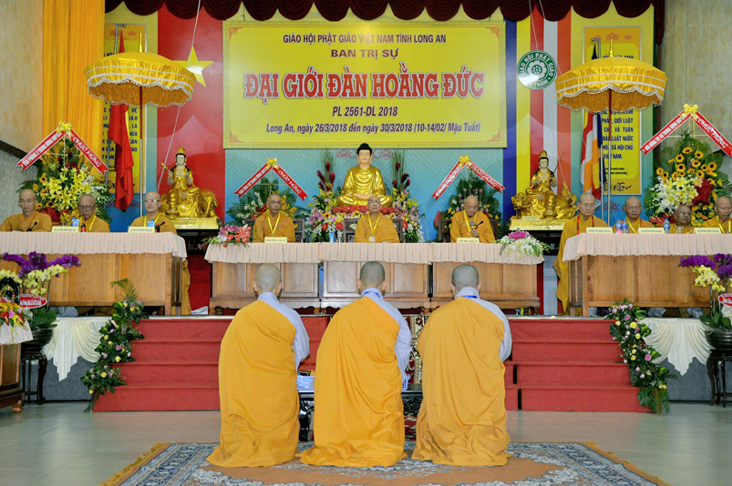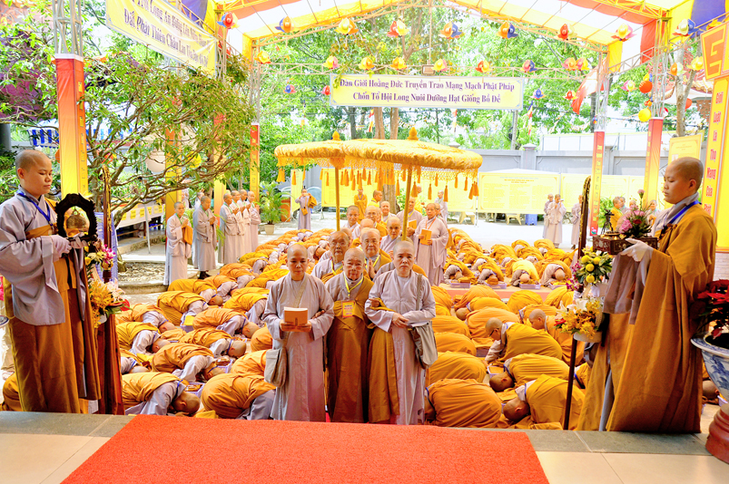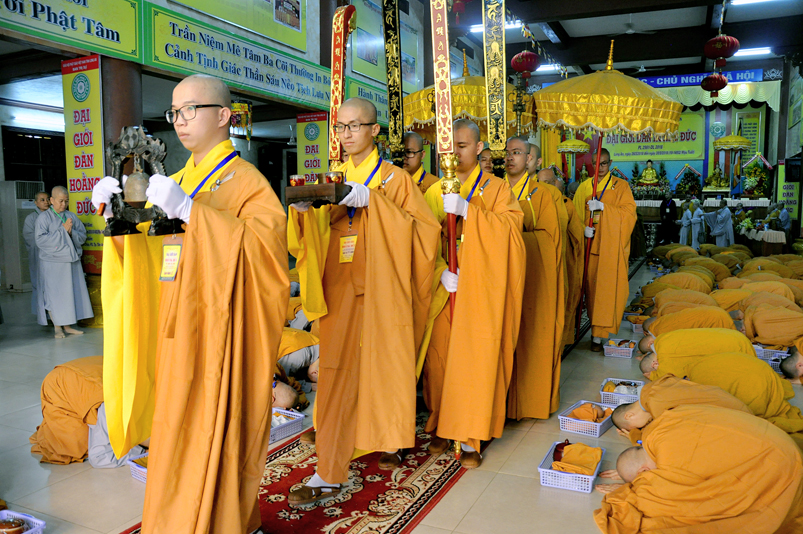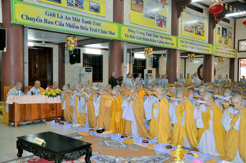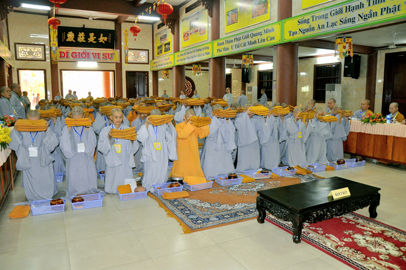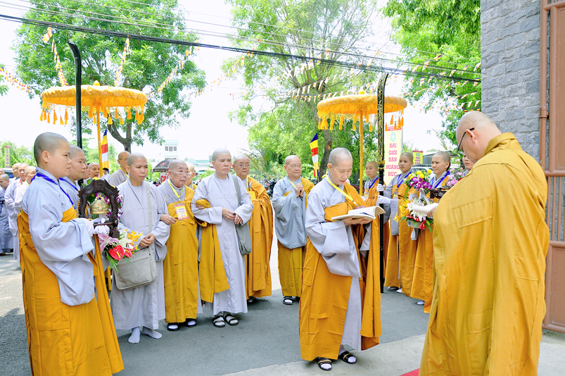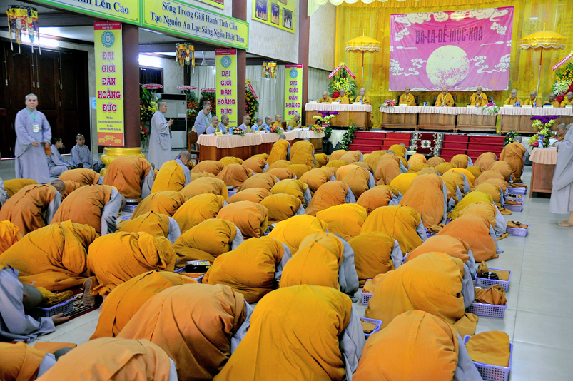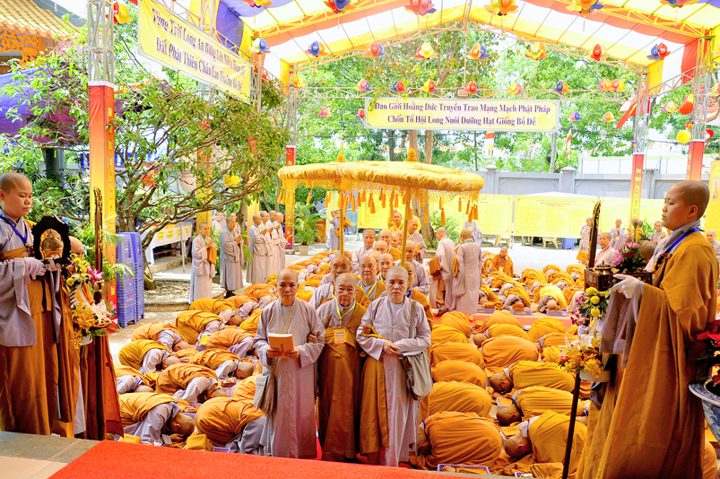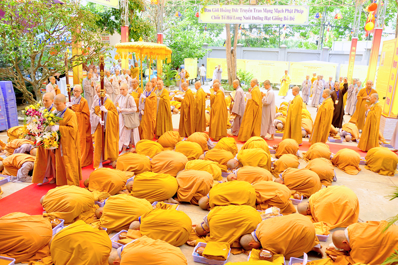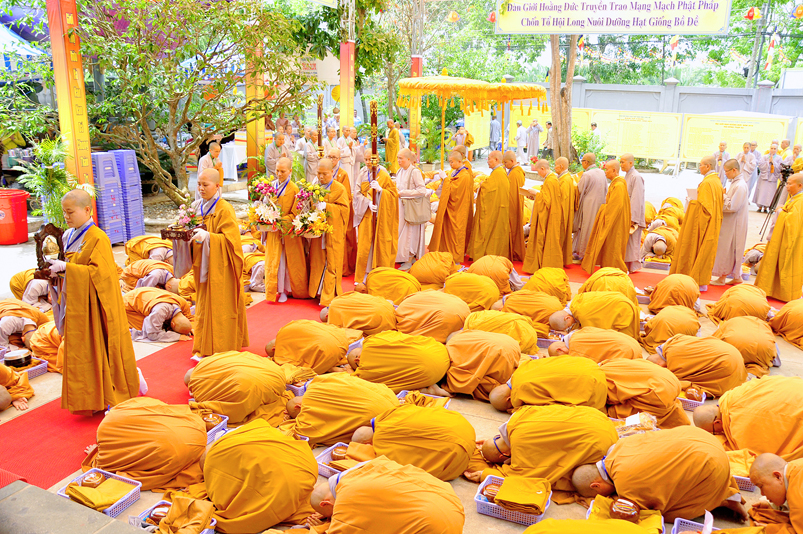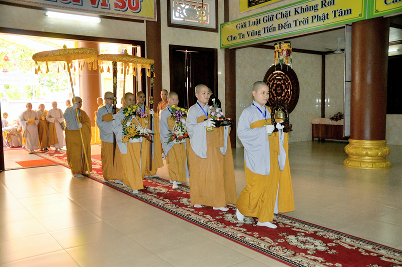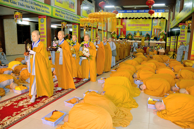 Sau lời tác bạch xin được vào giới trường Tăng của Ni trưởng Thích nữ Tuệ Đăng, Đại đức Lệ Ngôn – Trưởng ban Hoằng pháp BTS GHPGVN tỉnh Long An và ban dẫn thỉnh hướng dẫn chư Ni vào đảnh lễ Tam bảo, bái Đại Tăng cầu thỉnh trao truyền Chánh pháp, Giới luật cho giới tử Ni theo nghi thức Luật tạng chế định.
