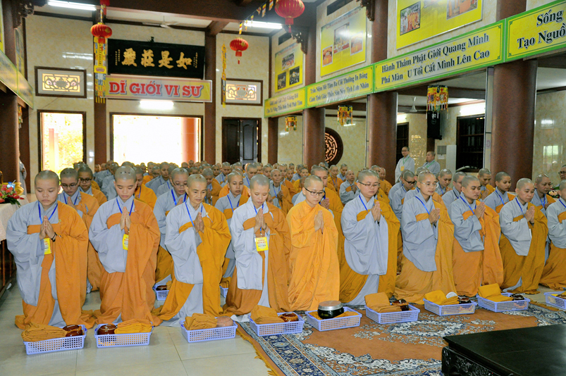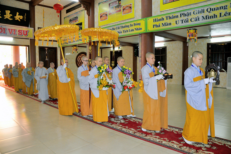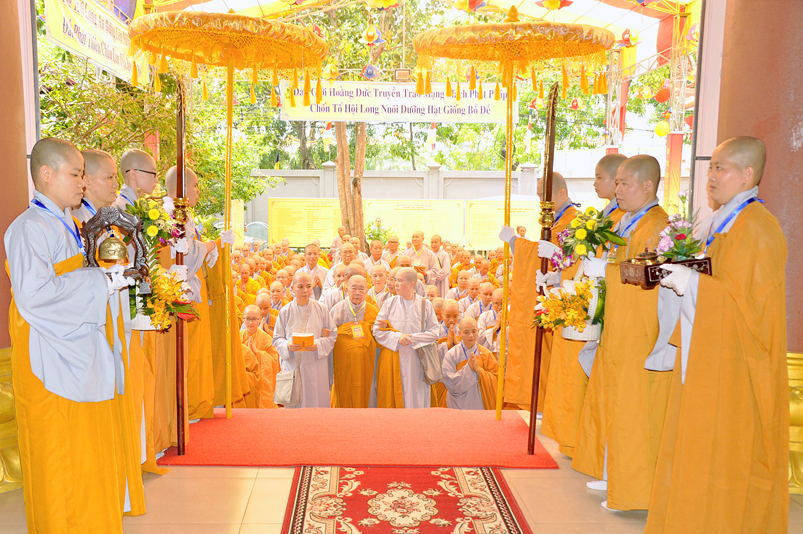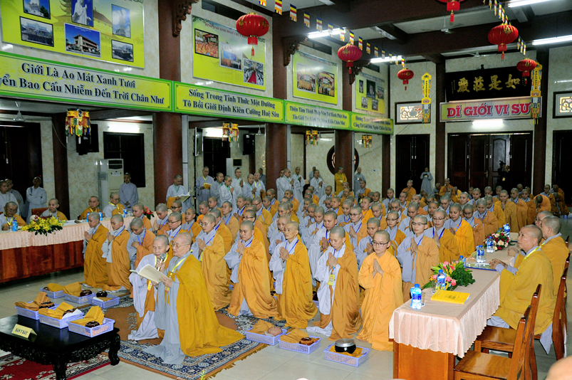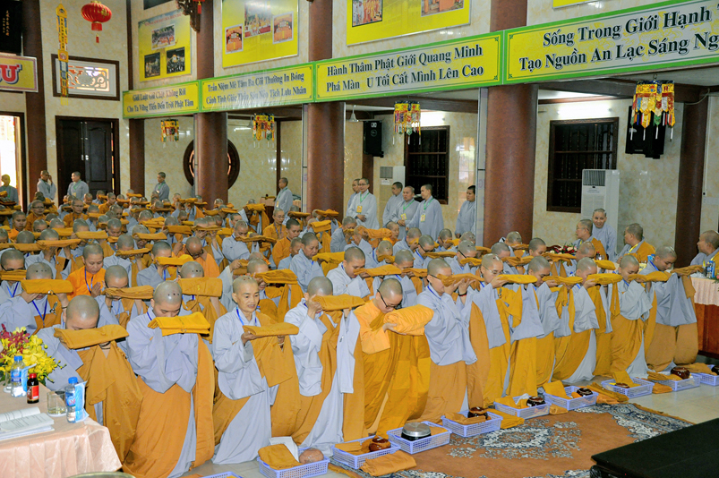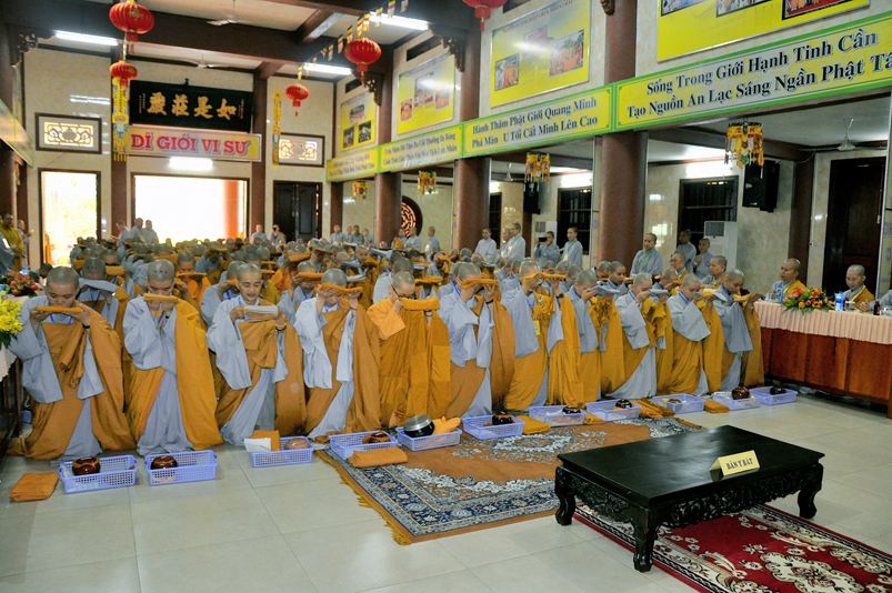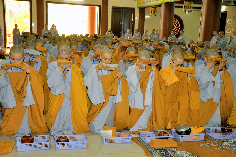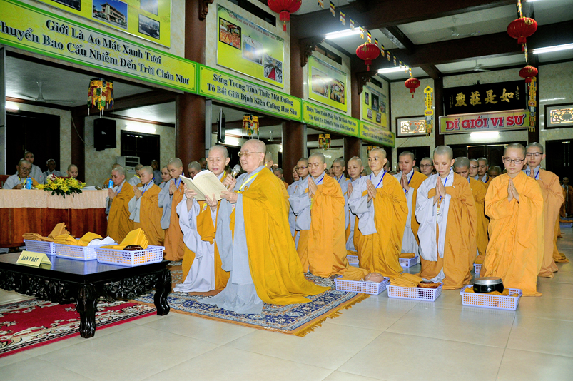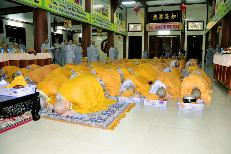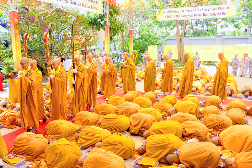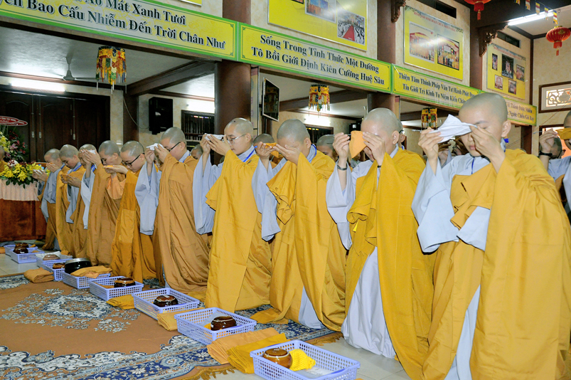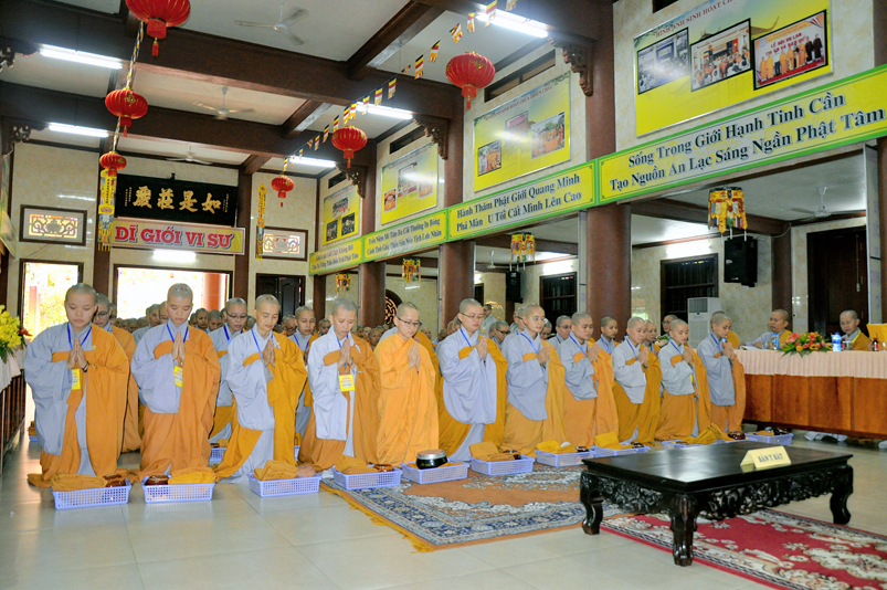 Sau lời tác bạch xin được vào giới trường Tăng của Ni trưởng Thích nữ Tuệ Đăng, Đại đức Lệ Ngôn – Trưởng ban Hoằng pháp BTS GHPGVN tỉnh Long An và ban dẫn thỉnh hướng dẫn chư Ni vào đảnh lễ Tam bảo, bái Đại Tăng cầu thỉnh trao truyền Chánh pháp, Giới luật cho giới tử Ni theo nghi thức Luật tạng chế định.