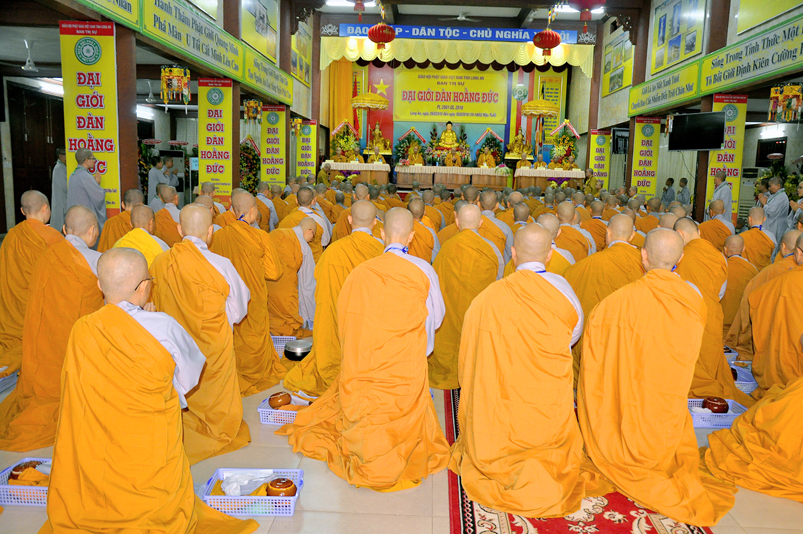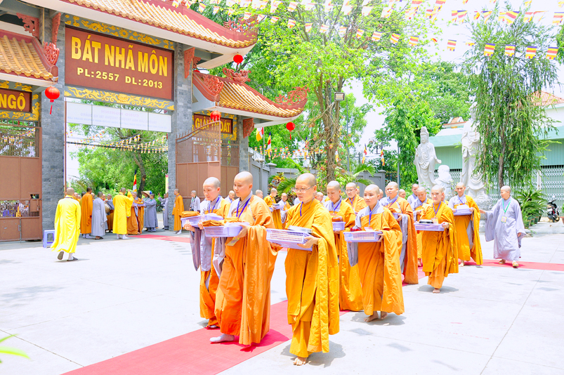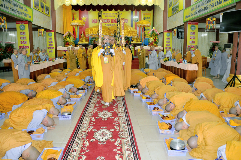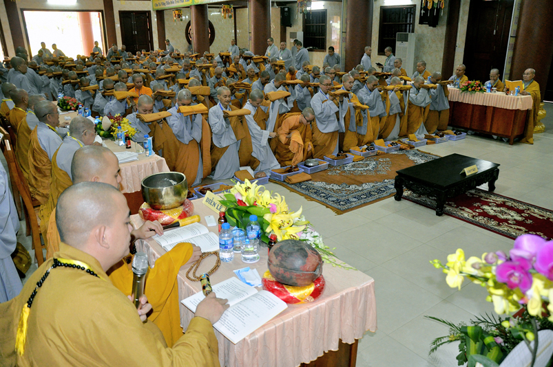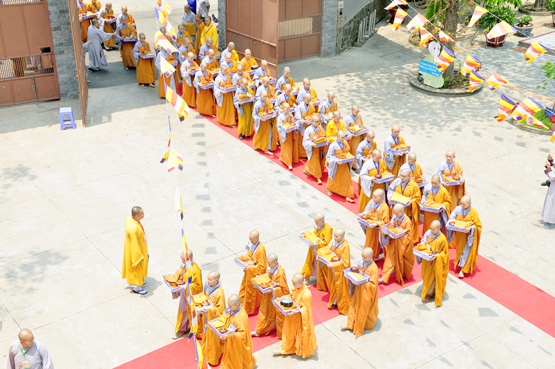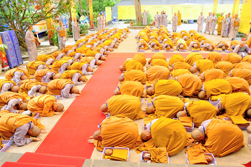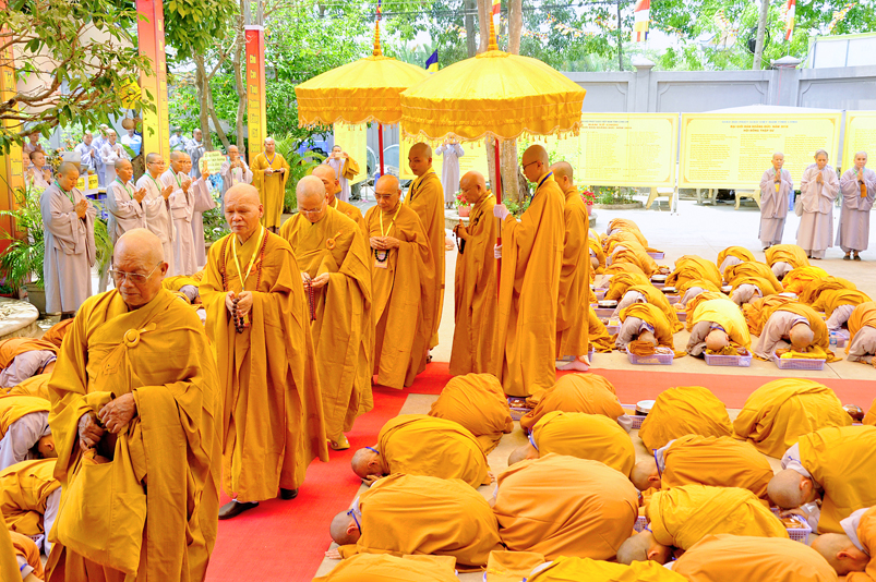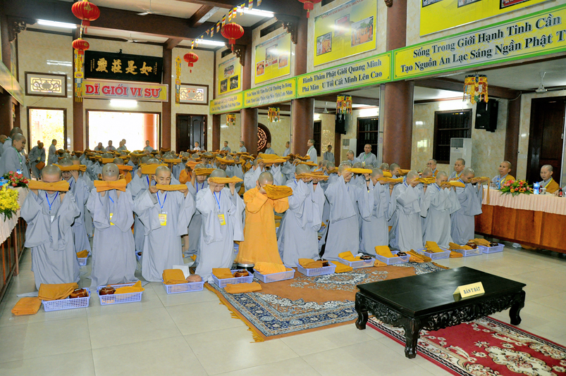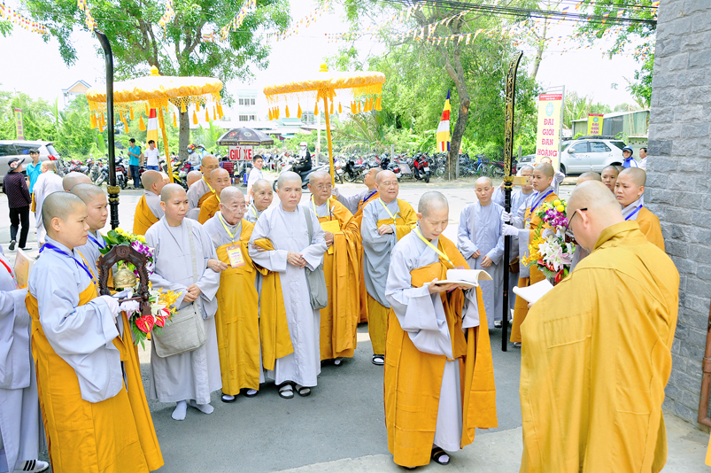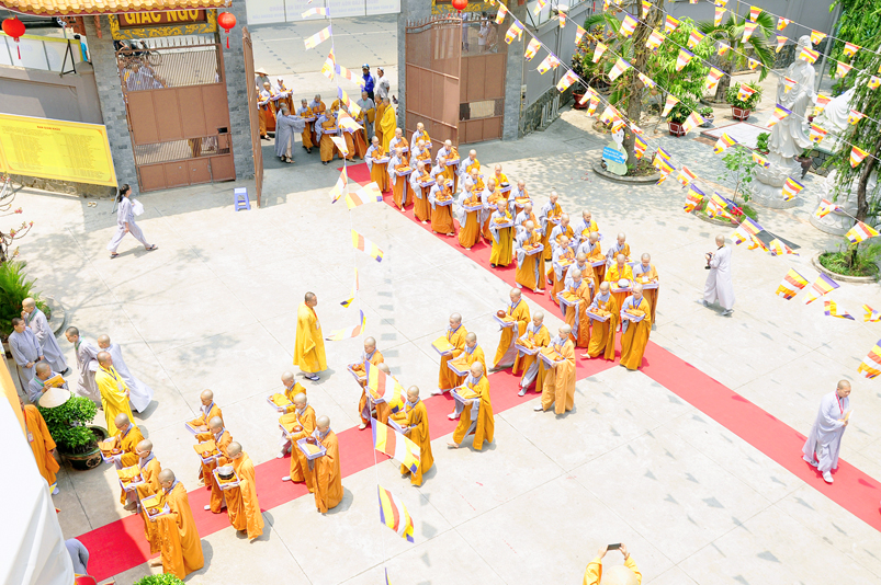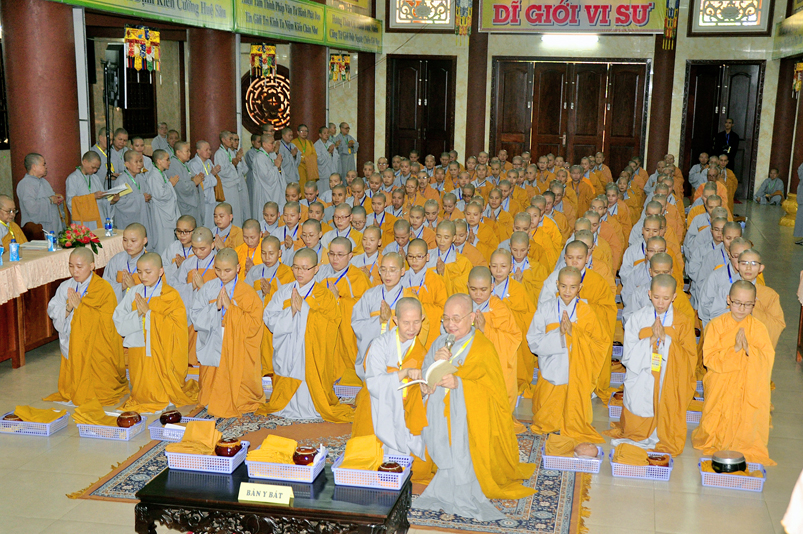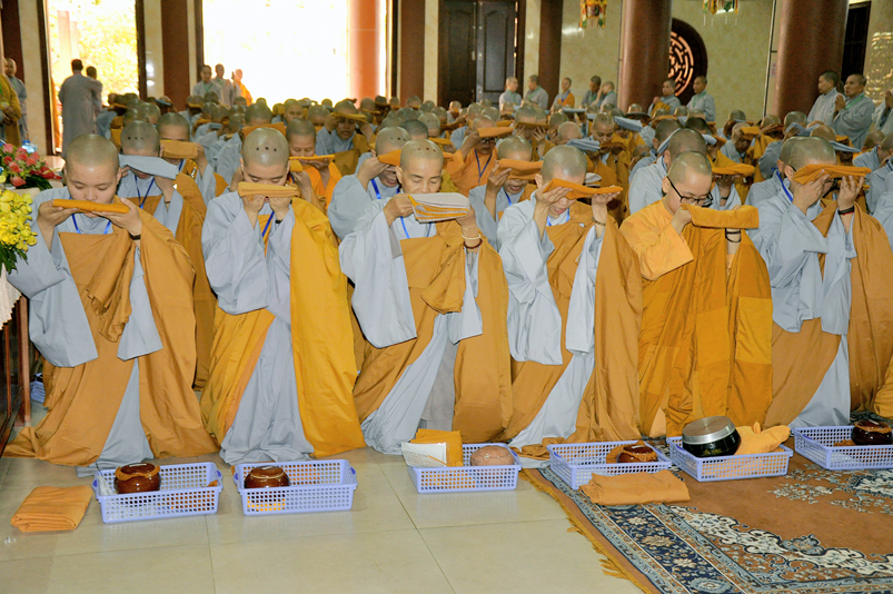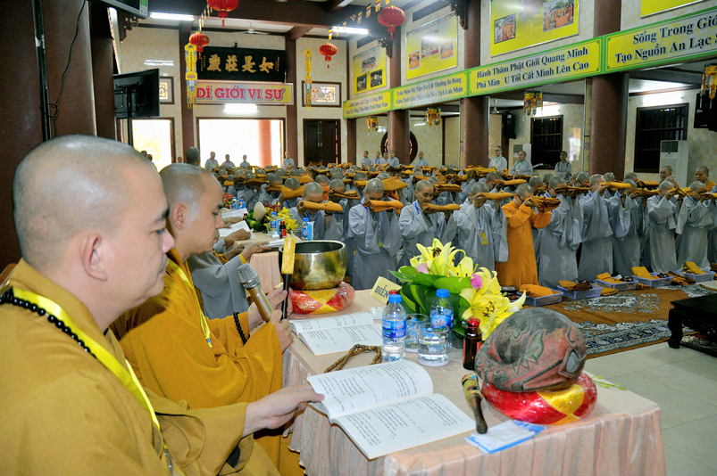 Sau lời tác bạch xin được vào giới trường Tăng của Ni trưởng Thích nữ Tuệ Đăng, Đại đức Lệ Ngôn – Trưởng ban Hoằng pháp BTS GHPGVN tỉnh Long An và ban dẫn thỉnh hướng dẫn chư Ni vào đảnh lễ Tam bảo, bái Đại Tăng cầu thỉnh trao truyền Chánh pháp, Giới luật cho giới tử Ni theo nghi thức Luật tạng chế định.