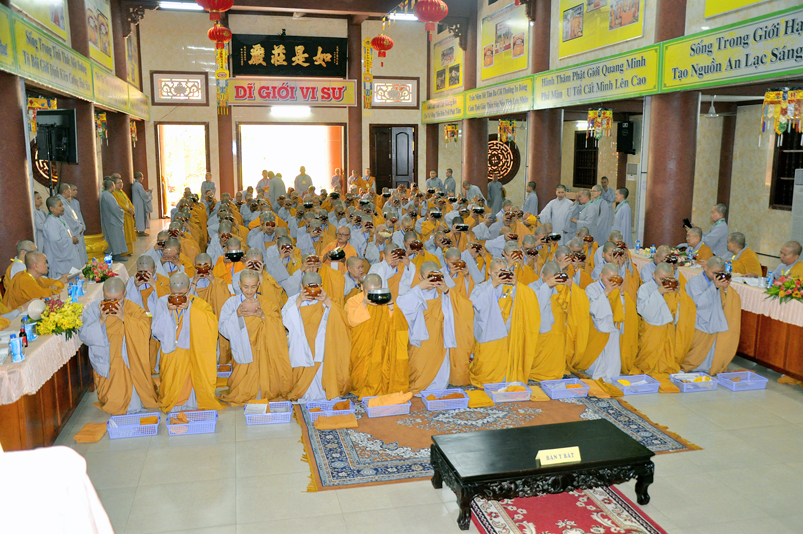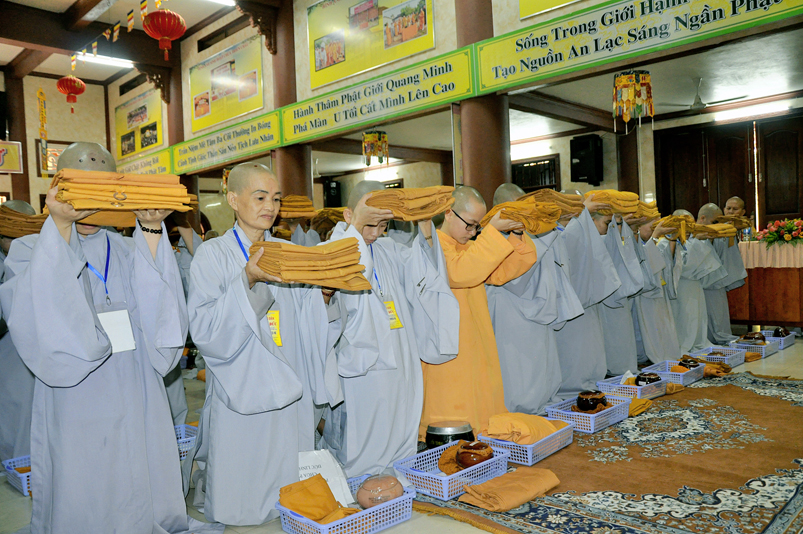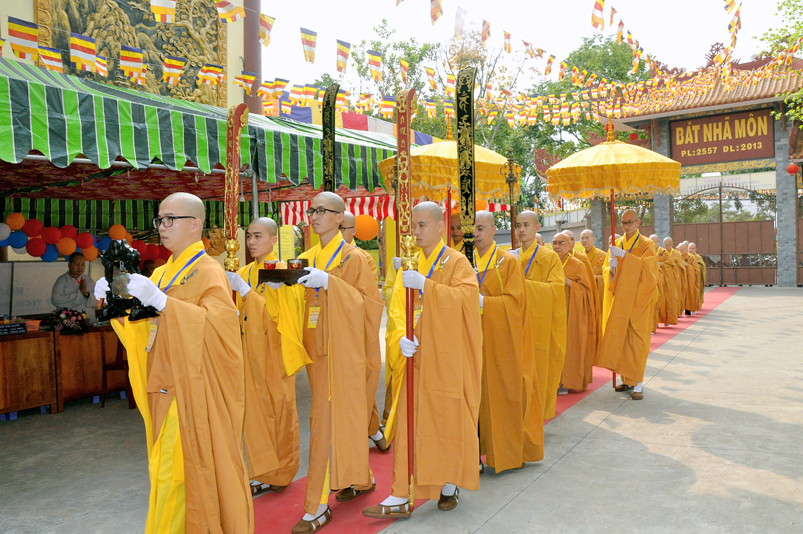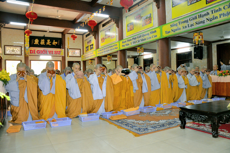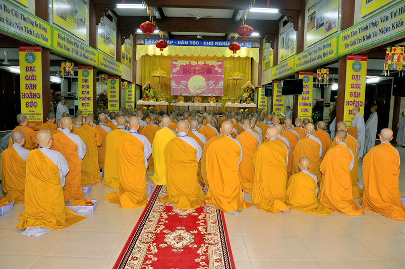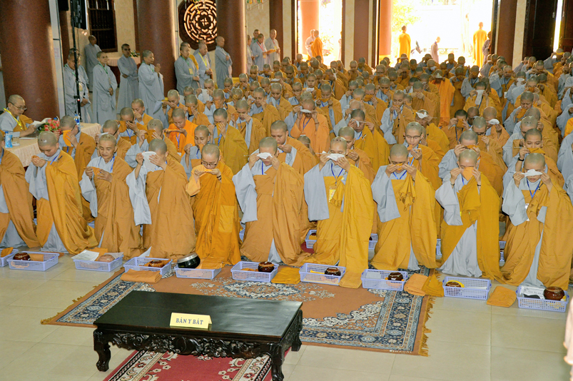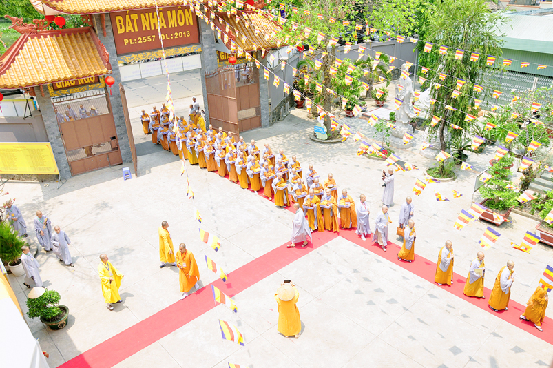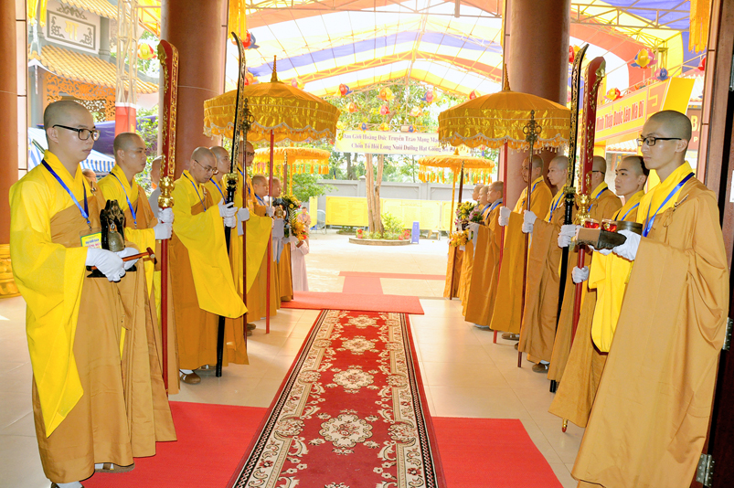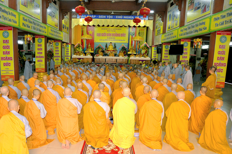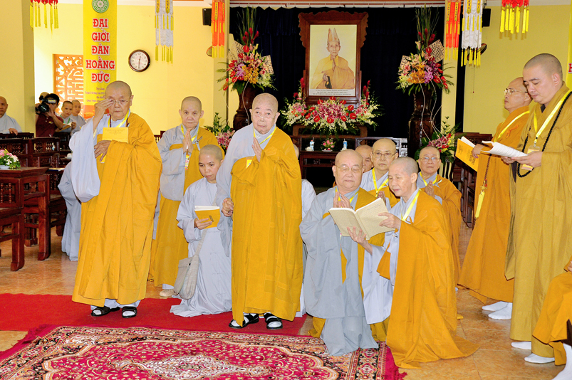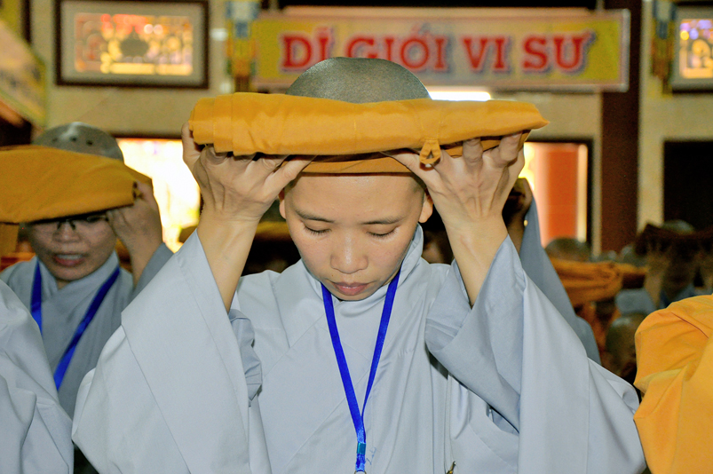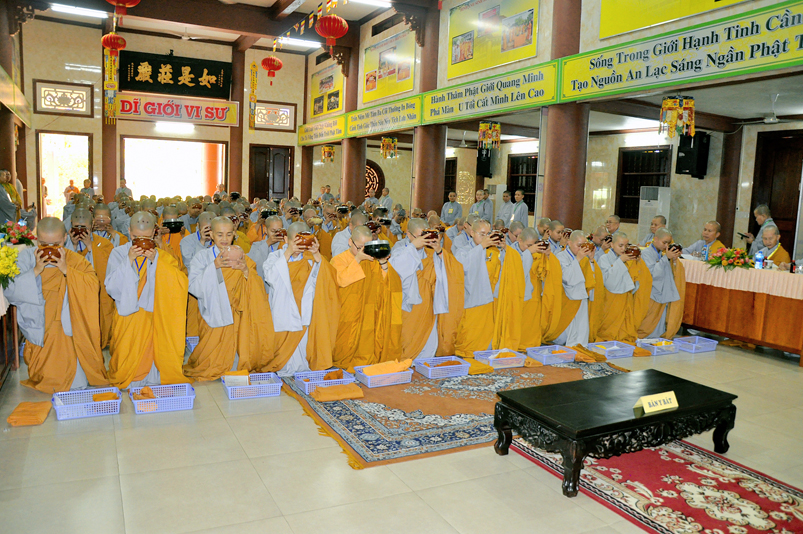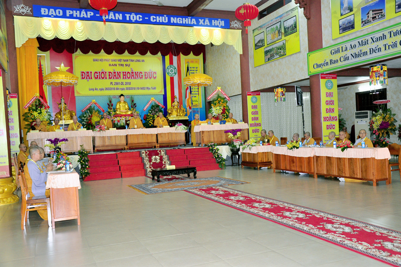 Sau lời tác bạch xin được vào giới trường Tăng của Ni trưởng Thích nữ Tuệ Đăng, Đại đức Lệ Ngôn – Trưởng ban Hoằng pháp BTS GHPGVN tỉnh Long An và ban dẫn thỉnh hướng dẫn chư Ni vào đảnh lễ Tam bảo, bái Đại Tăng cầu thỉnh trao truyền Chánh pháp, Giới luật cho giới tử Ni theo nghi thức Luật tạng chế định.