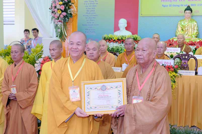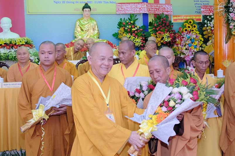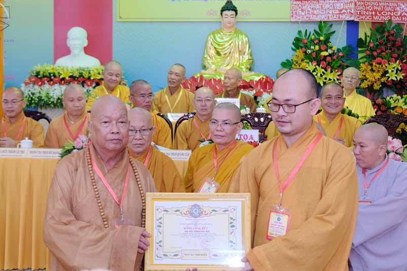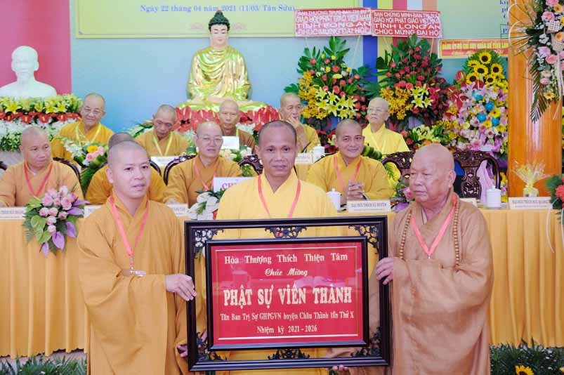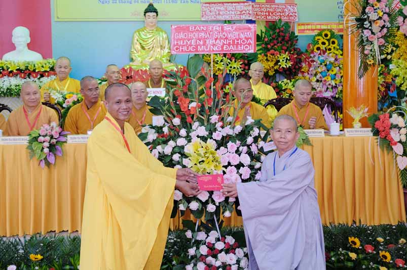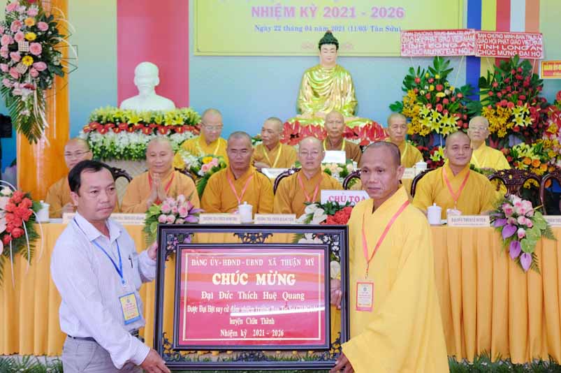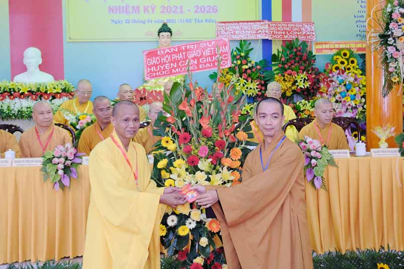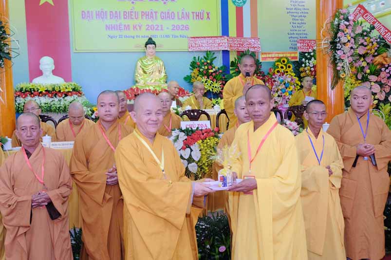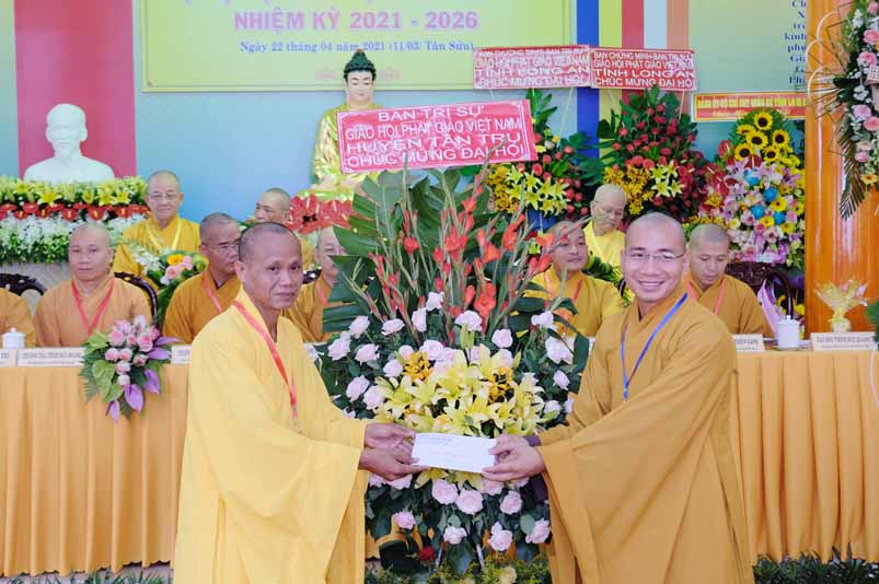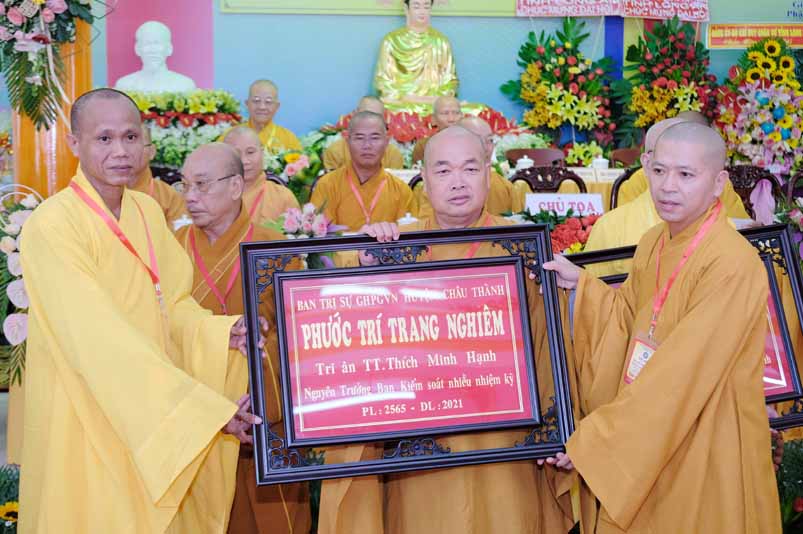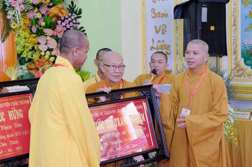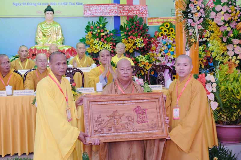 Tại Đại hội, Hoà thượng Thích Minh Thiện đã trao con dấu và tặng khánh vàng tặng hoa chúc mừng đến tân Ban Trị sự.