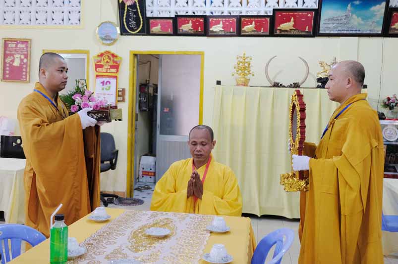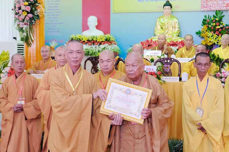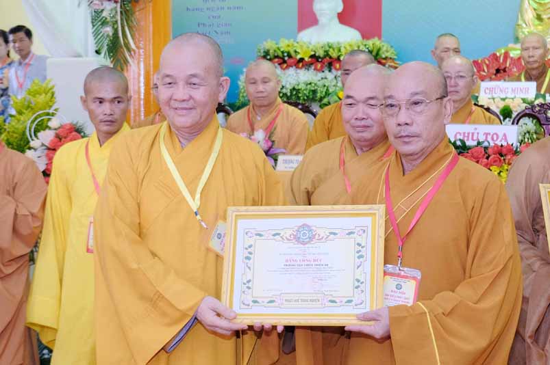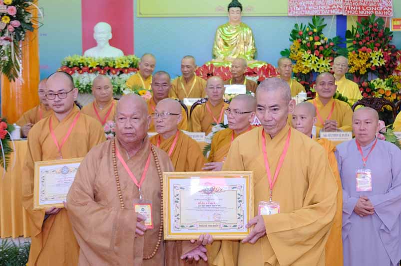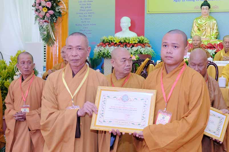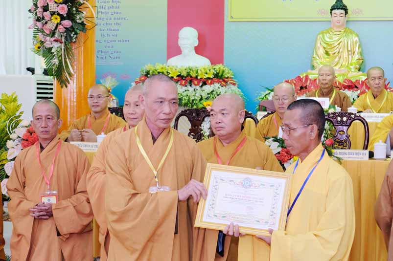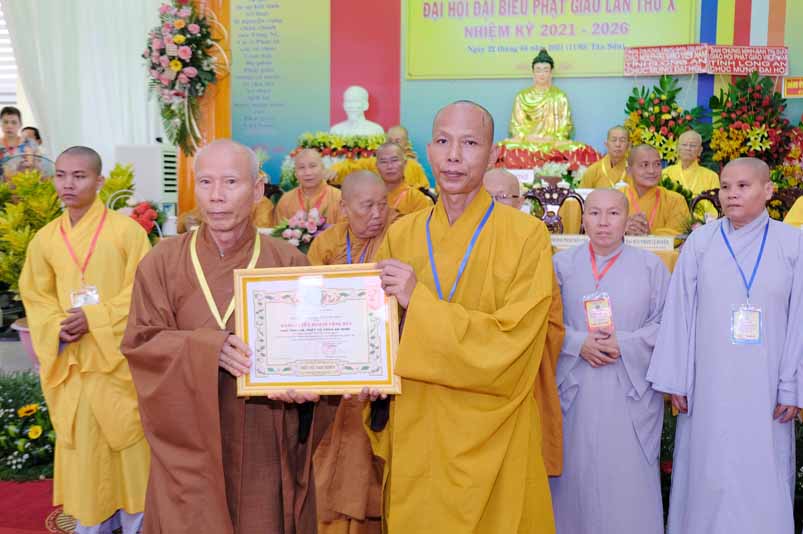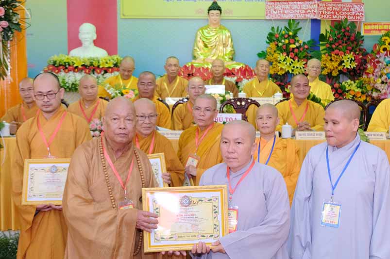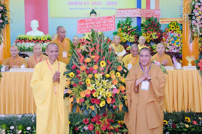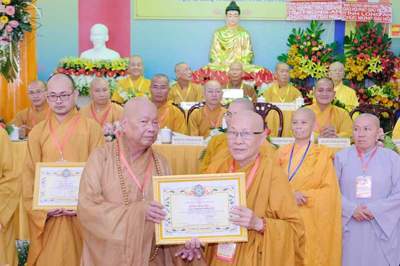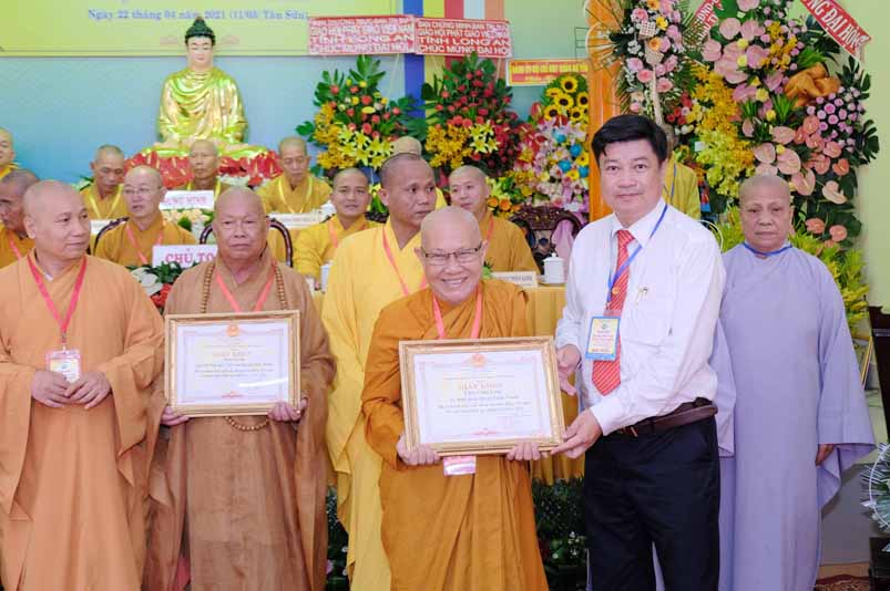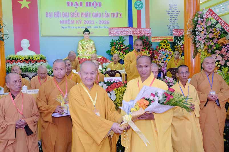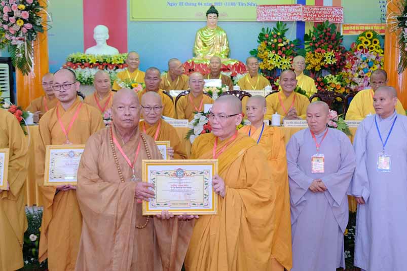 Tại Đại hội, Hoà thượng Thích Minh Thiện đã trao con dấu và tặng khánh vàng tặng hoa chúc mừng đến tân Ban Trị sự.