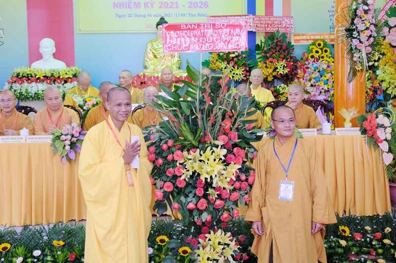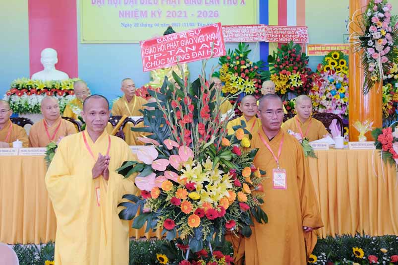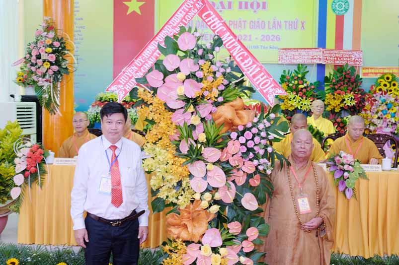 Ban tổ chức đón nhận nhiều lẵng hoa cao quý của Ban Trị sự các huyện, thị, thành phố trực thuộc Phật giáo Long An, lãnh đạo chính quyền địa phương chúc mừng Đại hội.