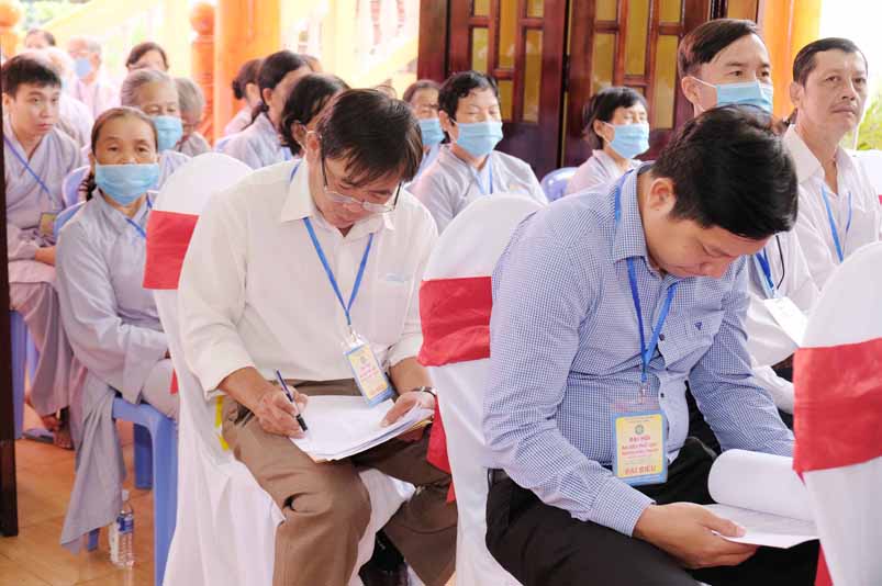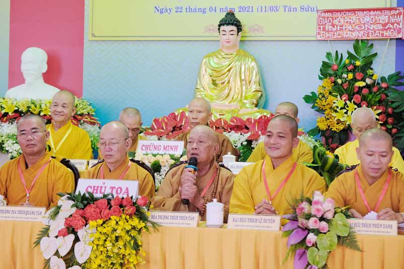 Hoà thượng Thích Thiện Tâm phát biểu mãn nhiệm. Thay mặt tiểu ban nhân sự ĐĐ. Thích Lệ Duyên- Chánh Thư ký Ban Trị sự Phật giáo tỉnh thông qua danh sách giới thiệu thành phần nhân sự dự kiến tham gia Ban Trị sự GHPGVN huyện lần thứ X, nhiệm kỳ 2021 – 2026. Hòa thượng Thích Minh Thiện- Trưởng Ban Trị sự GHPGVN tỉnh Long An, lấy ý kiến biểu quyết của Đại hội thông qua thành phần nhân sự như sau: ĐĐ Thích Huệ Quang- Trưởng ban Trị sự Kiêm Tăng sự; ĐĐ Thích Thiện Danh – Phó Trưởng ban Thường trực; Kiêm Pháp chế; SC Thích Nữ Diệu Huệ -Phó Trưởng ban Kiêm Hoằng pháp; SC Thích Nữ Liên Thuận- Phó Trưởng ban Kiêm Giáo dục; ĐĐ Thích Thiện Hội- Chánh Thư ký; ĐĐ Thích Giác Đức- Phó Thư ký Kiêm truyền thông; ĐĐ Thích Huệ Trung- Phó Thư ký; SC Thích Nữ Trang Liên- Thủ ủy BTS, Trưởng ban Phân ban đặc trách Ni giới; ĐĐ Thích Huệ Thừa- Trưởng Ban Nghi lễ; ĐĐ Thích Huệ Châu- Trưởng Ban KT – TC; ĐĐ Thích Hóa Nhựt- Trưởng Ban Văn hóa; ĐĐ Thích Thiện Đạt- Trưởng Ban Kiểm soát; SC Thích Nữ Lan Liên- Trưởng Ban HDPT.