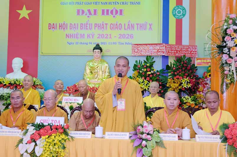 Phát biểu nhận nhiệm vụ của tân Ban Trị sự GHPGVN huyện Châu Thành lần thứ X, nhiệm kỳ 2021 – 2026 Đại đức Huệ Quang- Trưởng Ban Trị sự đại diện tập thể phát nguyện xin nhận nhiệm vụ trước Đại hội. Đại đức nói “Đây cũng là niềm vinh dự to lớn nhưng cũng là trách nhiệm vô cùng quan trọng để tân Ban Trị Sự GHPGVN Huyện Châu Thành thực thi nhiệm vụ, quyền hạn đã được Giáo hội giao phó và pháp luật quy định. Tân Ban Trị Sự xin phát nguyện đoàn kết hoà hợp, đem hết tâm lực, sức lực để điều hành mọi Phật sự với tinh thần phục vụ chúng sanh là cúng dường chư Phật.”