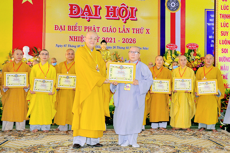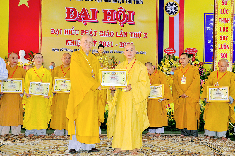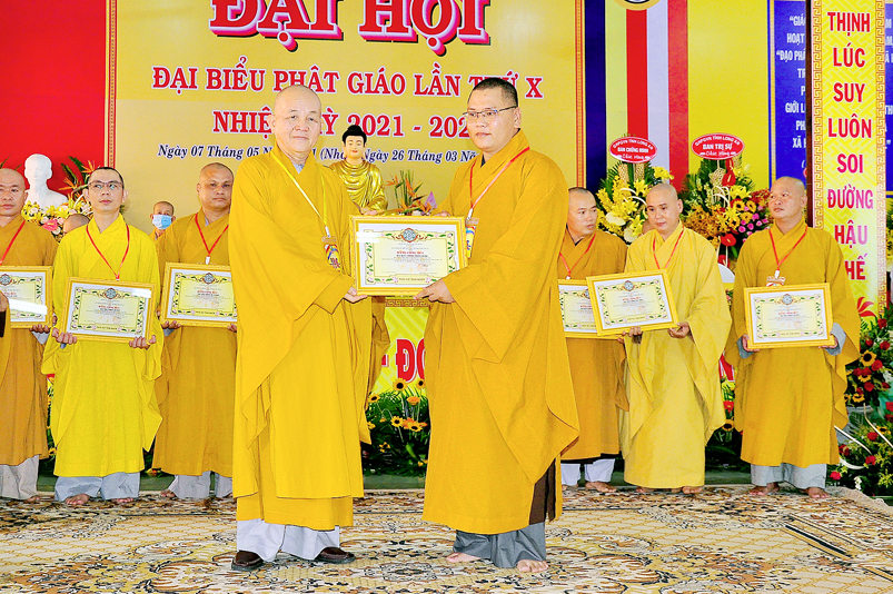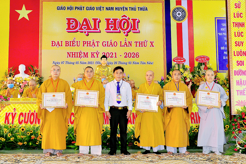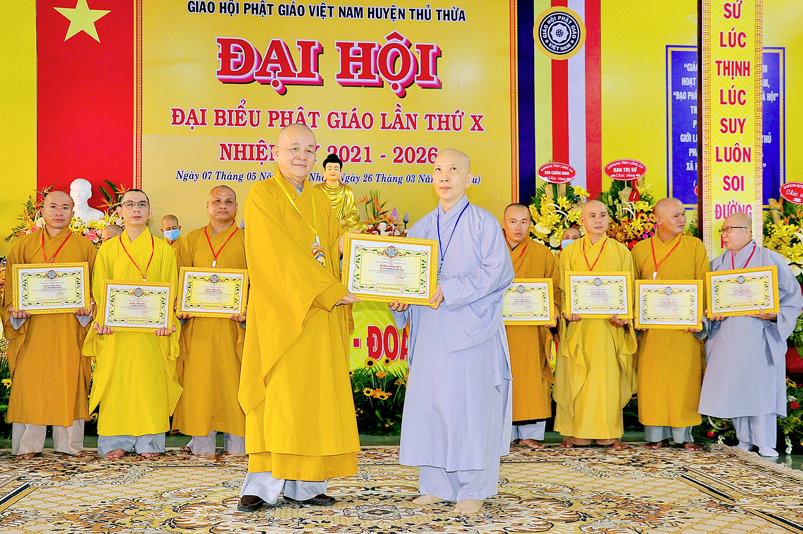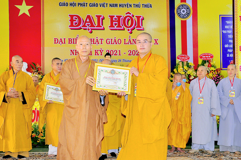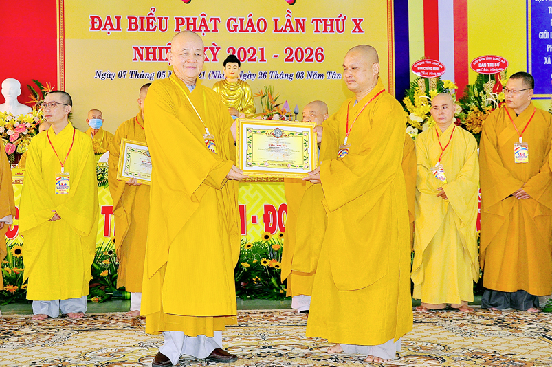 Nhân dịp này, Ban Trị sự GHPGVN tỉnh Long An, trao bằng tuyên dương công đức và bằng công đức đến những tập thể và cá nhân đạt được những thành tích tốt trong nhiệm kỳ qua.