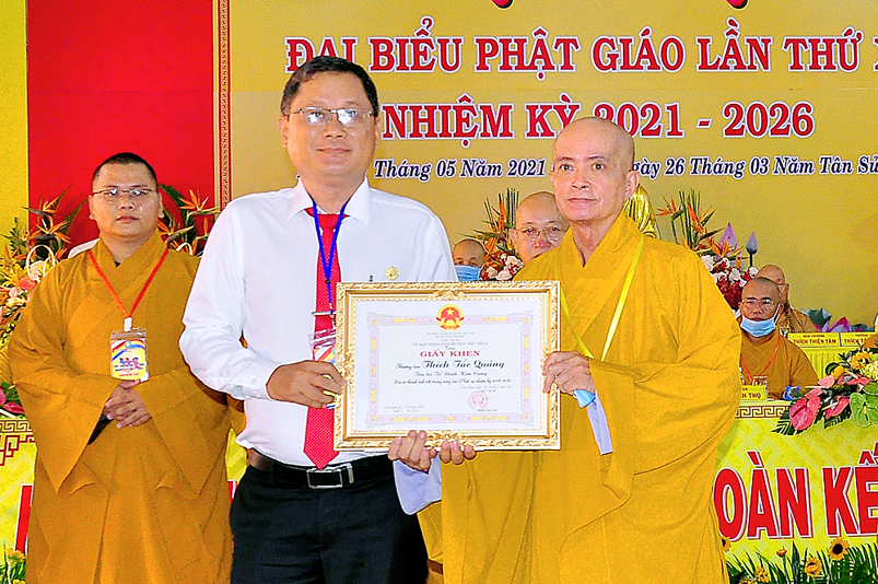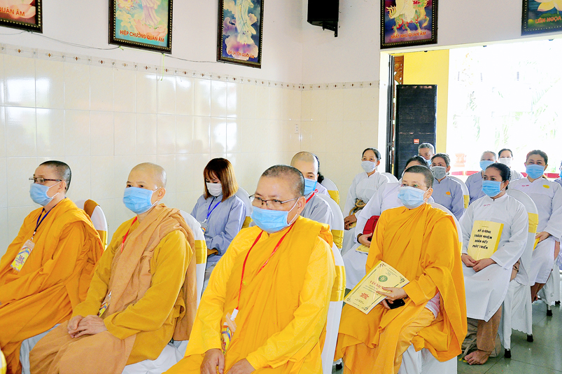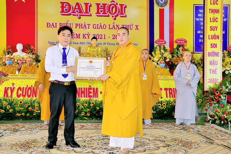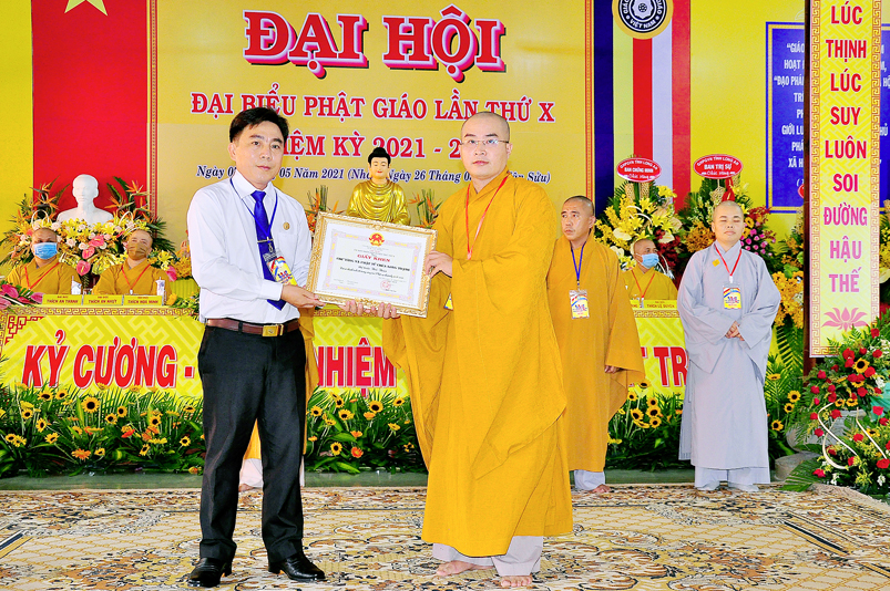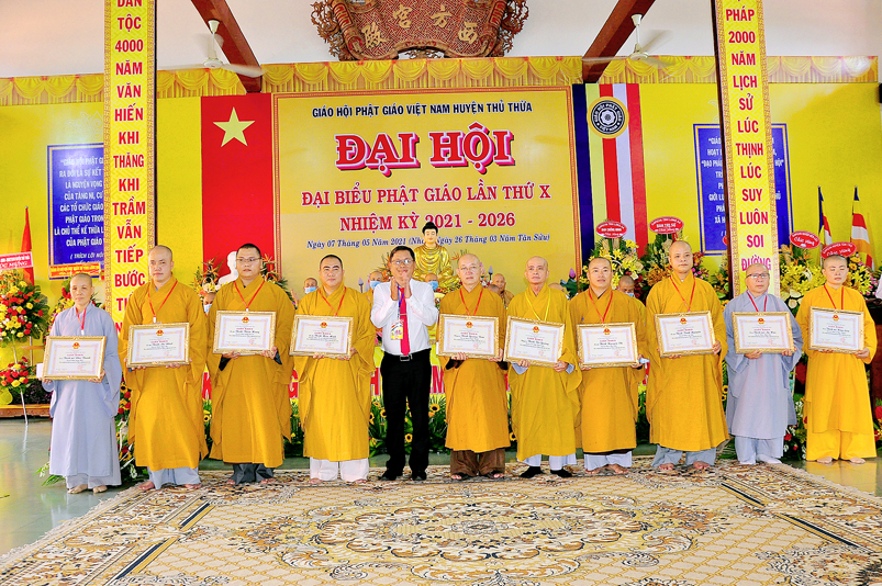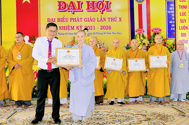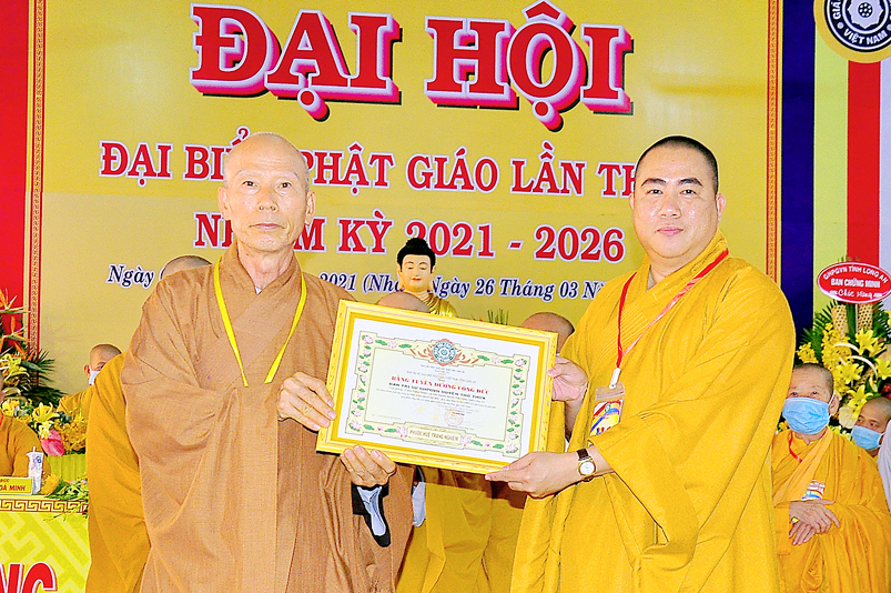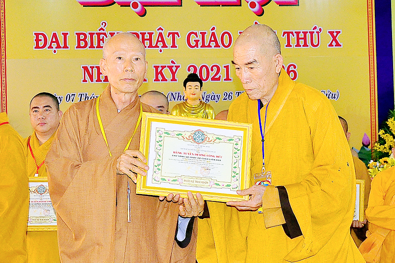 Nhân dịp này, Ban Trị sự GHPGVN tỉnh Long An, trao bằng tuyên dương công đức và bằng công đức đến những tập thể và cá nhân đạt được những thành tích tốt trong nhiệm kỳ qua.