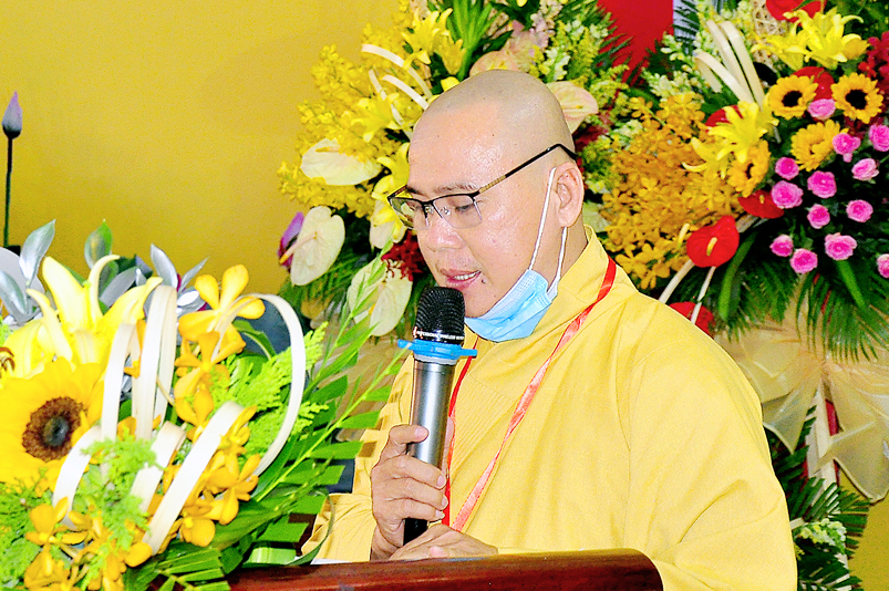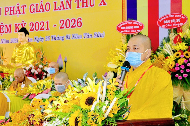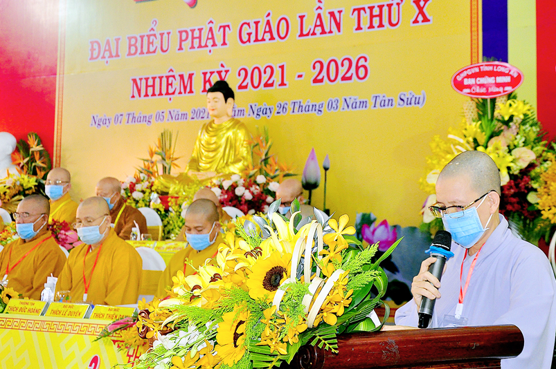 Tiếp đó, Đại đức Thích Đức Biến, Chánh Thư ký Ban Trị sự GHPGVN huyện Thủ Thừa, thay mặt Chư tôn đức báo cáo hoạt động Phật sự nhiệm Kỳ IX (2016-2021).