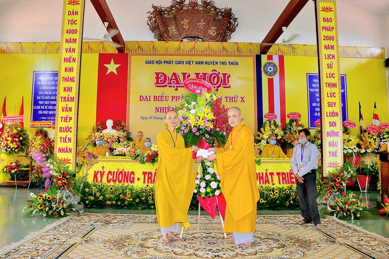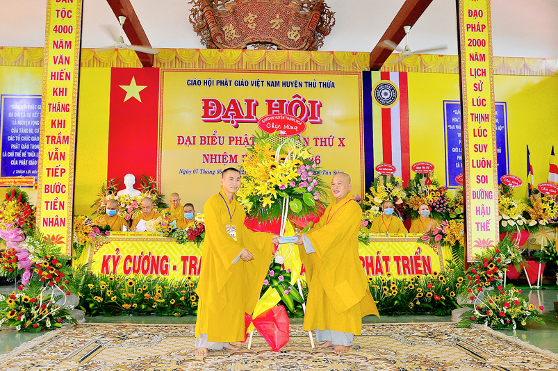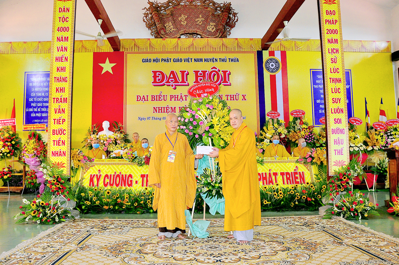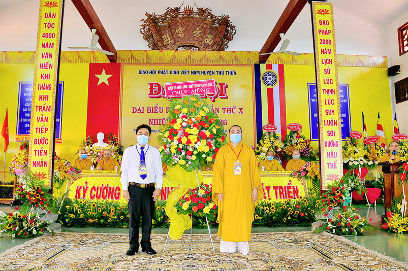 Sau diễn văn khai mạc Đại hội, Hòa thượng Thích Huệ Hồng, Hòa thượng Thích Minh Thiện, Ông Công Hồng Bạch, ban chỉ huy quân sự tỉnh Long An, Huyện ủy, HĐND, UBND trao tặng hoa chúc mừng Đại hội. Dịp này Ông Lê Hoàng Hùng đã thay mặt chính quyền huyện Thủ Thừa trao tặng số tiền là 20.000.000 đồng để ủng hộ Đại hội Phật giáo huyện.