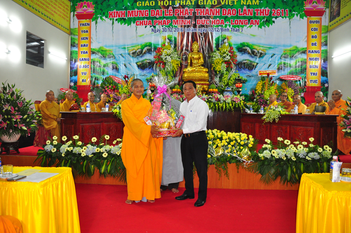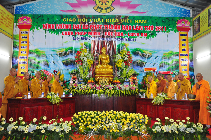 Diễn văn Đại lễ Phật thành đạo lần thứ 2611, năm 2016 được HT Thích Thiện Phúc – Trưởng ban BTS GHPGVN liên huyện Đức Hoà – Đức Huệ, trưởng ban tổ chức đại lễ tuyên đọc. Trước tiên, Hoà thượng tỏ lòng biết ơn đối với ngài Trương Tấn Sang – Nguyên chủ tịch nước CHXHCNVN đã có công đức to lớn đối với việc xây dựng lại Tổ đình Pháp Minh và phục hồi sinh hoạt của chùa được hưng thịnh như ngày nay. Hoà thượng đã nêu lên ý nghĩa của việc thành đạo ảnh hưởng đến đời sống của nhân loại và sự tu tập để được giác ngộ của đệ tử Phật.