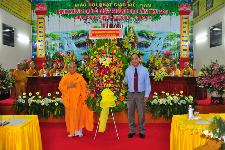 Phát biểu tại buổi lễ, ông Lê Văn Tư – UV thường vụ Huyện uỷ, Chủ tịch UBMTTQVN huyện Đức Hoà đã chúc mừng buổi lễ. Ông đã đánh giá cao tinh thần “đoàn kết, hoà hợp, đồng hành cùng dân tộc” của Phật giáo huyện Đức Hoà trong tất cả hoạt động để xây dựng Giáo hội và sự nghiệp xây dựng, bảo vệ tổ quốc. Chính sự tu hành và phụng sự chúng sinh, tổ quốc làm cho đạo đời hoà hợp, góp phần xây dựng cuộc sống an lạc, hạnh phúc nhân dân.