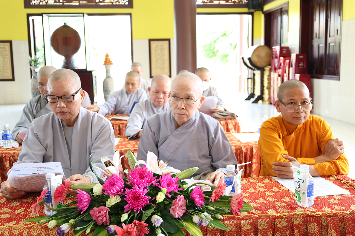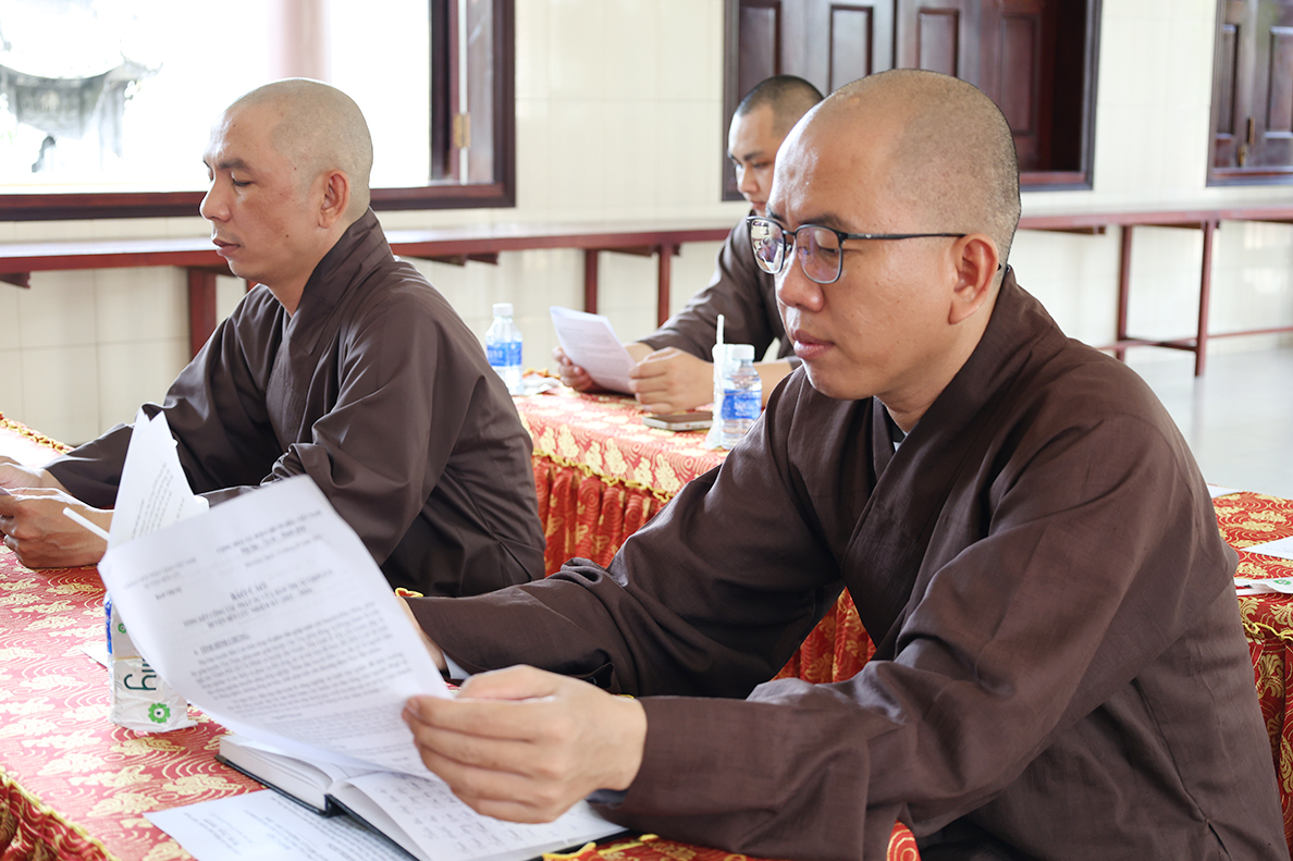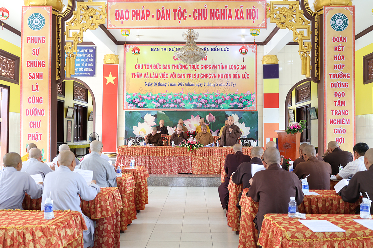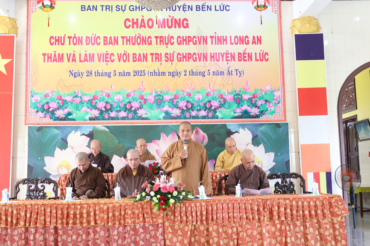 Mở đầu buổi làm việc, thay mặt Ban Thường trực BTS GHPGVN huyện Bến Lức, Thượng tọa Thích An Trung đã trình bày báo cáo khái quát về tình hình Phật sự của Phật giáo huyện trong nhiệm kỳ 2021 – 2026. Theo đó, toàn huyện Bến Lức hiện có 32 tự viện với 56 vị Tăng Ni đang tu học và sinh hoạt. Hằng năm, chư Tăng Ni đều thực hiện an cư kiết hạ theo truyền thống. Trong nhiệm kỳ vừa qua đã tổ chức thành công 02 Lễ bổ nhiệm trụ trì tại chùa Trúc Lâm và chùa Bửu Liên Quang, đồng thời tổ chức 02 Lễ công bố Điểm nhóm sinh hoạt tôn giáo tập trung Thọ Quang và Phước Huệ. Trên địa bàn huyện, các đạo tràng tu học, lớp giáo lý ngày càng phát triển, góp phần nâng cao đời sống tâm linh và đạo đức cho đồng bào Phật tử. Nổi bật nhất là công tác từ thiện xã hội toàn huyện đạt trên 20 tỷ đồng.