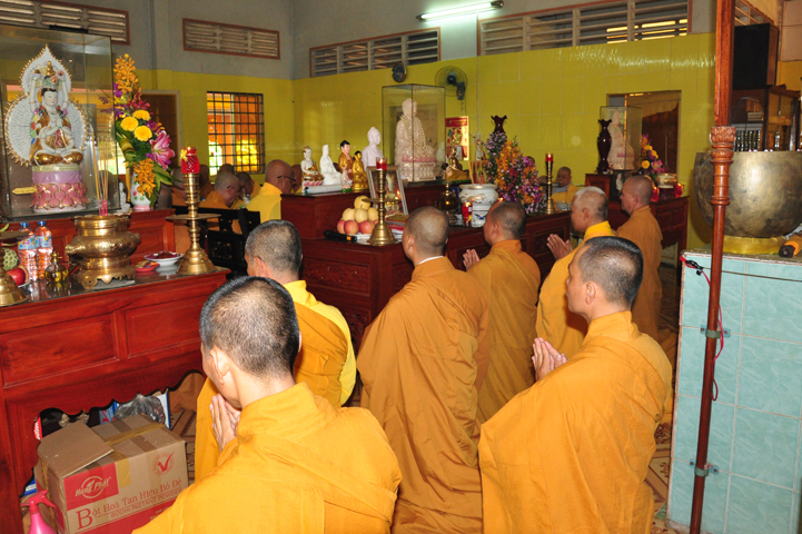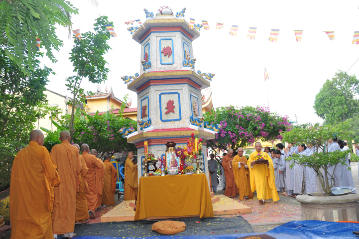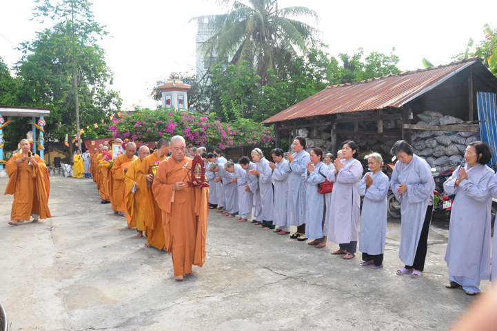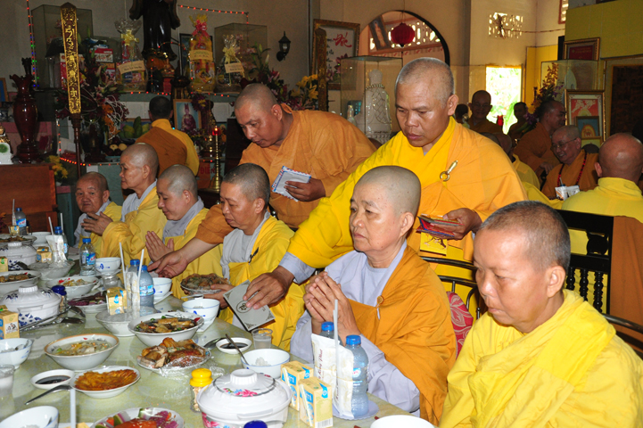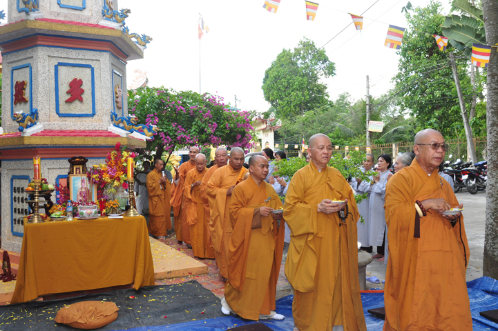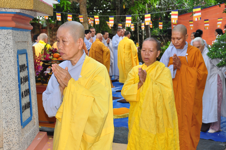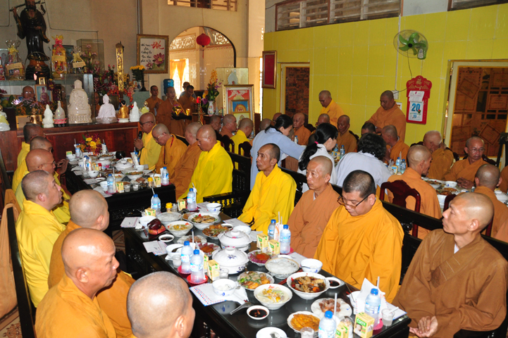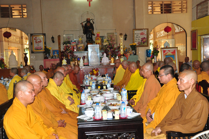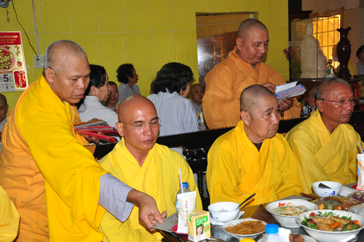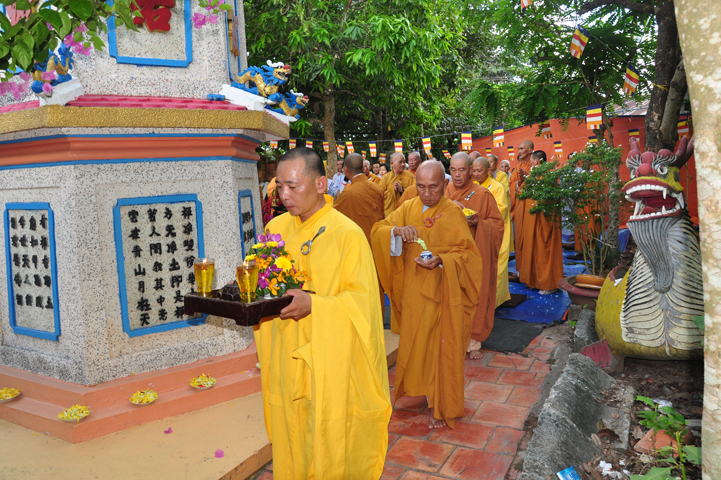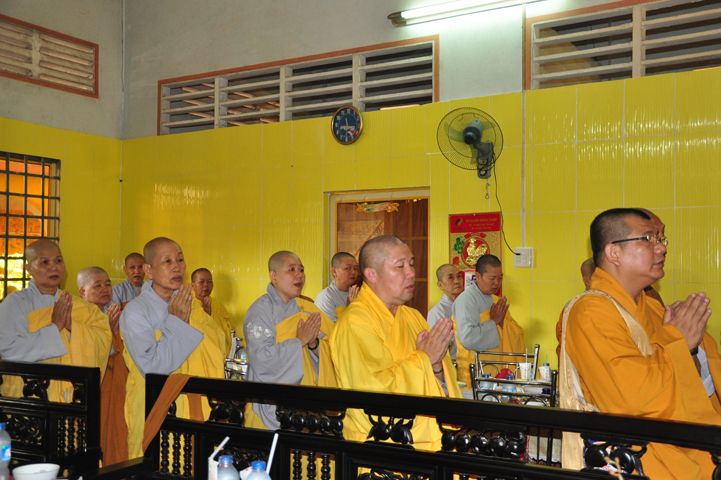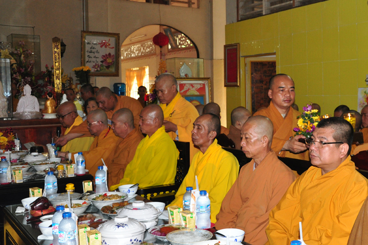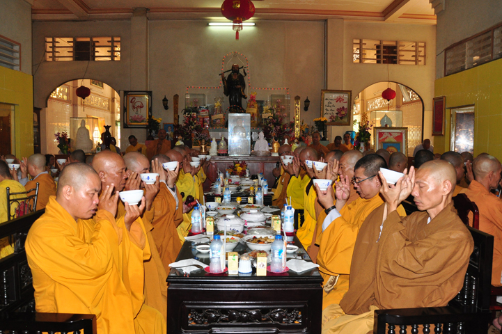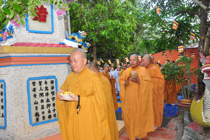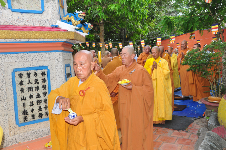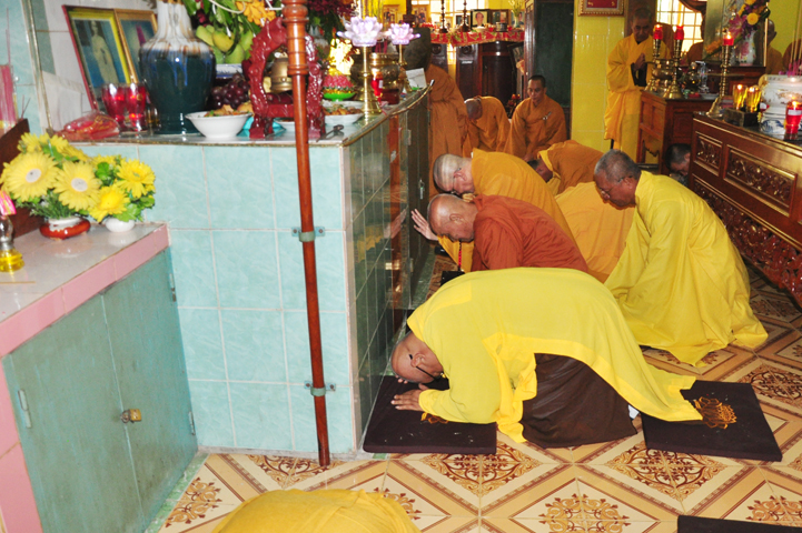 Sau khi nhiễu tháp xong, chư Tôn đức thỉnh linh mô, long vị của Cố Hòa thượng an trí nơi Tổ đường, tiếp đó cung thỉnh chư Tôn đức tiến hành khóa lễ tụng kinh, cúng ngọ và thân mời Phật tử các giới đồng tham dự.