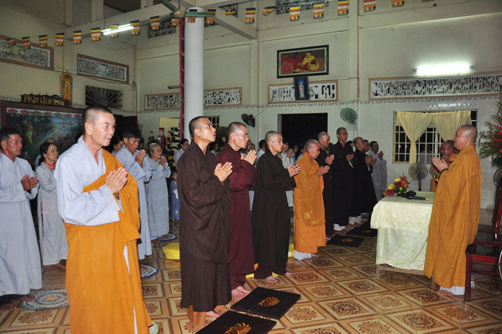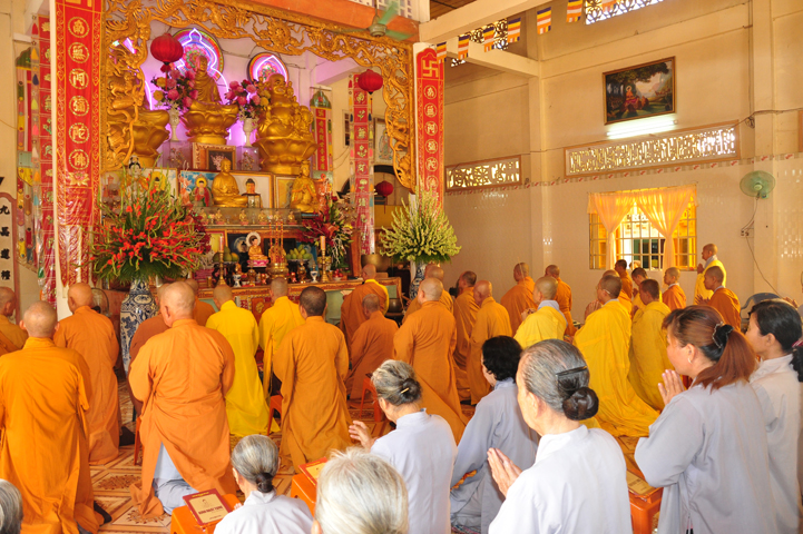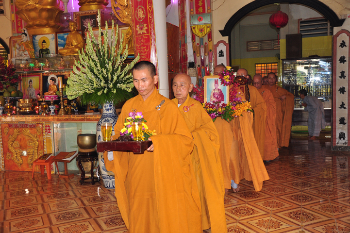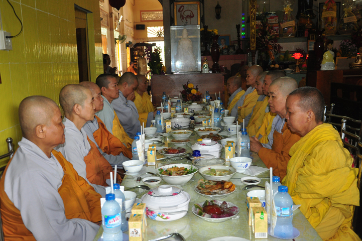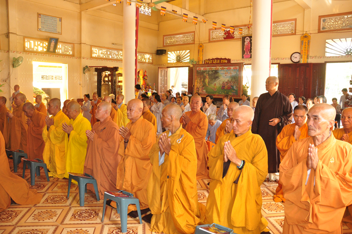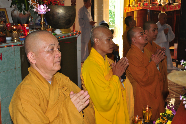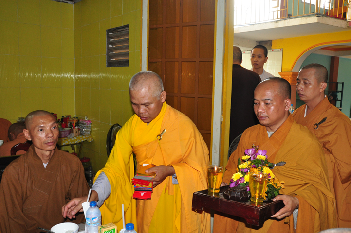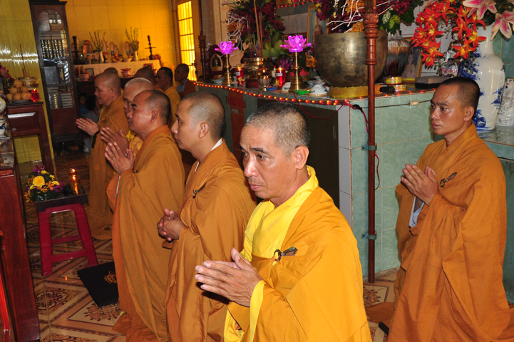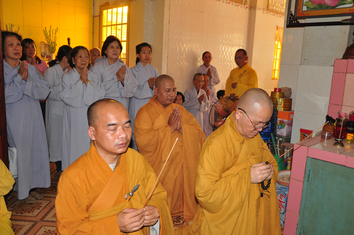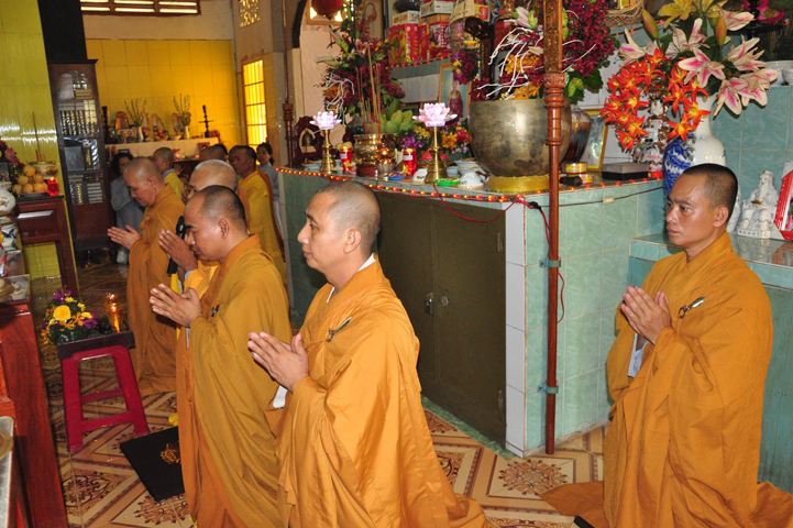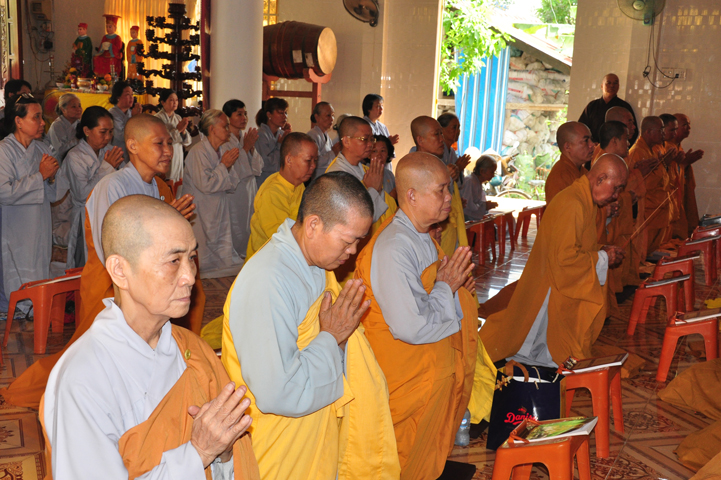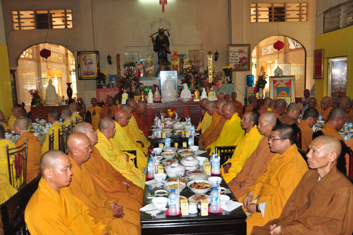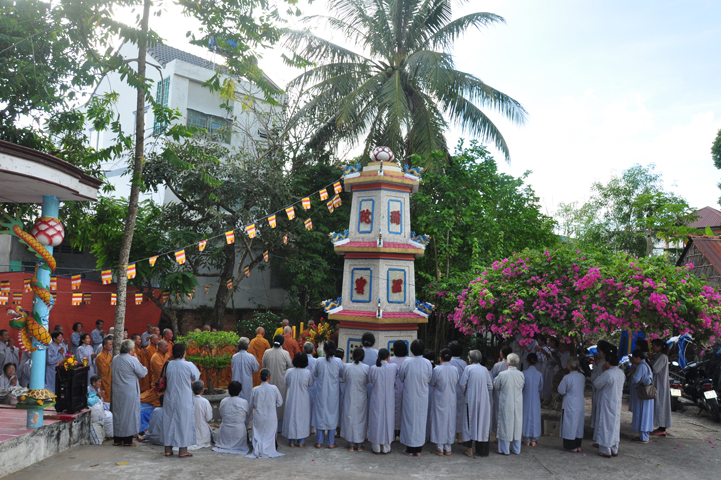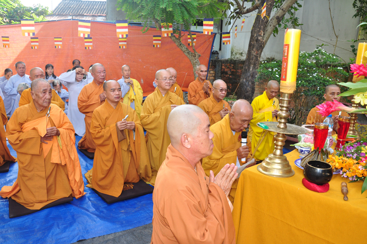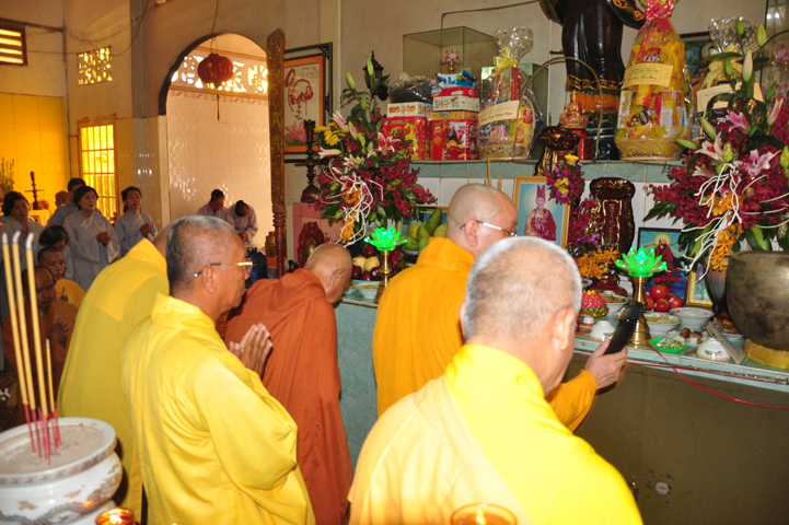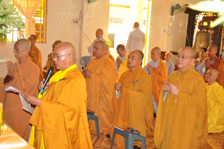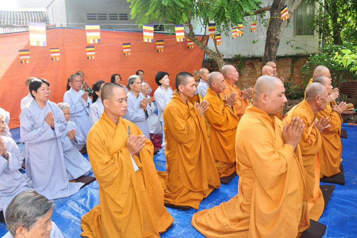 Sau khi nhiễu tháp xong, chư Tôn đức thỉnh linh mô, long vị của Cố Hòa thượng an trí nơi Tổ đường, tiếp đó cung thỉnh chư Tôn đức tiến hành khóa lễ tụng kinh, cúng ngọ và thân mời Phật tử các giới đồng tham dự.