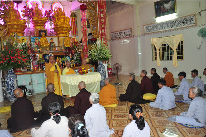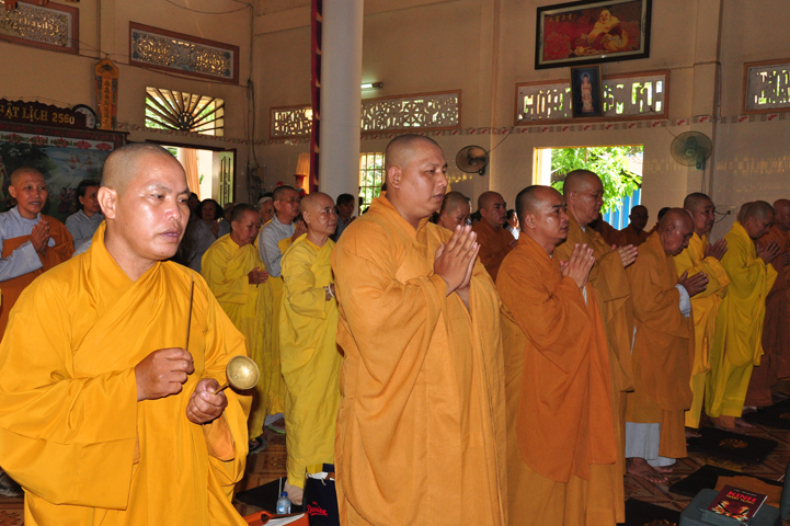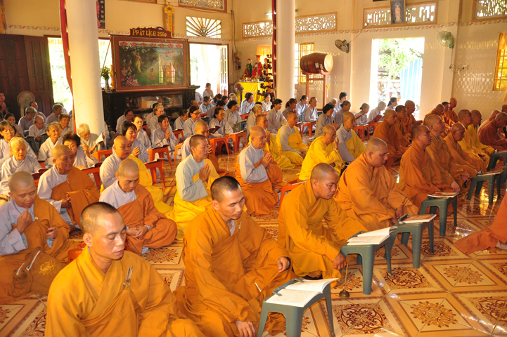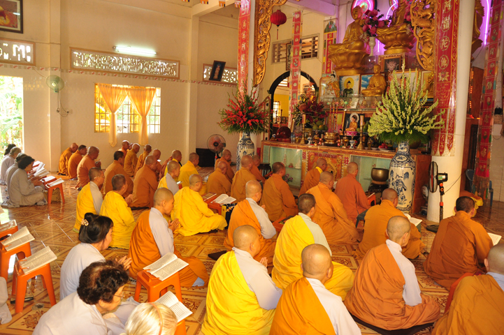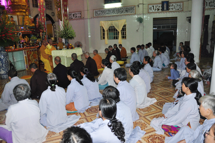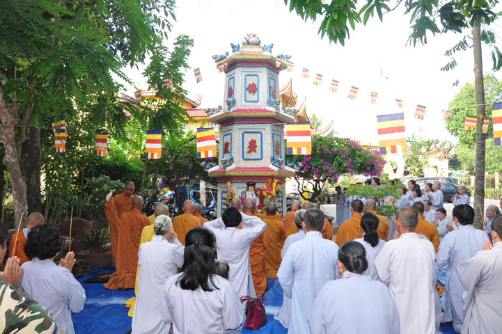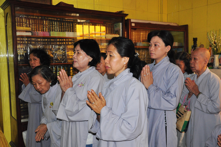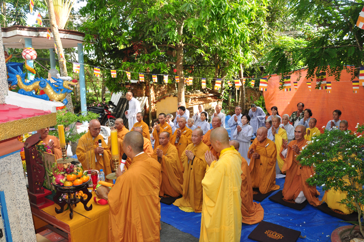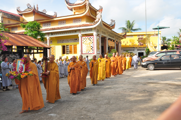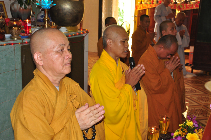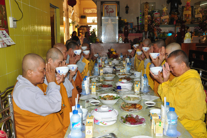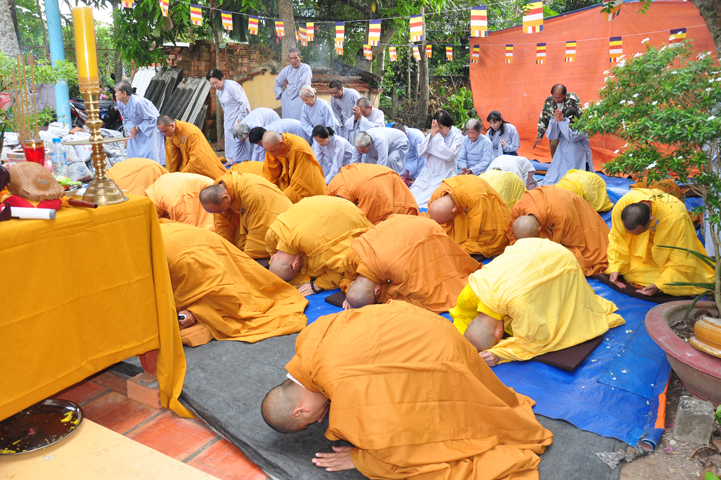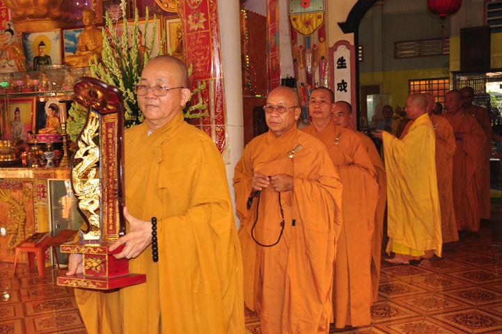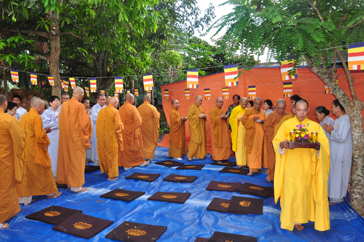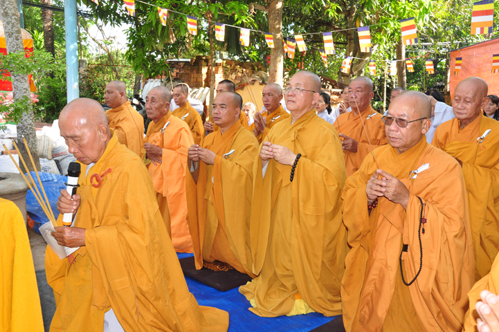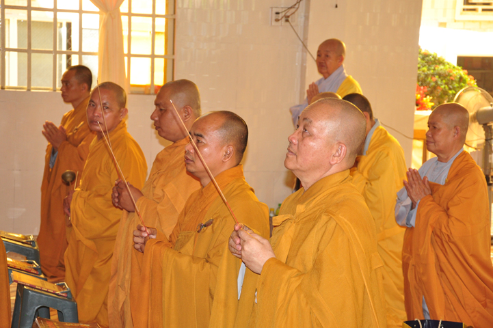 Sau khi nhiễu tháp xong, chư Tôn đức thỉnh linh mô, long vị của Cố Hòa thượng an trí nơi Tổ đường, tiếp đó cung thỉnh chư Tôn đức tiến hành khóa lễ tụng kinh, cúng ngọ và thân mời Phật tử các giới đồng tham dự.