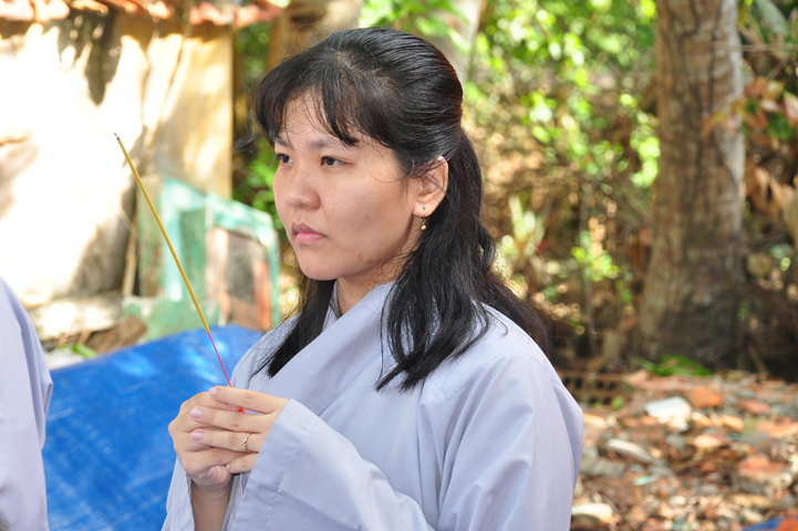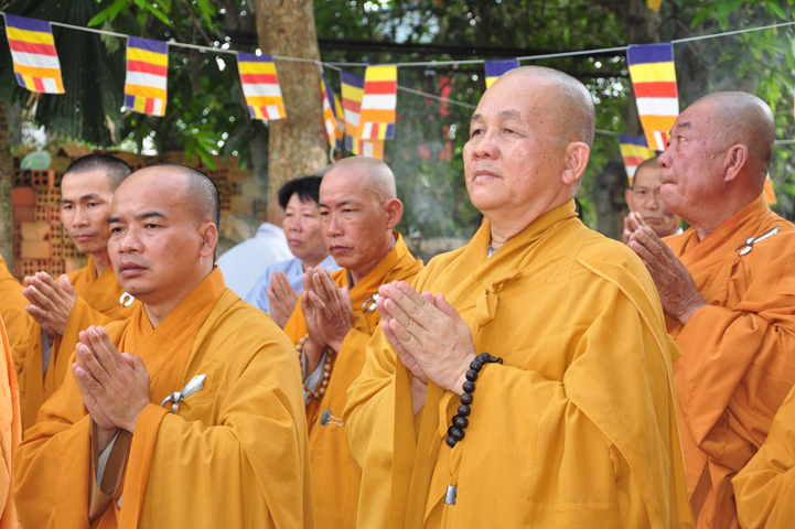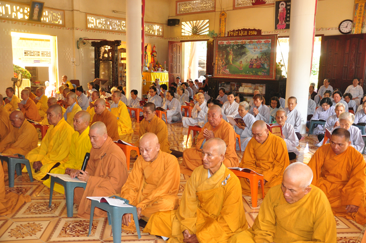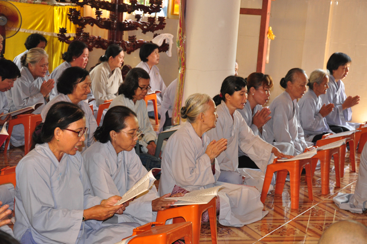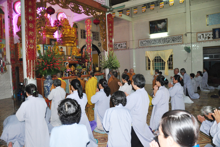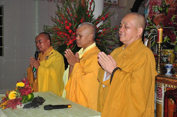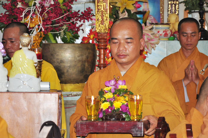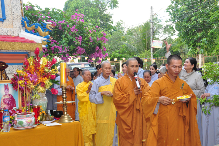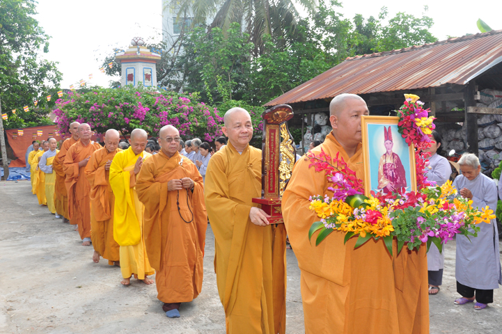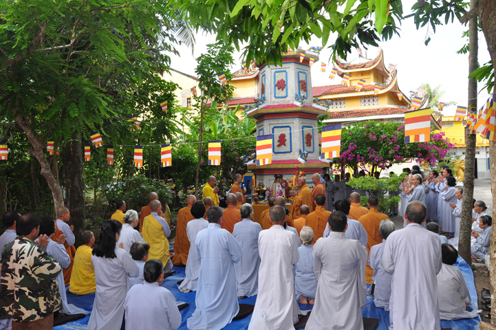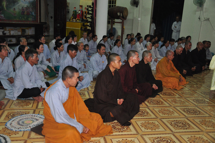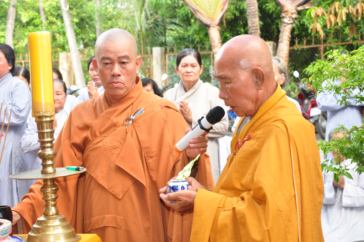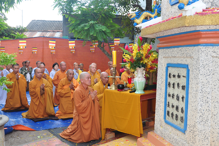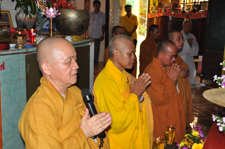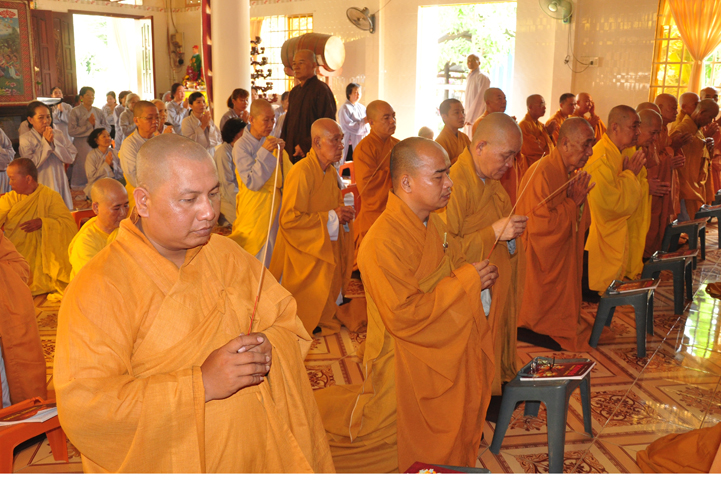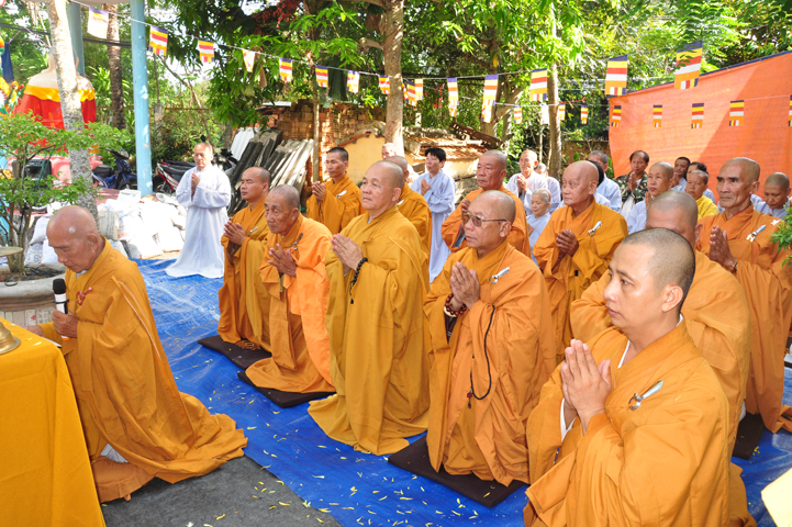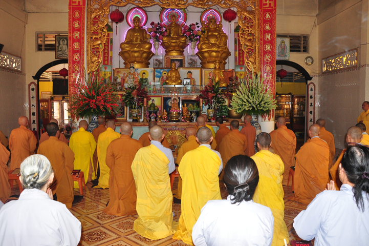 Sau khi nhiễu tháp xong, chư Tôn đức thỉnh linh mô, long vị của Cố Hòa thượng an trí nơi Tổ đường, tiếp đó cung thỉnh chư Tôn đức tiến hành khóa lễ tụng kinh, cúng ngọ và thân mời Phật tử các giới đồng tham dự.