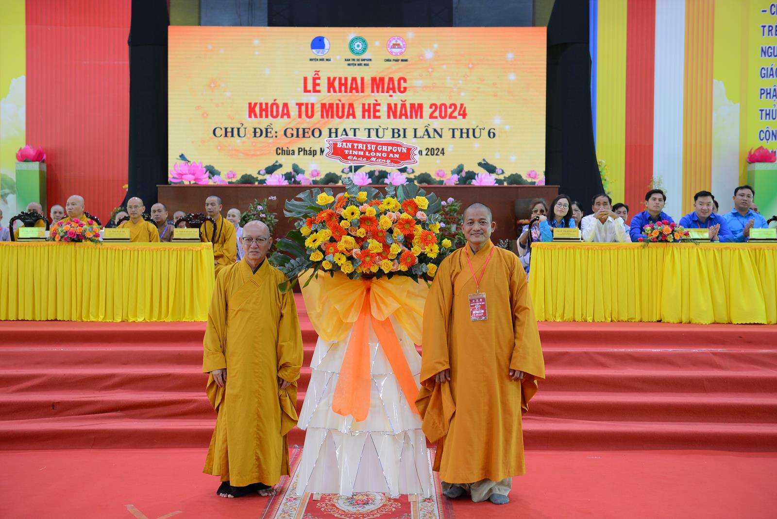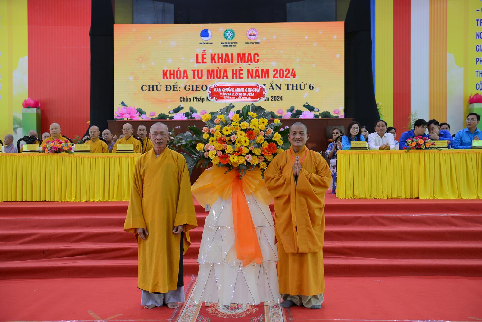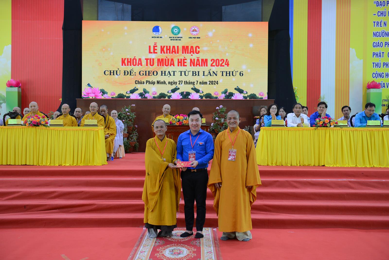 Lễ Khai mạc cung nghinh sự quang lâm chứng minh của: Trưởng lão Hoà thượng Thích Thiện Huệ – Thành viên HĐCM TƯ, Chứng minh BTS GHPGVN tỉnh Long An; HT. Thích Minh Thiện – UV HĐTS, Phó Trưởng Ban Hoằng pháp TƯ, Trưởng BTS GHPGVN tỉnh Long An, Chứng minh BTS GHPGVN huyện Đức Hoà; TT. Thích Quảng Tâm – UV HĐTS, Phó Trưởng Ban Từ thiện Xã hội TƯ, Phó Trưởng ban Thường trực BTS GHPGVN tỉnh Long An; TT. Thích Lệ Trí – Phó Trưởng Ban Văn hoá Trung ương, Phó Trưởng BTS GHPGVN tỉnh Long An; TT. Thích Đức Hoàng – Phó Trưởng BTS GHPGVN tỉnh Long An; ĐĐ. Thích Lệ Duyên – Phó Trưởng ban kiêm Chánh Thư ký BTS GHPGVN tỉnh Long An, Trưởng BTS GHPGVN huyện Đức Hoà, Trưởng Ban Tổ chức Khoá tu; TT. Thích Nhuận Thành – Trưởng Ban Kinh tế Tài chính GHPGVN tỉnh Long An, Phó Trưởng BTS kiêm Trưởng Ban Kinh tế Tài chính GHPGV huyện Đức Hoà; TT. Thích Phước Cường – Trưởng Ban Nghi lễ GHPGVN tỉnh Long An; ĐĐ. Thích An Nhựt – Trưởng Ban Hướng dẫn Phật tử GHPGVN tỉnh Long An; ĐĐ. Thích Thiện Trực – Phó Trưởng Ban Kinh tế Tài chính GHPGVN tỉnh Long An, Phó Trưởng BTS kiêm Trưởng Ban Từ thiện Xã hội GHPGVN huyện Đức Hoà; cùng Chư Tôn đức tăng ni thường trực BTS GHPGVN tỉnh, các huyện, thị xã, thành phố đồng về tham dự.
