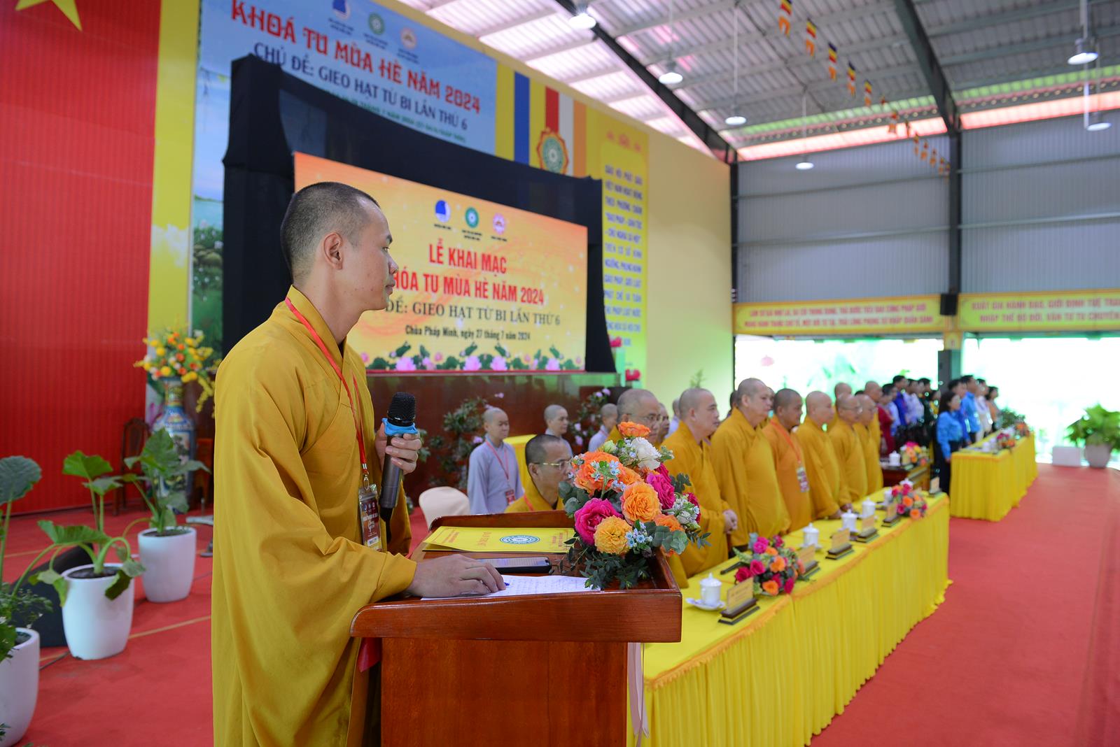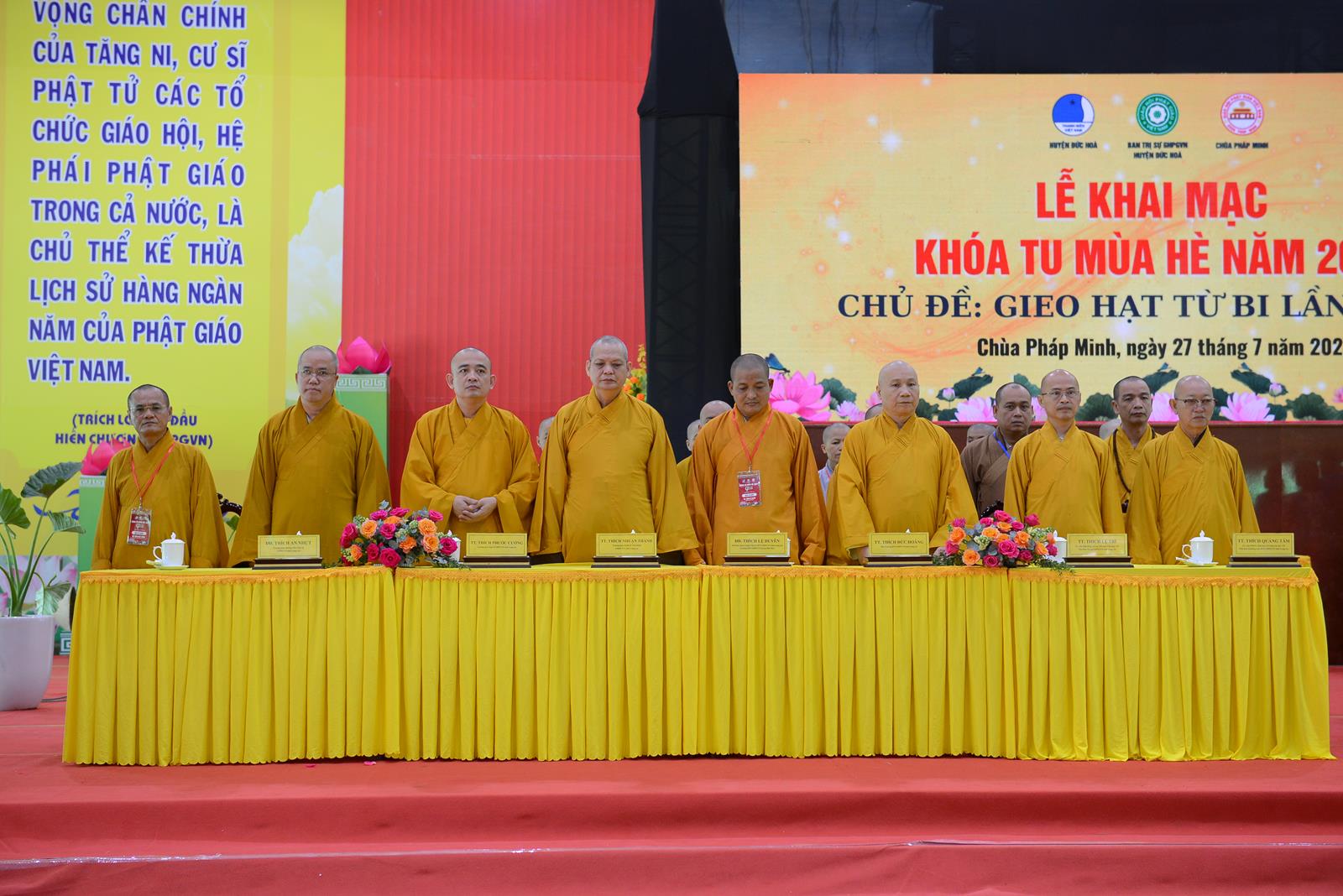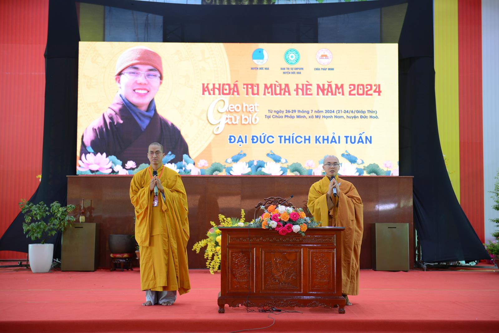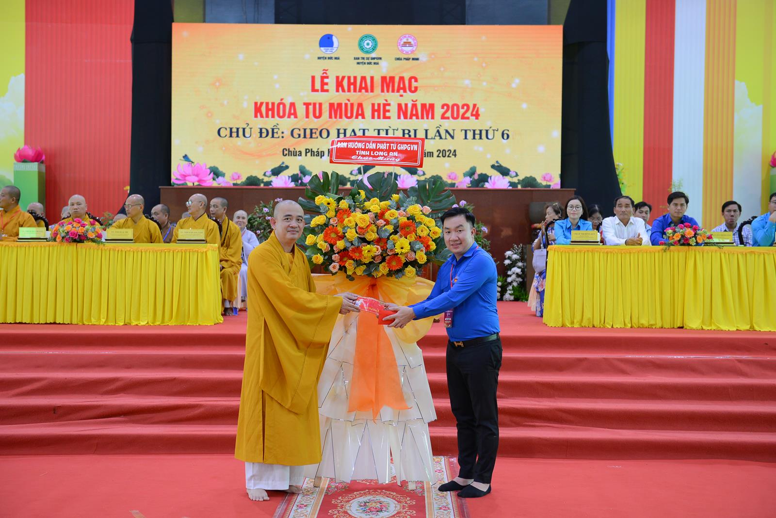 Lễ Khai mạc cung nghinh sự quang lâm chứng minh của: Trưởng lão Hoà thượng Thích Thiện Huệ – Thành viên HĐCM TƯ, Chứng minh BTS GHPGVN tỉnh Long An; HT. Thích Minh Thiện – UV HĐTS, Phó Trưởng Ban Hoằng pháp TƯ, Trưởng BTS GHPGVN tỉnh Long An, Chứng minh BTS GHPGVN huyện Đức Hoà; TT. Thích Quảng Tâm – UV HĐTS, Phó Trưởng Ban Từ thiện Xã hội TƯ, Phó Trưởng ban Thường trực BTS GHPGVN tỉnh Long An; TT. Thích Lệ Trí – Phó Trưởng Ban Văn hoá Trung ương, Phó Trưởng BTS GHPGVN tỉnh Long An; TT. Thích Đức Hoàng – Phó Trưởng BTS GHPGVN tỉnh Long An; ĐĐ. Thích Lệ Duyên – Phó Trưởng ban kiêm Chánh Thư ký BTS GHPGVN tỉnh Long An, Trưởng BTS GHPGVN huyện Đức Hoà, Trưởng Ban Tổ chức Khoá tu; TT. Thích Nhuận Thành – Trưởng Ban Kinh tế Tài chính GHPGVN tỉnh Long An, Phó Trưởng BTS kiêm Trưởng Ban Kinh tế Tài chính GHPGV huyện Đức Hoà; TT. Thích Phước Cường – Trưởng Ban Nghi lễ GHPGVN tỉnh Long An; ĐĐ. Thích An Nhựt – Trưởng Ban Hướng dẫn Phật tử GHPGVN tỉnh Long An; ĐĐ. Thích Thiện Trực – Phó Trưởng Ban Kinh tế Tài chính GHPGVN tỉnh Long An, Phó Trưởng BTS kiêm Trưởng Ban Từ thiện Xã hội GHPGVN huyện Đức Hoà; cùng Chư Tôn đức tăng ni thường trực BTS GHPGVN tỉnh, các huyện, thị xã, thành phố đồng về tham dự.
