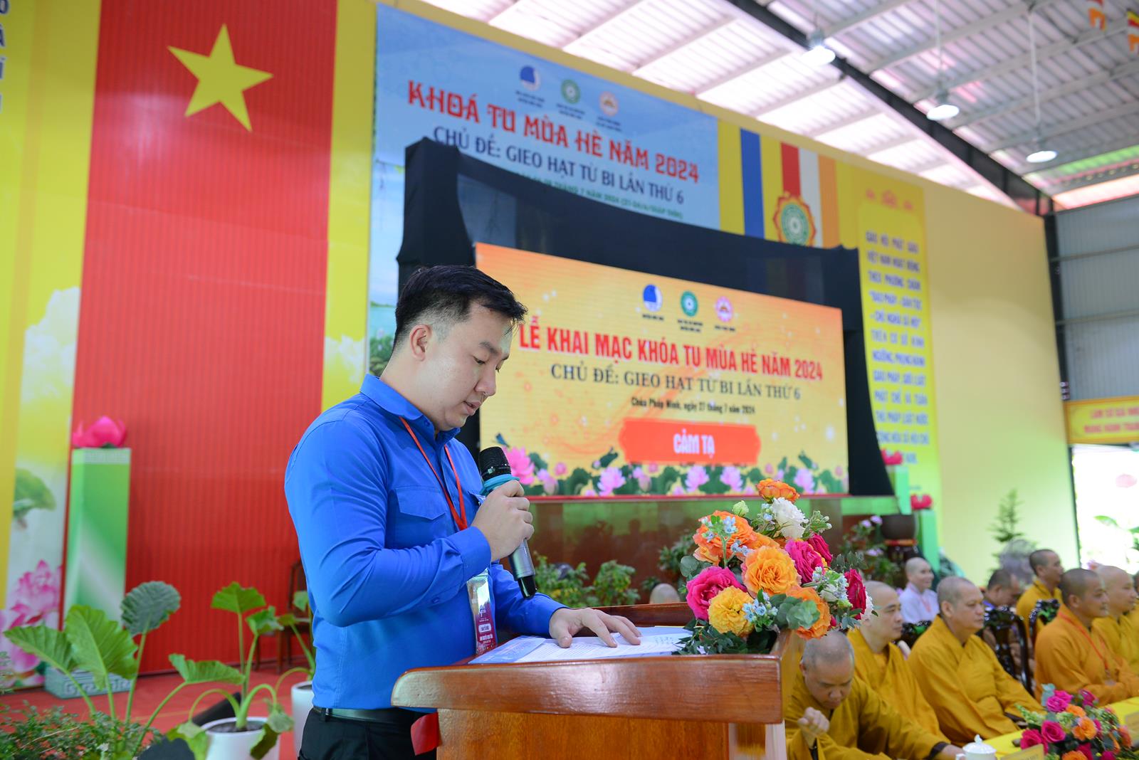 Ông Nguyễn Minh Tâm – Đồng Trưởng BTC Khoá tu có lời phát biểu cảm tạ. Ông gửi lời tri ân đến Chư Tôn đức, quý mạnh thường quân, nhà hảo tâm, quý Phật tử đã trợ duyên để Khoá tu năm nay được tổ chức đáp ứng nguyện vọng và mong đợi của quý phụ huynh và khoá sinh. Ông hy vọng các cấp Đảng uỷ, chính quyền địa phương, chùa Pháp Minh cùng Tăng Ni Phật tử vẫn sẽ tiếp tục đồng hành với Huyện Đoàn – Hội LHTN Việt Nam huyện tổ chức các hoạt động định hướng, chia sẻ cũng như các khoá tu tiếp theo để giúp các bạn ĐVTN, học sinh, sinh viên trau dồi đạo đức, nhân cách, giữ gìn văn hoá tốt đẹp của dân tộc.