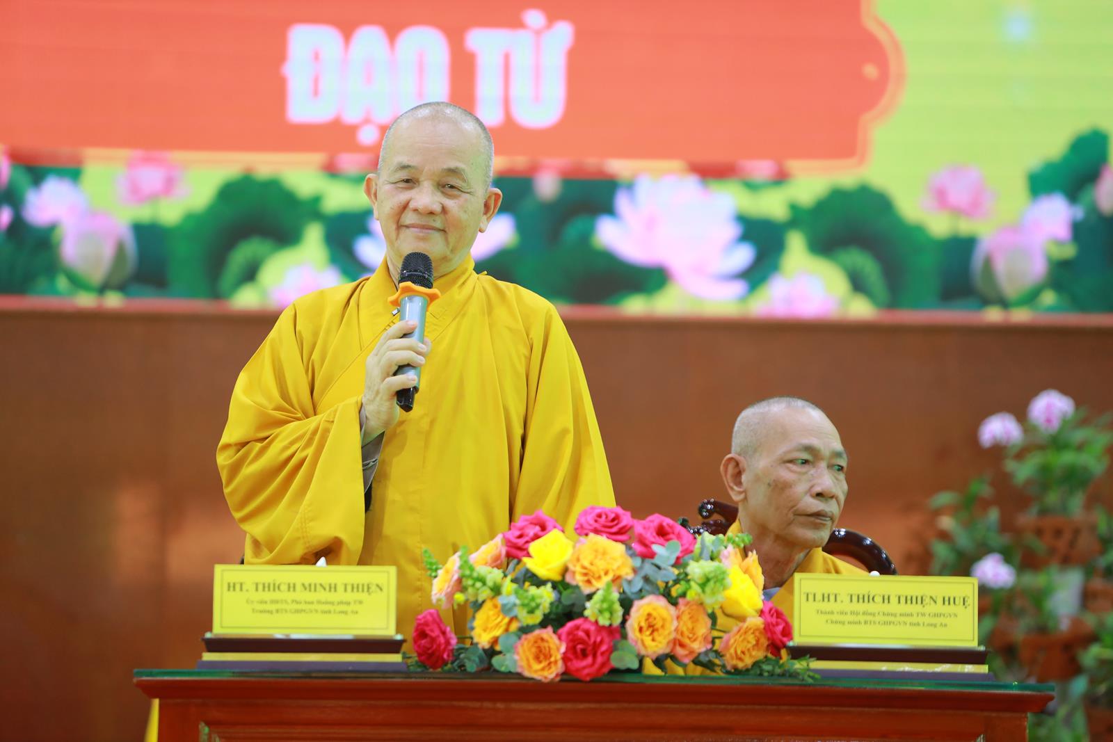 Đãi lao Chư Tôn đức chứng minh, HT. Thích Minh Thiện có lời đạo từ đến các em khoá sinh. Lời đầu tiên, Hoà thượng đã nhắc về công ơn của những vị anh hùng liệt sĩ có công với đất nước và ngài Nguyễn Phú Trọng – Tổng Bí thư Ban Chấp hành Trung ương Đảng Cộng sản Việt Nam, đồng thời nhắc nhở các em khoá sinh bảy tò lòng biết ơn đối với những người có công với lịch sử dân tộc. Hoà thượng hy vọng các khoá sinh sẽ chấp hành nội quy khoá tu, phát huy hết tinh thần học hỏi, trưởng dưỡng yêu thương và từ bi để trở thành người con người con hiếu thảo, người công dân tốt của đất nước. sau cùng, Hoà thượng gửi lời chúc sức khoẻ và an vui đến toàn thể khoá sinh hiện diện.