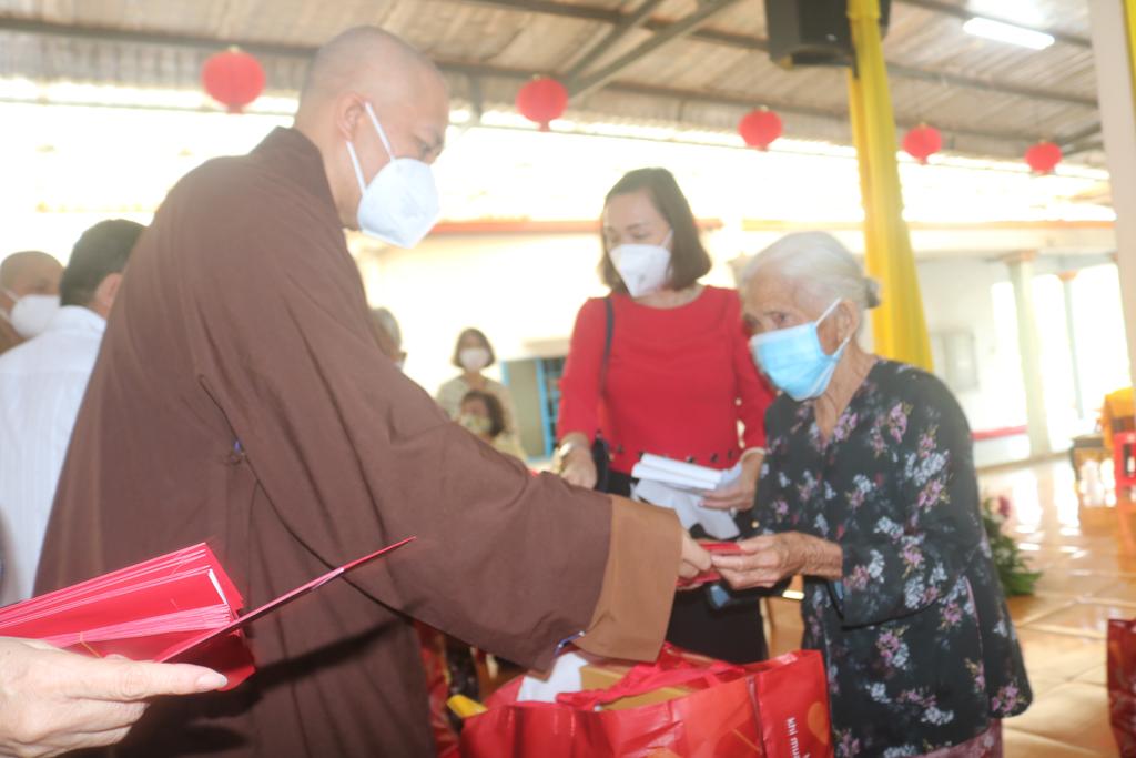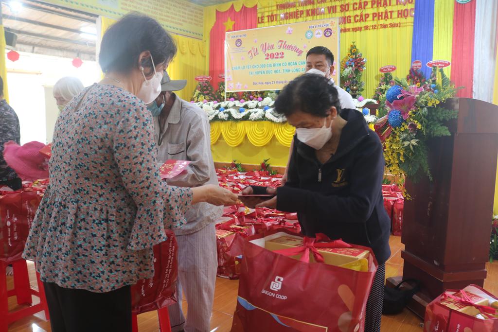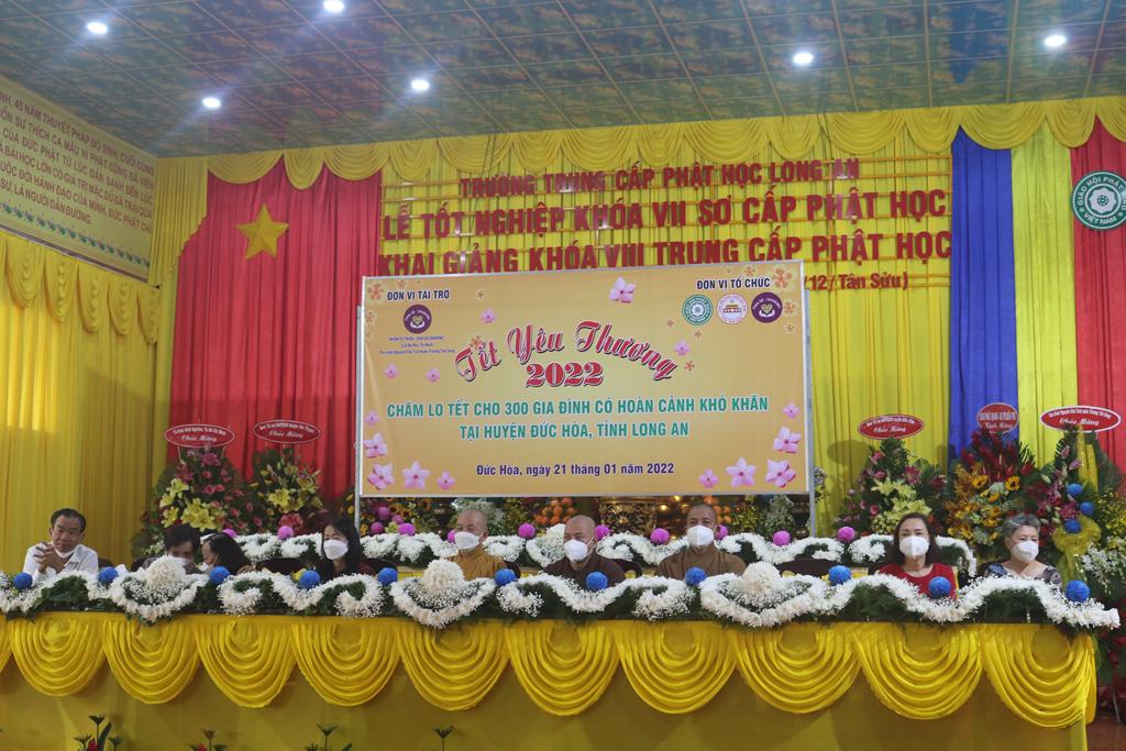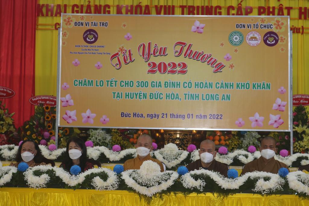 Tham dự lễ trao quà có Hòa thượng Thích Minh Thiện, Ủy viên Hội đồng Trị sự, Phó Trưởng ban Hoằng pháp TƯ, Trưởng ban Trị sự GHPGVN tỉnh Long An; Đại đức Thích Quảng Lâm, Ủy viên Hội đồng Trị sự, Chủ nhiệm Lớp Sơ cấp Phật học Long An; Đại đức Thích Lệ Duyên, Chánh Thư ký BTS GHPGVN tỉnh Long An, Trưởng ban Trị sự GHPGVN huyện Đức Hòa, đồng Chủ nhiệm Lớp SCPHLA và đại diện nhóm Từ thiện “Chia sẻ-Sharing” của Bà Mai Thị Hạnh, Phu nhân Nguyên Chủ tịch nước Trương Tấn Sang, gia đình cô Trương Minh Tuyết…