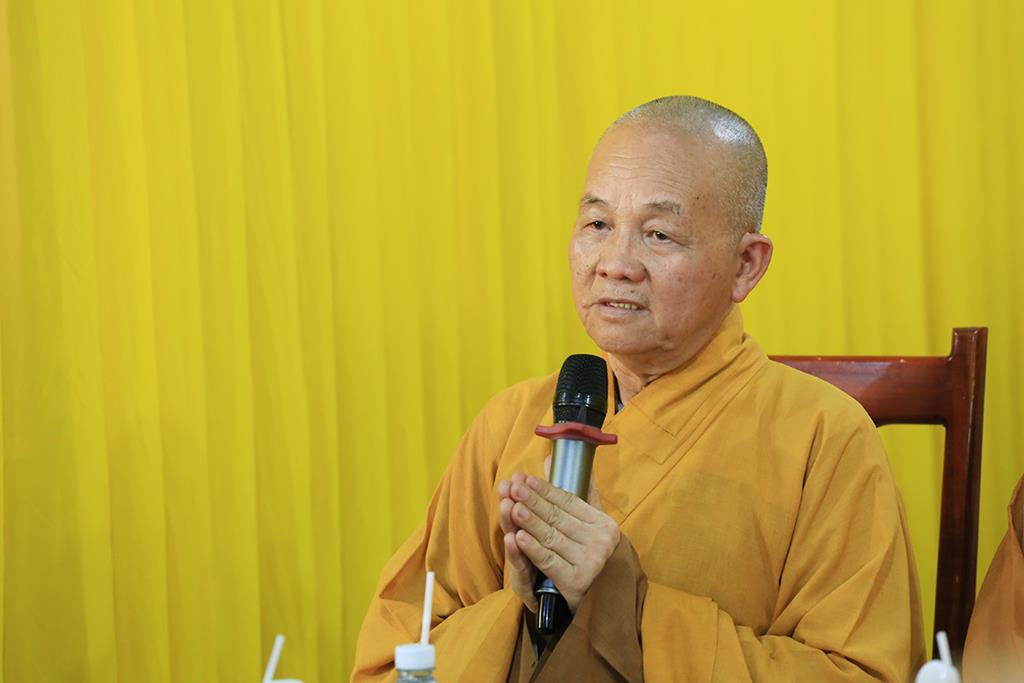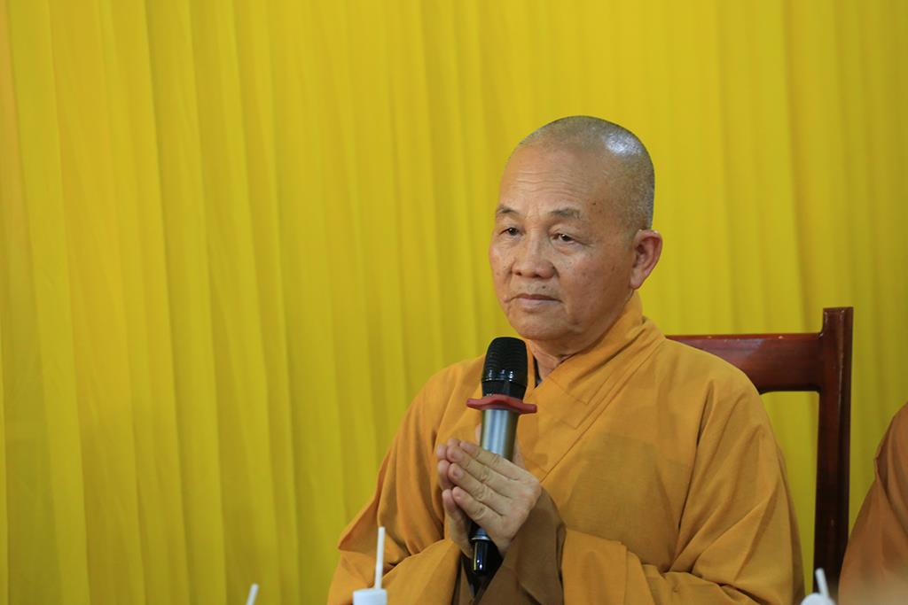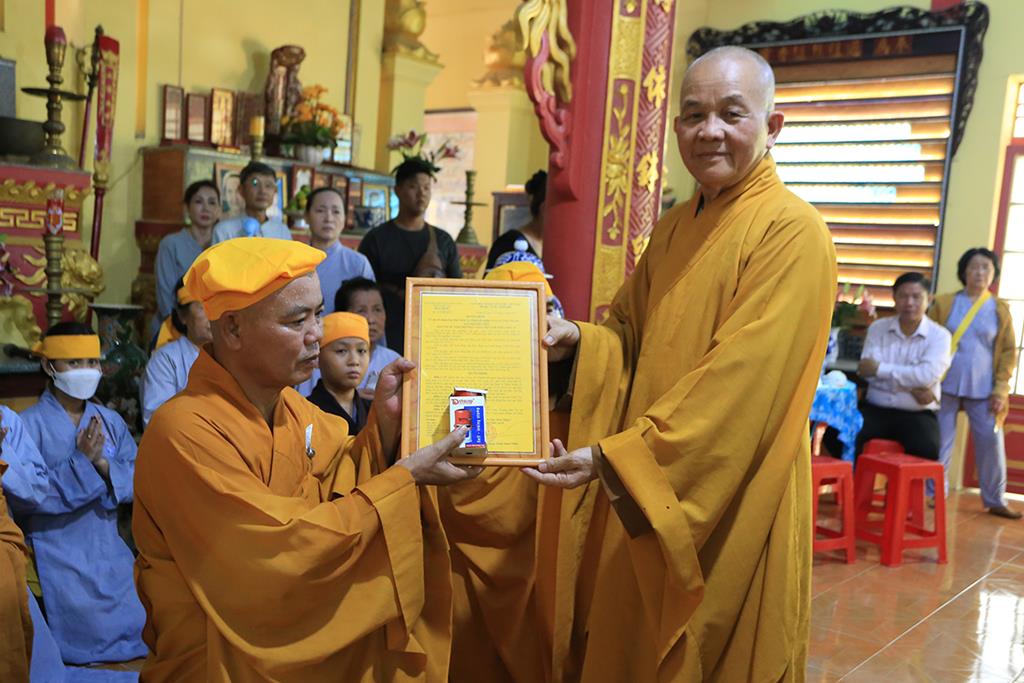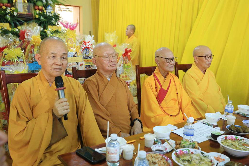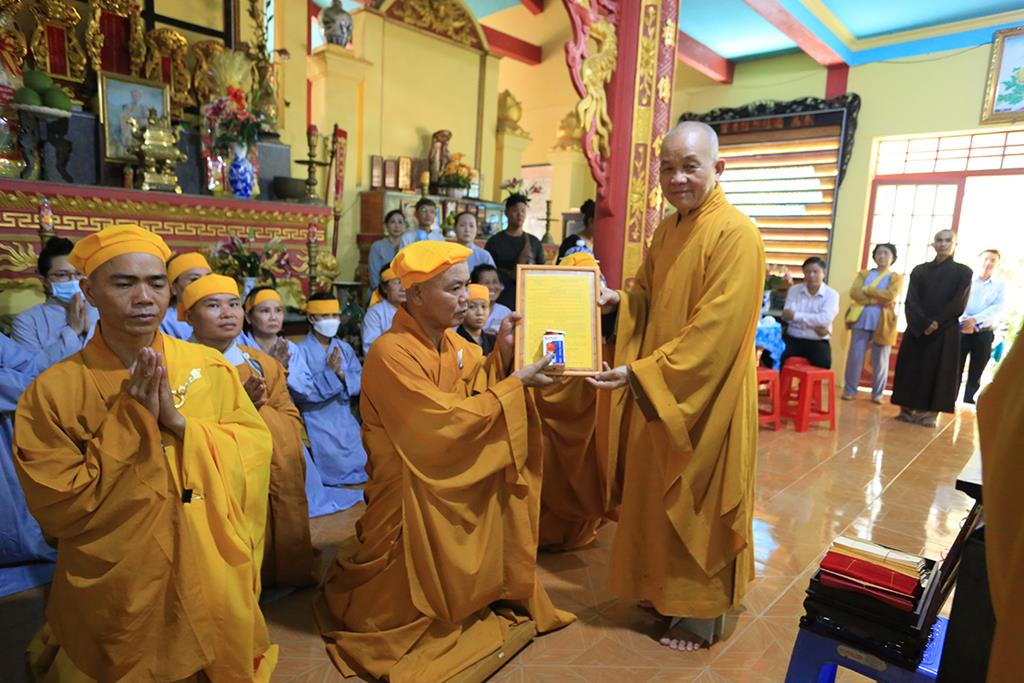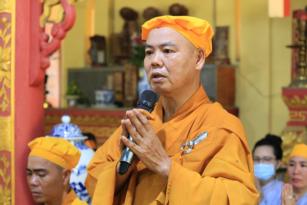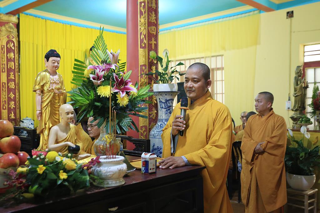 Thay mặt cho Chư Tôn đức chứng minh, Chư Tôn đức lãnh đạo, Chư Tôn đức Tăng Ni hiện tiền, Hòa thượng Thích Minh Thiện đã ban lời đạo từ cho buổi lễ. Trước nhất, Hòa thượng có lời tán thán đạo tâm, đạo hạnh, hiếu tâm, hiếu hạnh của môn đồ pháp quyến. Hòa thượng nhắc nhở đến môn đồ pháp quyến và Đại đức Tân Trụ trì hãy luôn nhớ rằng: “Dép cỏ lối về còn in dấu; Hoa đàm tuy rụng vẫn lưu hương”, tuy Thầy không còn hiện hữu nhưng lời Thầy vẫn luôn bên ta. Hòa thượng mong mỏi, Chư Tôn đức BTS GHPGVN huyện Đức Hòa, Chư Tôn đức Sơn môn và chính quyền các cấp tạo những điều kiện tốt nhất để giúp Đại đức hoàn thành trách nhiệm của mình. Cuối lời, Hòa thượng cung thỉnh đại chúng niệm Phật chứng minh.