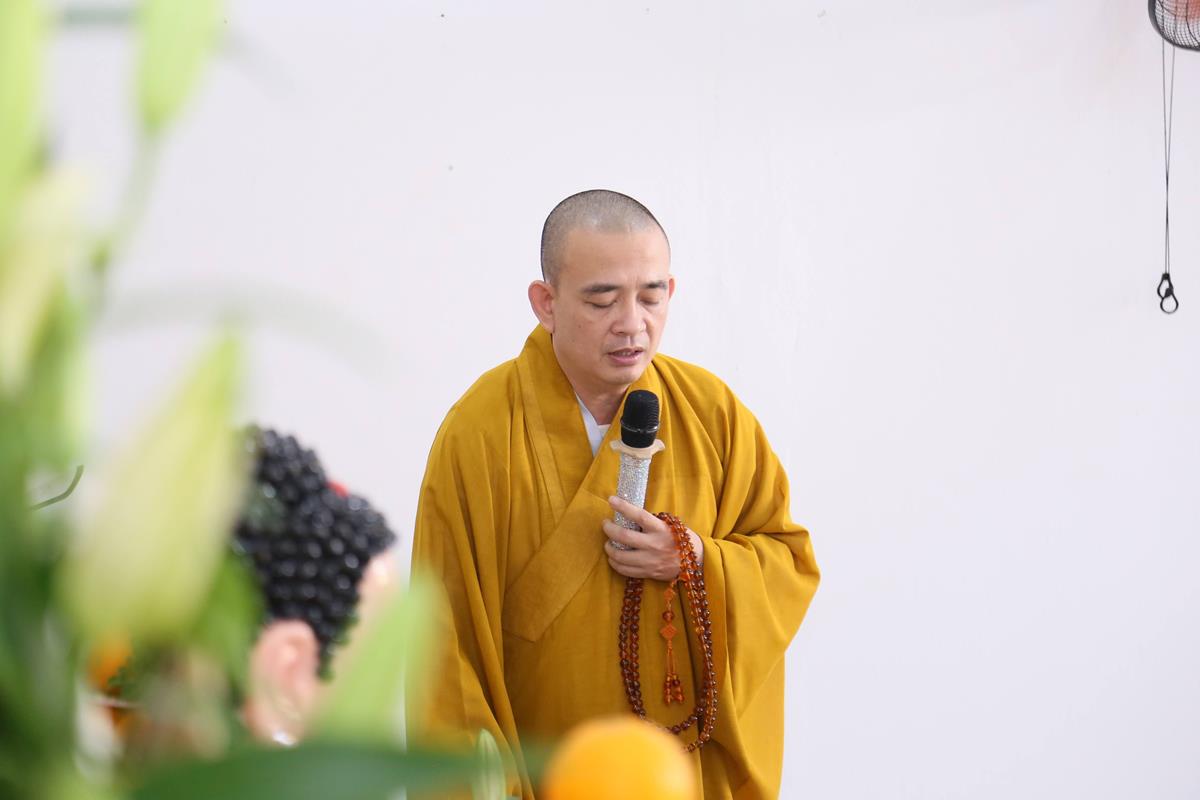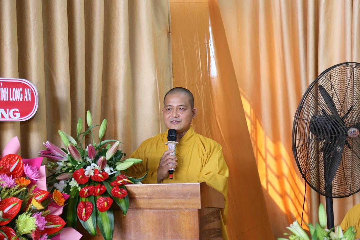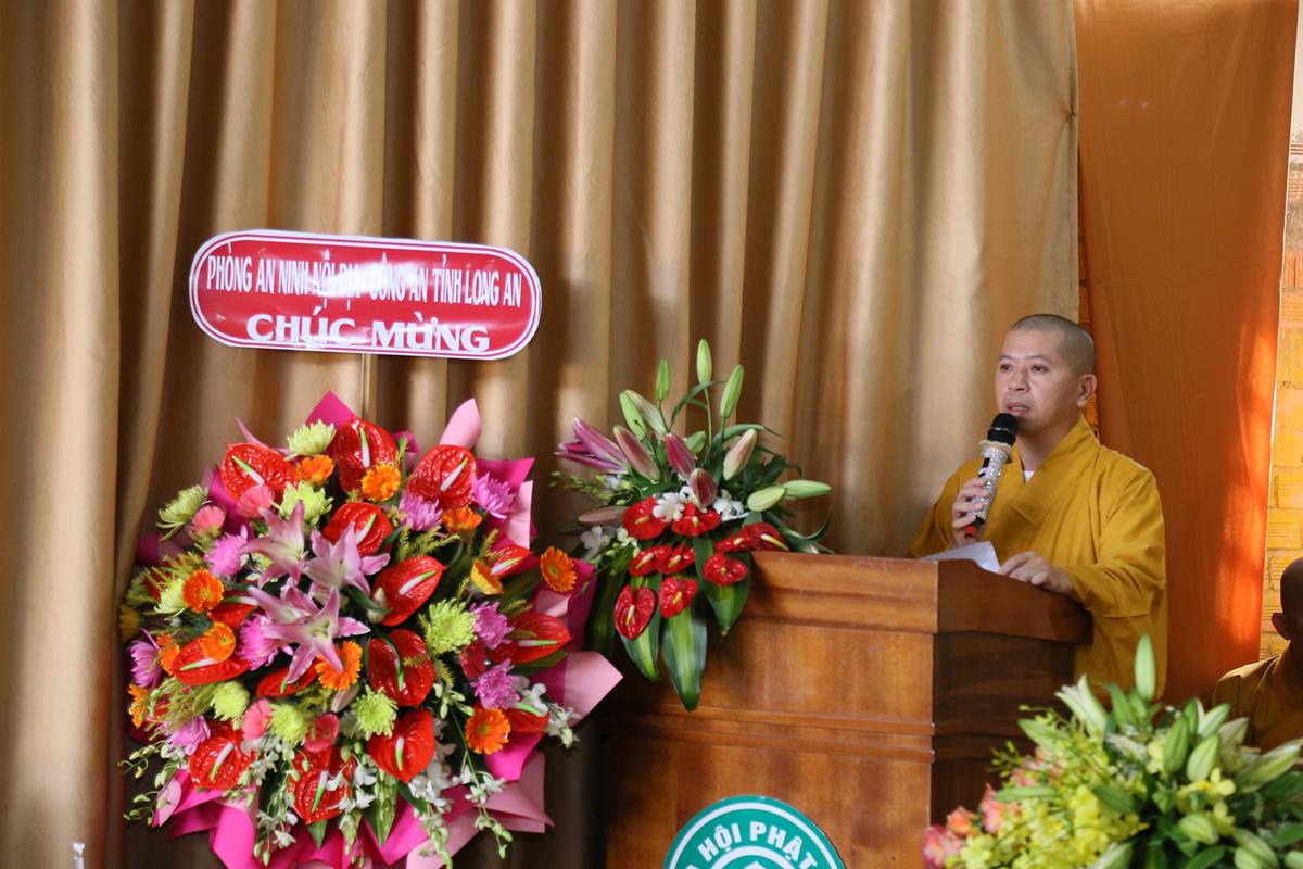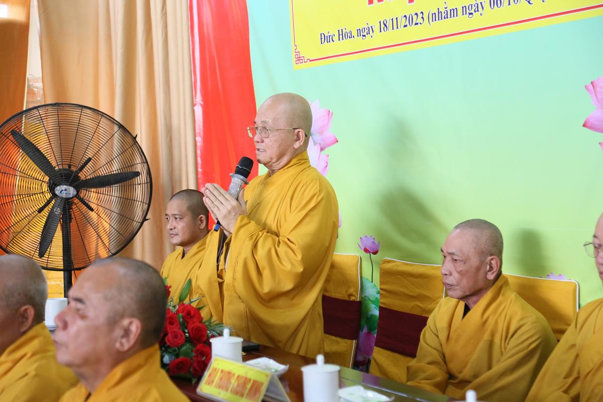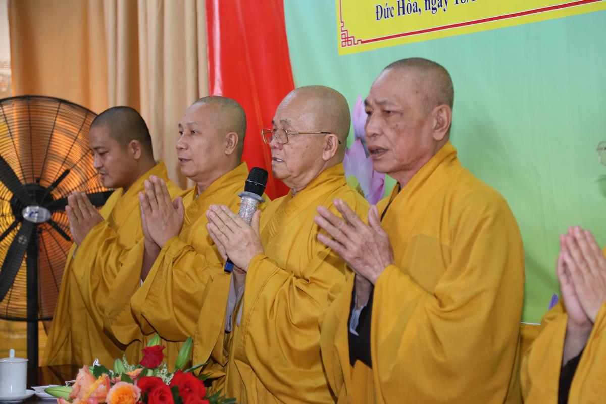 Thay mặt Thường trực BTS GHPGVN huyện Đức Hòa, Đại đức Thích Minh Trí – Chánh Thư ký kiêm Trưởng ban Pháp chế GHPGVN huyện Đức Hòa có lời cảm tạ, sau đó cung thỉnh chư Tôn đức chứng minh quang lâm cổng tam quan thực hiện nghi thức thượng bảng, nghi thức An vị Phật và sái tịnh đạo tràng.