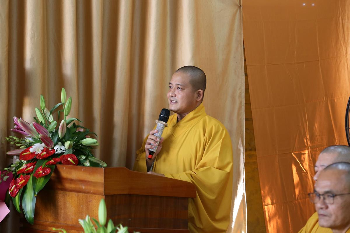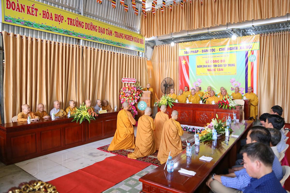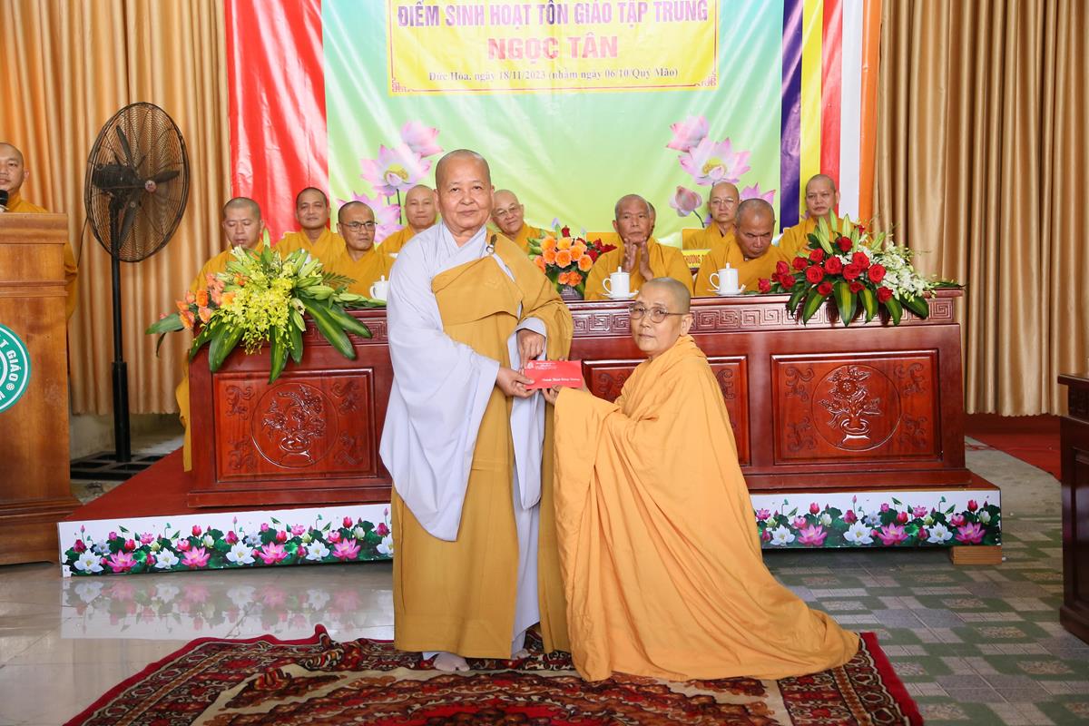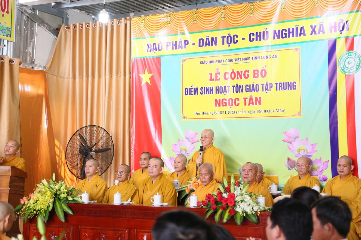Đãi lao chư tôn Hòa thượng chứng minh, Hòa thượng Thích Minh Thiện – UV HĐTS, Phó ban Hoằng pháp TƯ, Trưởng ban Trị sự GHPGVN tỉnh Long An có lời đạo từ tại buổi lễ. Hòa thượng nhắc lại lời thơ của Ni trưởng Huỳnh Liên “Nghiêng vai gánh đạo vào đời, Cho đời tỏ đạo ta người đồng tu”, tinh thần Phật giáo Việt Nam luôn đồng hành cùng dân tộc theo tôn chỉ lấy từ bi, trí tuệ để hoằng dương chánh pháp. Đức Phật đã tuyên thuyết Tứ Diệu Đế, đây là cốt lõi của người học Phật, nhất là người tu sĩ cần lan tỏa giáo lý này. Hòa thượng nhắc đôi điều có liên quan về Luật Tín ngưỡng Tôn giáo, Hiến chương GHPGVN. Đặc biệt, Hòa thượng nhắc nhở BTS GHPGVN huyện Đức Hòa tạo điều kiện để Ni giới tại Đạo tràng Ngọc Tân được sinh hoạt các khóa lễ biệt truyền được Hiến chương Giáo hội đã quy định. Hòa thượng hướng dẫn Sư cô đại diện và Ni chúng tại Đạo tràng Ngọc Tân các vấn đề lliên quan. Hòa thượng mong muốn Sư cô, Phật tử tại Đạo tràng tiếp tục đồng hành cùng địa phương trong công tác an sinh xã hội. Sau cùng, Hòa thượng có những lời chúc tốt đẹp và kết thúc lời đạo từ.