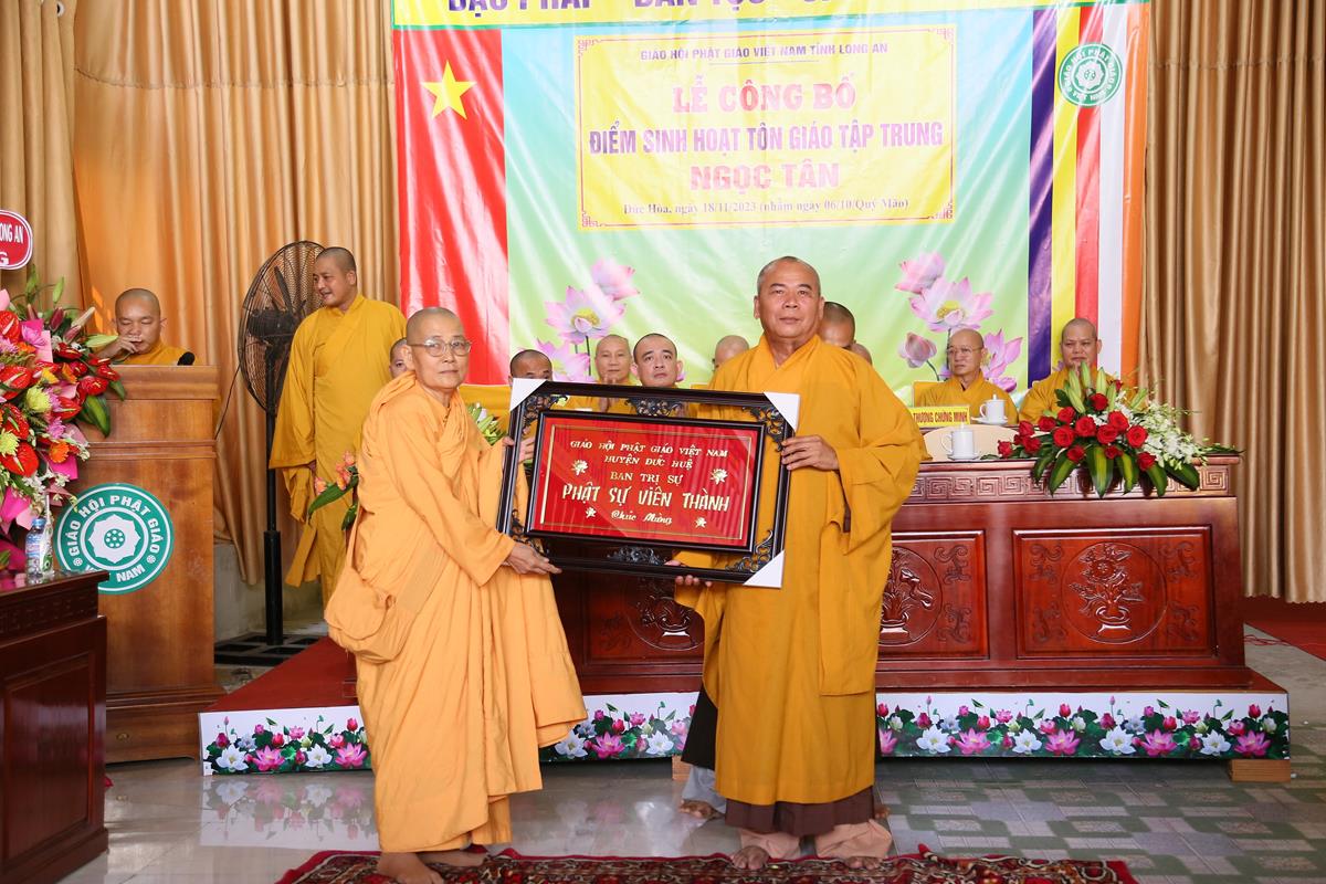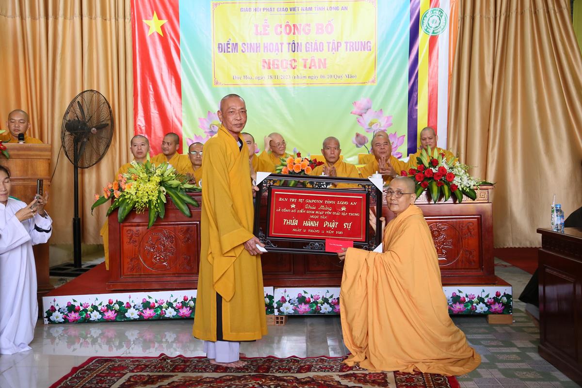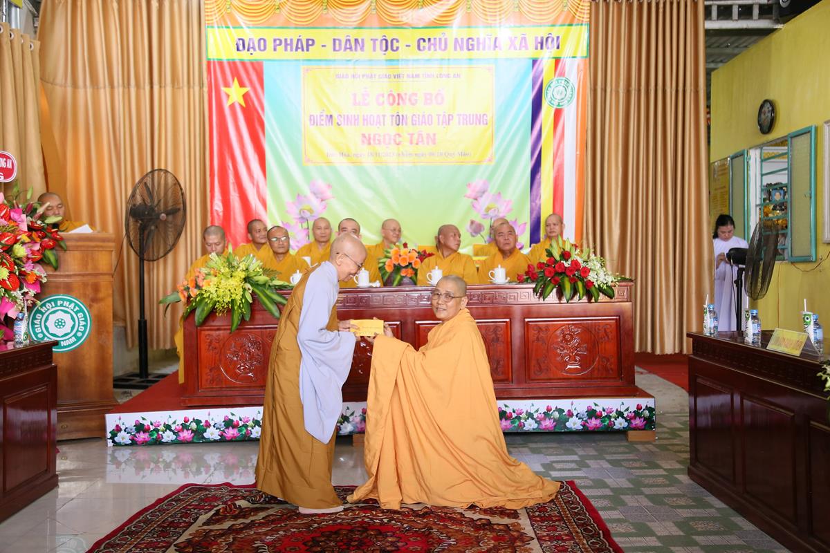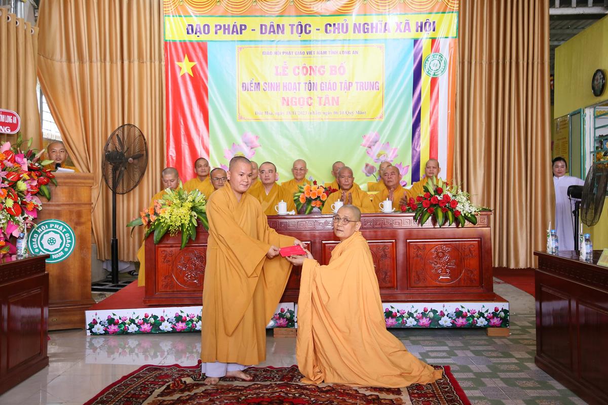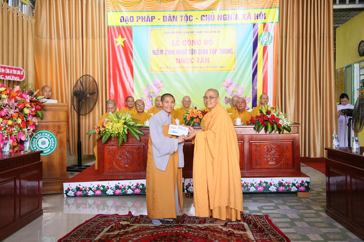 Được sự cho phép cho của chư Tôn đức Thường trực Ban Trị sự GHPGVN tỉnh Long An, Đại đức Thích Lệ Duyên – Phó ban kiêm Chánh Thư ký Ban Trị sự GHPGVN tỉnh Long An, Trưởng ban Trị sự GHPGVN huyện Đức Hòa thông qua giấy chứng nhận đăng ký sinh hoạt tôn giáo tập trung Ngọc Tân theo quyết định số 690/GCN-UBND do Chủ tịch UBND xã Hòa Khánh Tây – ông Hồ Trường Ca ấn ký ngày 27/9/2023. Điểm nhóm sinh hoạt tôn giáo tập trung Ngọc Tân thuộc tổ chức tôn giáo Ban Trị sự GHPGVN tỉnh Long An với người đại diện là Sư cô Thích Nữ Hương Liên (thế danh Hồ Kim Phụng), sinh năm 1972, hộ khẩu thường trú: tổ 3, ấp Tân Bình, xã Hoà Khánh Tây, huyện Đức Hoà, tỉnh Long An. Số lượng đăng ký tham gia sinh hoạt là 100 người. Thời hạn đăng ký sinh hoạt là 36 tháng kể từ ngày ký giấy chứng nhận.