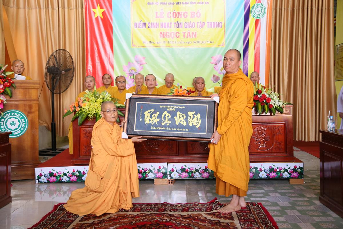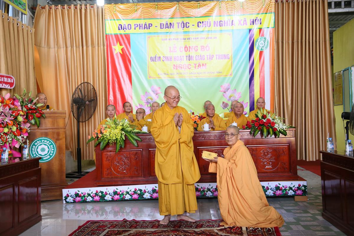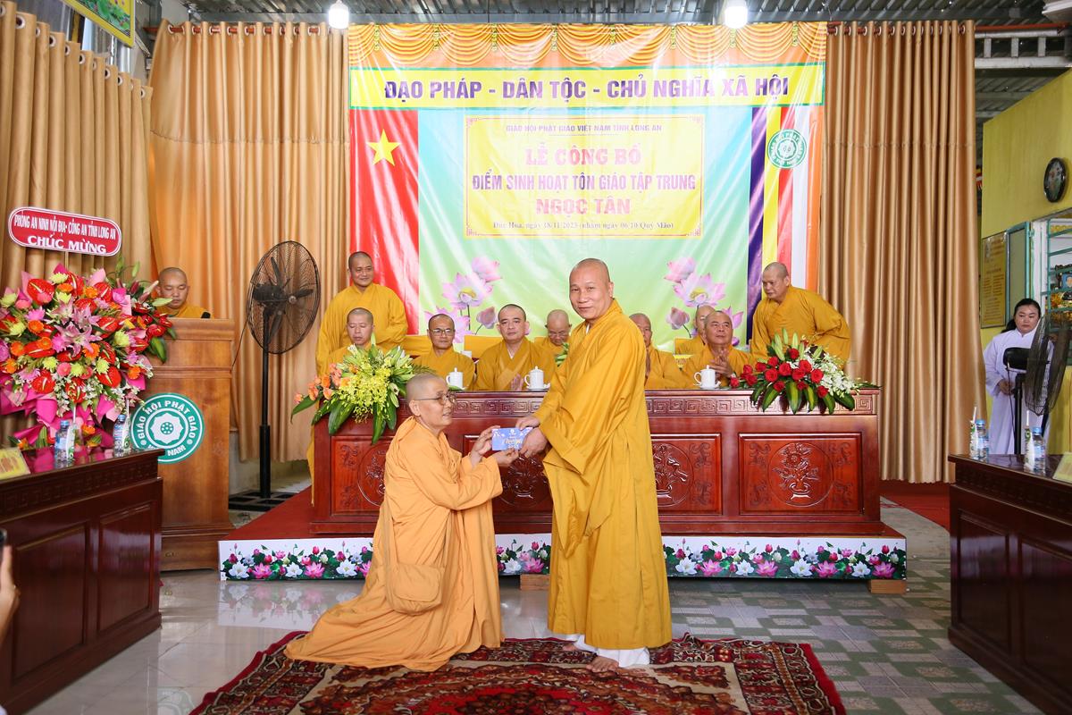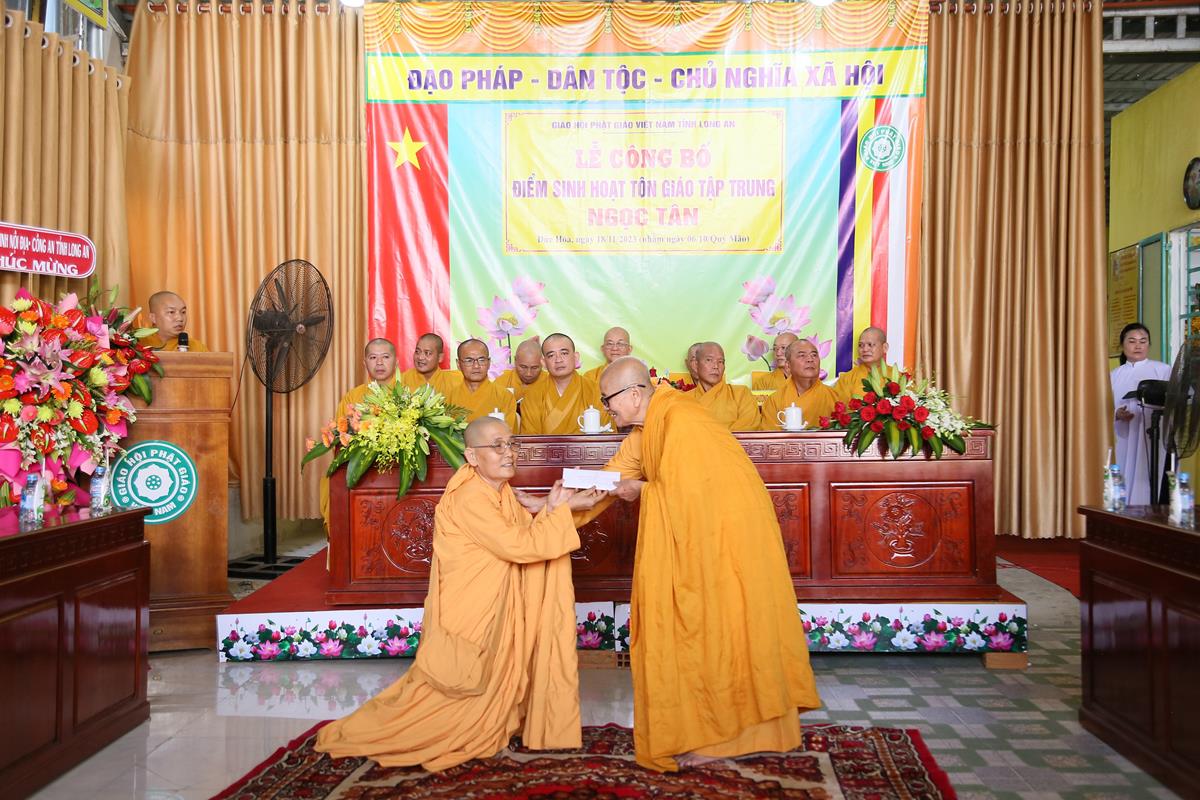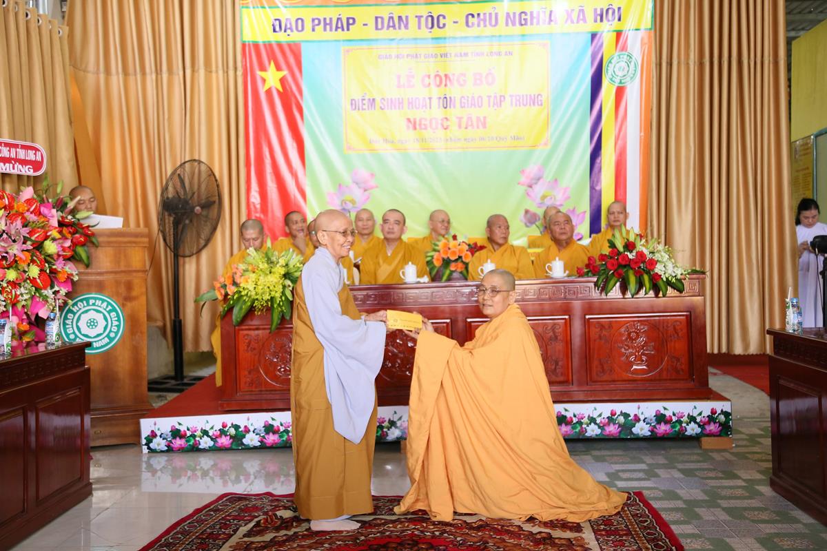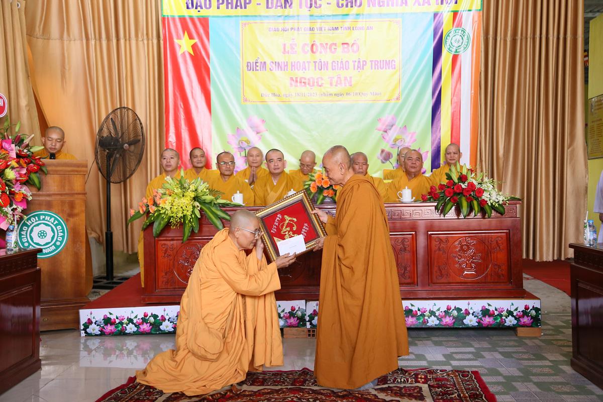 Được sự cho phép cho của chư Tôn đức Thường trực Ban Trị sự GHPGVN tỉnh Long An, Đại đức Thích Lệ Duyên – Phó ban kiêm Chánh Thư ký Ban Trị sự GHPGVN tỉnh Long An, Trưởng ban Trị sự GHPGVN huyện Đức Hòa thông qua giấy chứng nhận đăng ký sinh hoạt tôn giáo tập trung Ngọc Tân theo quyết định số 690/GCN-UBND do Chủ tịch UBND xã Hòa Khánh Tây – ông Hồ Trường Ca ấn ký ngày 27/9/2023. Điểm nhóm sinh hoạt tôn giáo tập trung Ngọc Tân thuộc tổ chức tôn giáo Ban Trị sự GHPGVN tỉnh Long An với người đại diện là Sư cô Thích Nữ Hương Liên (thế danh Hồ Kim Phụng), sinh năm 1972, hộ khẩu thường trú: tổ 3, ấp Tân Bình, xã Hoà Khánh Tây, huyện Đức Hoà, tỉnh Long An. Số lượng đăng ký tham gia sinh hoạt là 100 người. Thời hạn đăng ký sinh hoạt là 36 tháng kể từ ngày ký giấy chứng nhận.