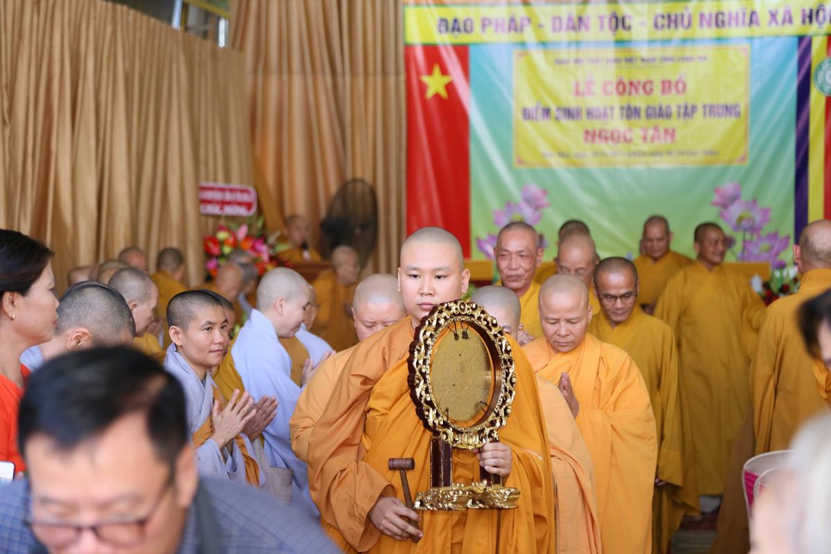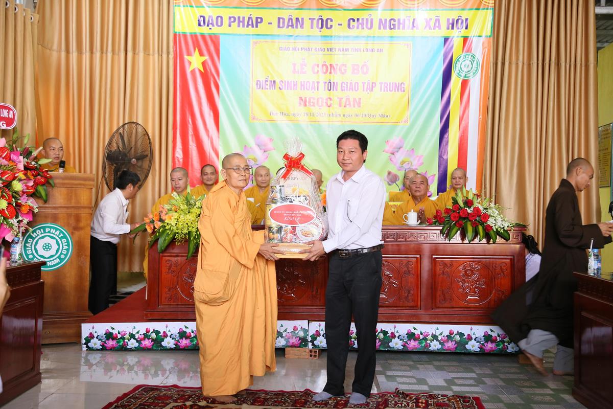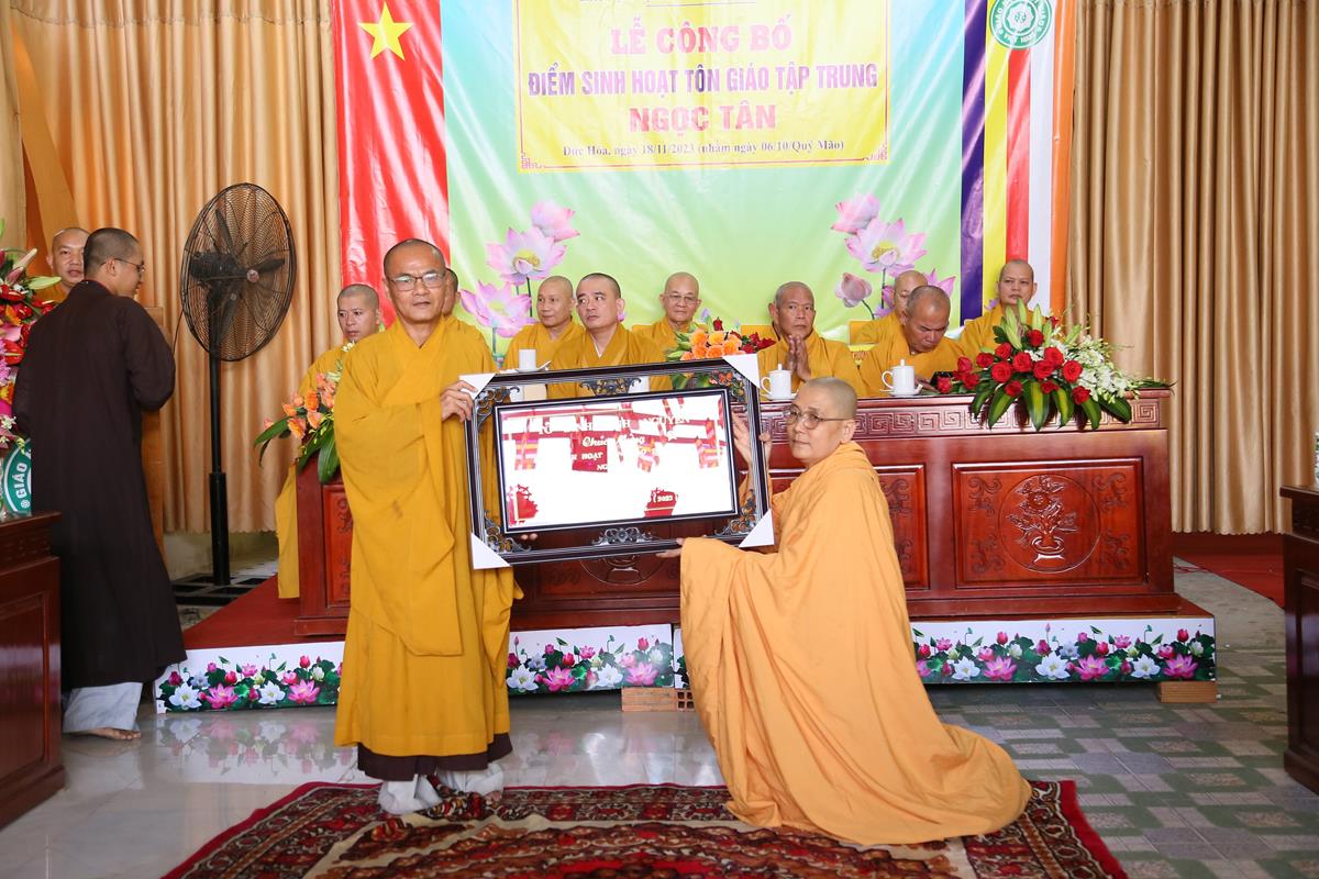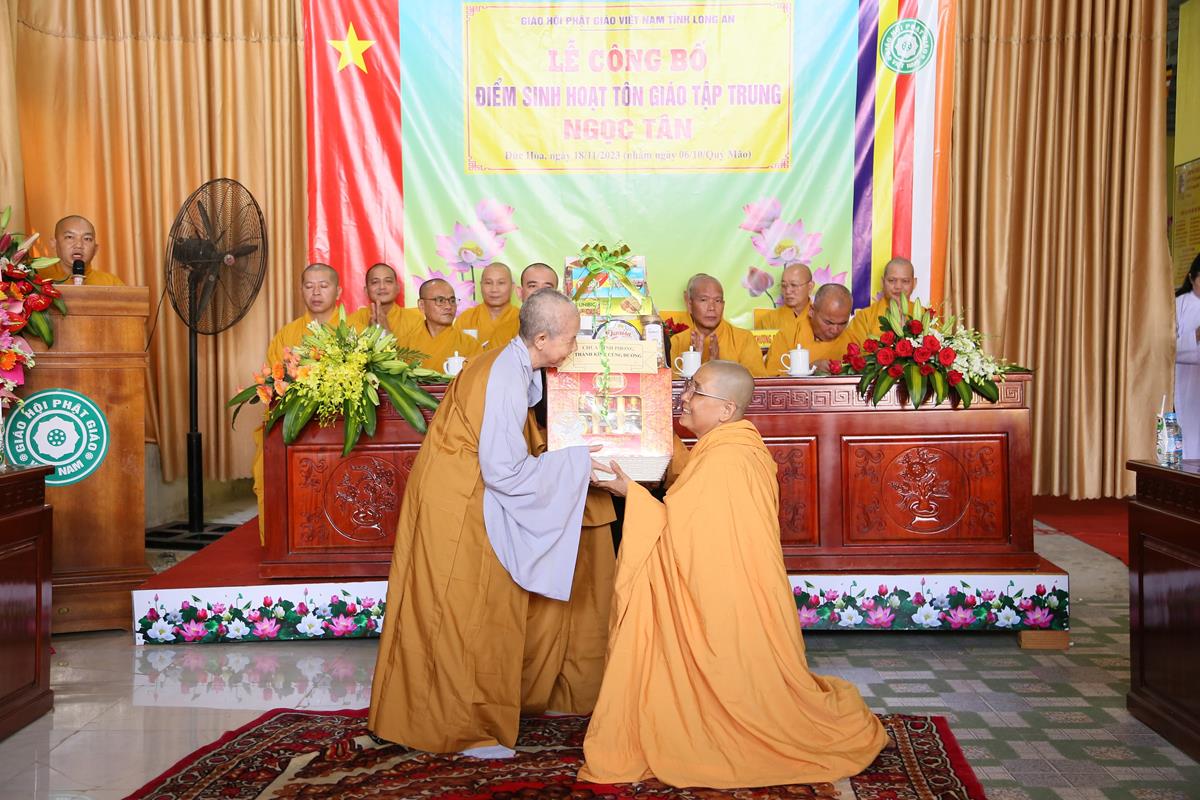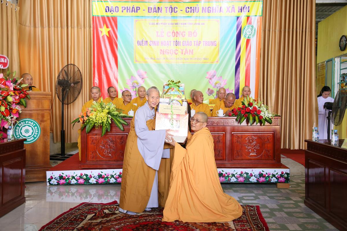Được sự cho phép cho của chư Tôn đức Thường trực Ban Trị sự GHPGVN tỉnh Long An, Đại đức Thích Lệ Duyên – Phó ban kiêm Chánh Thư ký Ban Trị sự GHPGVN tỉnh Long An, Trưởng ban Trị sự GHPGVN huyện Đức Hòa thông qua giấy chứng nhận đăng ký sinh hoạt tôn giáo tập trung Ngọc Tân theo quyết định số 690/GCN-UBND do Chủ tịch UBND xã Hòa Khánh Tây – ông Hồ Trường Ca ấn ký ngày 27/9/2023. Điểm nhóm sinh hoạt tôn giáo tập trung Ngọc Tân thuộc tổ chức tôn giáo Ban Trị sự GHPGVN tỉnh Long An với người đại diện là Sư cô Thích Nữ Hương Liên (thế danh Hồ Kim Phụng), sinh năm 1972, hộ khẩu thường trú: tổ 3, ấp Tân Bình, xã Hoà Khánh Tây, huyện Đức Hoà, tỉnh Long An. Số lượng đăng ký tham gia sinh hoạt là 100 người. Thời hạn đăng ký sinh hoạt là 36 tháng kể từ ngày ký giấy chứng nhận.