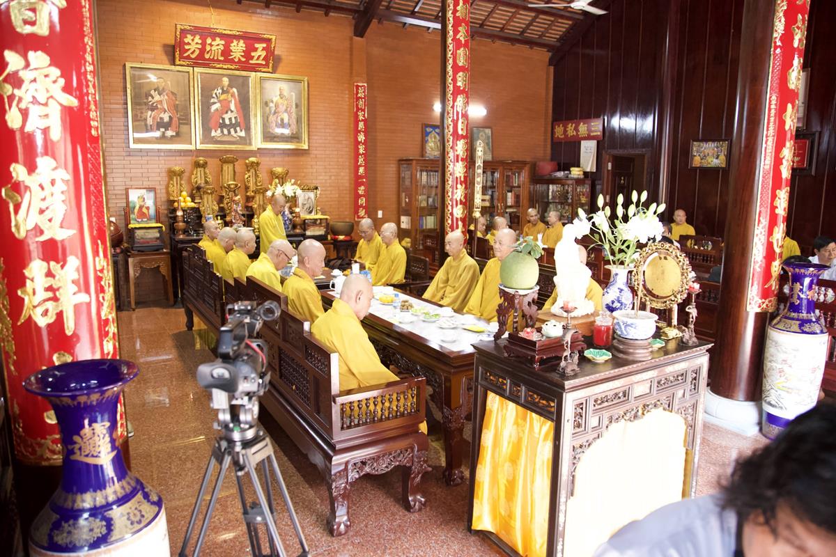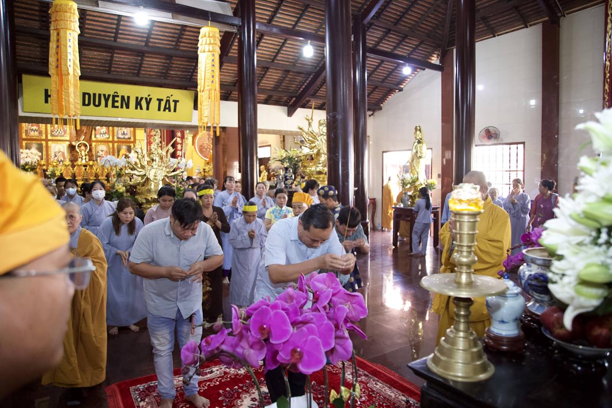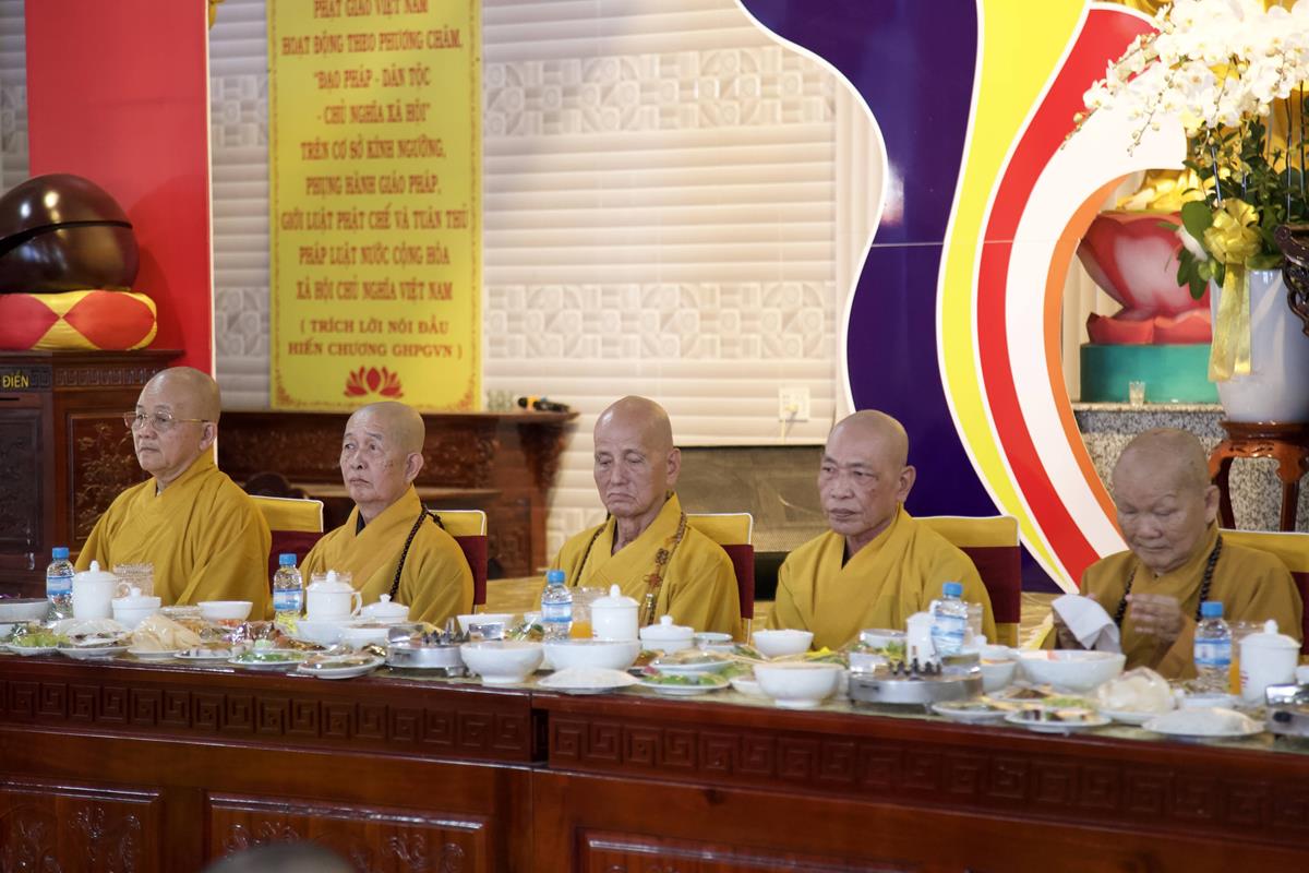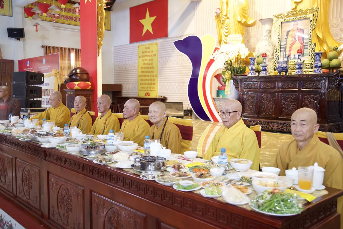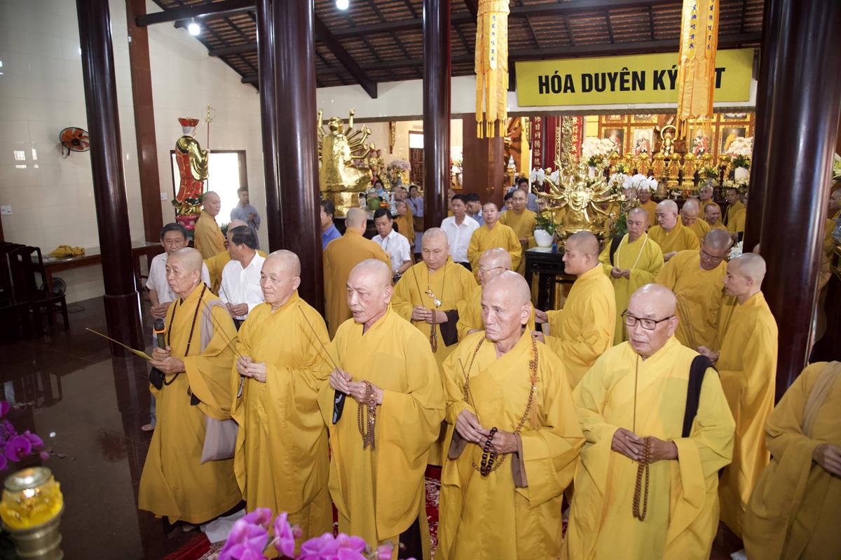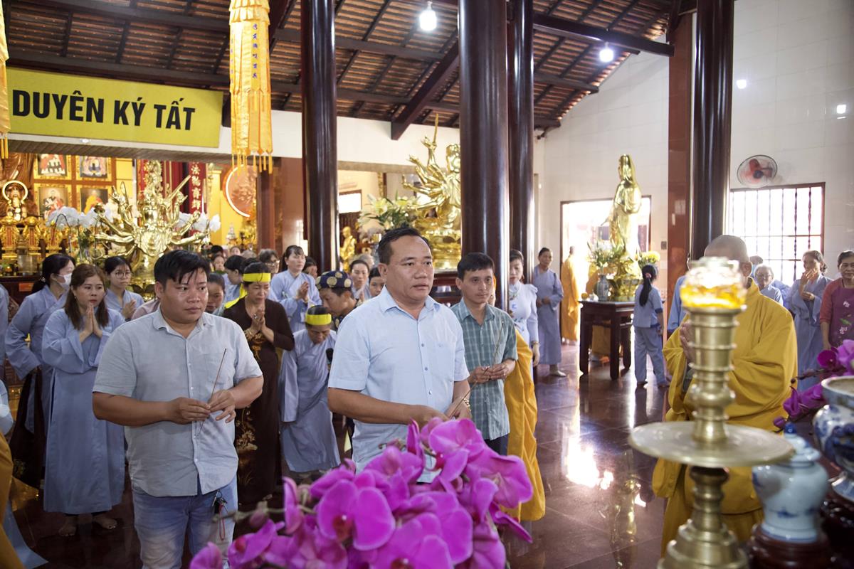 Chư Tôn đức Ban Trị sự GHPGVN tỉnh Long An, Ban Trị sự GHPGVN huyện Đức Hòa, huyện Đức Huệ cùng chư Tôn đức sơn môn pháp phái Tổ đình Linh Nguyên, đại diện các cấp lãnh đạo chính quyền quang lâm Giác linh đường thắp hương tưởng niệm công đức một đời cống hiến cho Đạo pháp – Dân tộc của cố Hóa thượng sau đó quang lâm về Trai đường chứng minh khóa lễ cúng dường trai tăng.