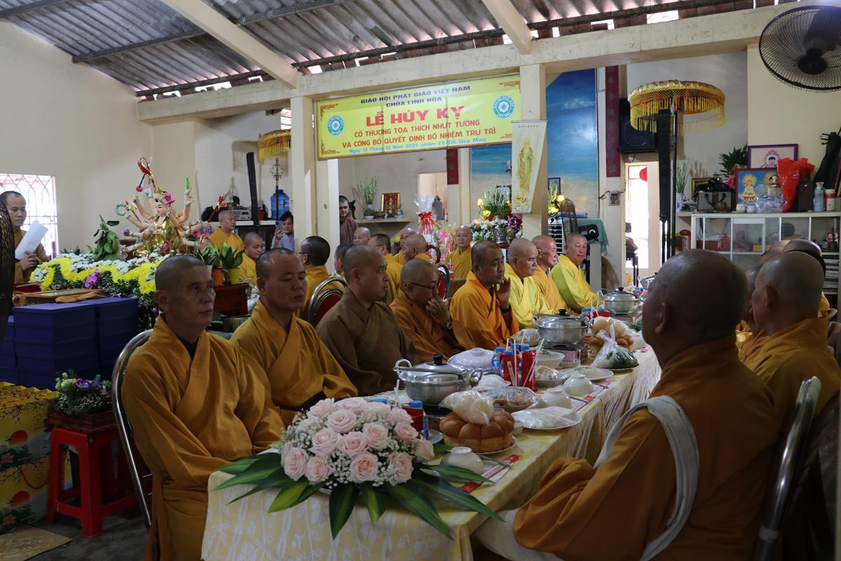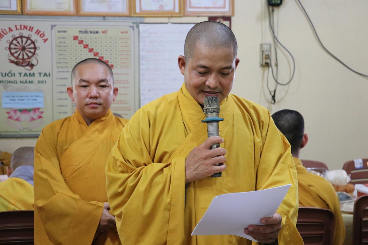 Đãi lao Hoà thượng chứng minh, Hoà thượng Thích Minh Thiện – Ủy viên HĐTS, Phó Ban Hoằng pháp TƯ, Trưởng BTS GHPGVN tỉnh Long An ban lời đạo từ tại buổi lễ. Hòa thượng nhắc lại lịch sử hình thành và phát triển của chùa Linh Hòa kể từ khi Tổ sư Đạt Minh sáng lập năm 1876 cho đến nay với 6 đời trụ trì. Hôm nay, đầy đủ nhân duyên Đại đức Thích Lệ Thành được bổ nhiệm kế nhiệm trụ trì chùa Linh Hòa. Ngôi chùa Linh Hòa từ khi thành lập đã gắn liền với đời sống nhân dân, đồng hành cungf dân tộc, đúng với tinh thần “Mái chùa che chở hồn dân tộc, nếp sống muôn đời của Tổ tông” của Phật giáo Việt Nam. Hòa thượng nhắc nhở Đại đức tân trụ trì cần thực hiện tốt nhiệm vụ “trụ pháp vương gia, trì Như Lai tạng”, hoằng dương Phật pháp, mang Phật pháp đến với mọi người. Theo tổ chức hành chính giáo hội, người trụ trì là người quản lí động sản, bất động sản của cơ sở tư viện theo đúng tinh thần Kinh Luật Luận của Phật giáo. Và hơn hết, với tư cách là một người xuất gia cần phải đền đáp tứ trọng ân mà mình thọ nhận. Cuối cùng, Hòa thượng mong muốn các cấp lãnh đạo chính quyền sở tại tạo điều kiện giúp đỡ để Chư Tăng, Phật tử chùa Linh Hòa được hoàn thành tốt các Phật sự tại bổn tự.