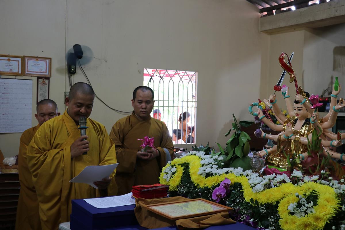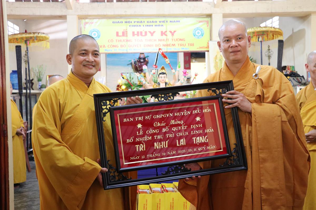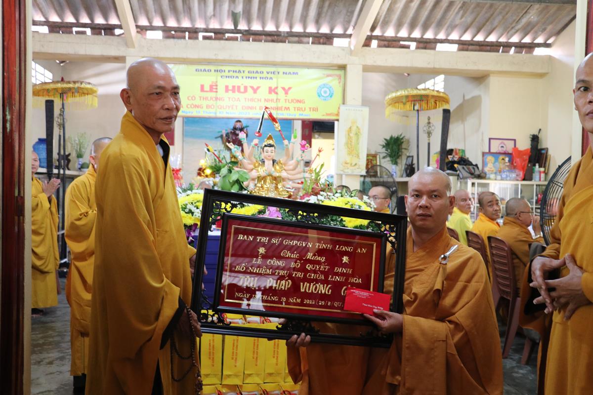 Sau khi tuyên đọc quyết định, Thượng tọa Thích Quảng Tâm đã thay mặt Ban Thường trực Ban Trị sự GHPGVN tỉnh Long An trao quyết định và con dấu đến Đại đức tân trụ trì. Để chúc mừng sự kiện trọng đại này, Đại đức tân trụ trì đón nhận khánh vàng chúc mừng của BTS GHPGVN tỉnh Long An và phần tịnh tài do Hòa thượng Thích Thiện Huệ trao tặng; khánh vàng của BTS GHPGVN huyện Đức Hòa, khánh vàng của Chư tôn đức Chùa Linh Pháp, chùa Phước Long, chùa Tân Sơn, chùa Linh Châu, chùa Quan Âm, chùa Ấn Chứng,…