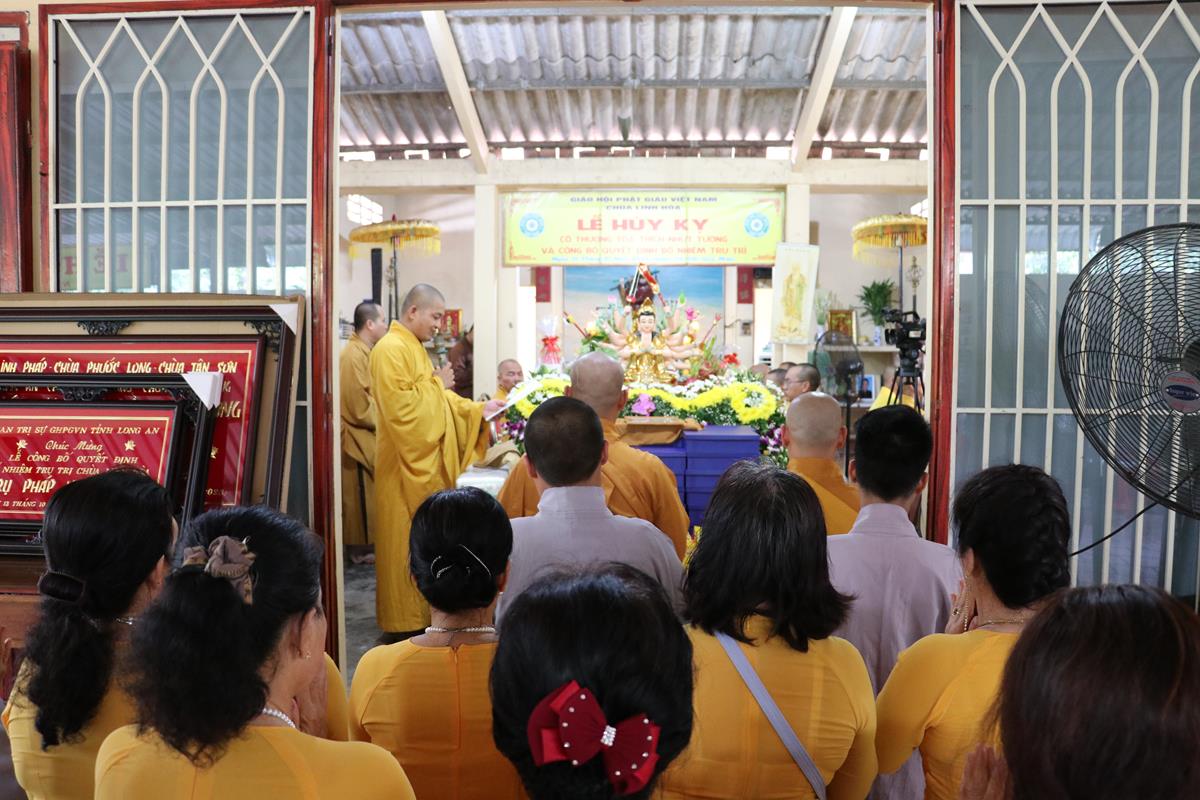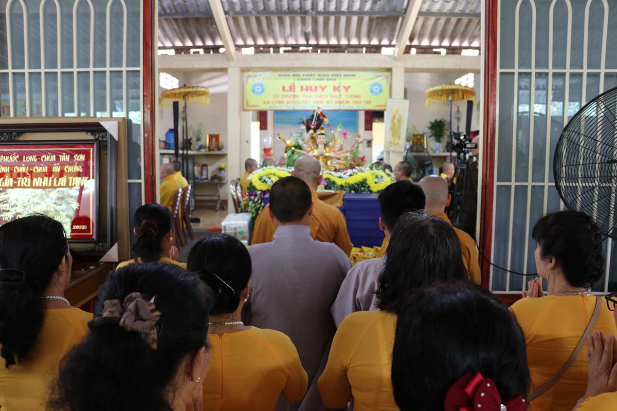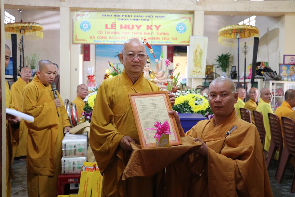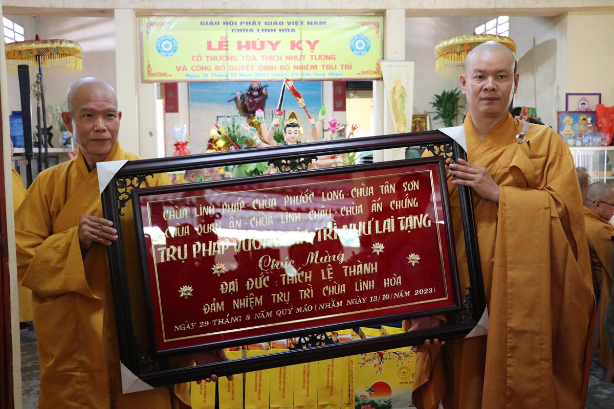 Sau khi tuyên đọc quyết định, Thượng tọa Thích Quảng Tâm đã thay mặt Ban Thường trực Ban Trị sự GHPGVN tỉnh Long An trao quyết định và con dấu đến Đại đức tân trụ trì. Để chúc mừng sự kiện trọng đại này, Đại đức tân trụ trì đón nhận khánh vàng chúc mừng của BTS GHPGVN tỉnh Long An và phần tịnh tài do Hòa thượng Thích Thiện Huệ trao tặng; khánh vàng của BTS GHPGVN huyện Đức Hòa, khánh vàng của Chư tôn đức Chùa Linh Pháp, chùa Phước Long, chùa Tân Sơn, chùa Linh Châu, chùa Quan Âm, chùa Ấn Chứng,…