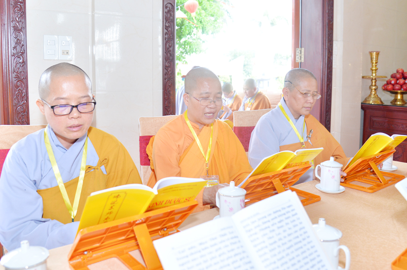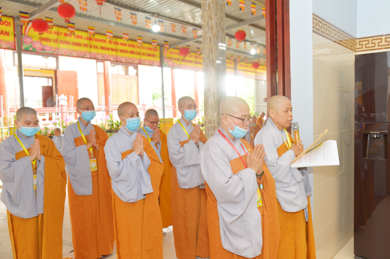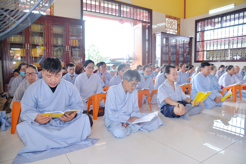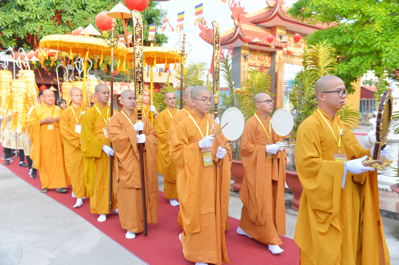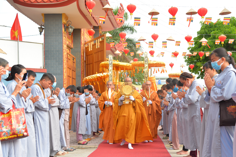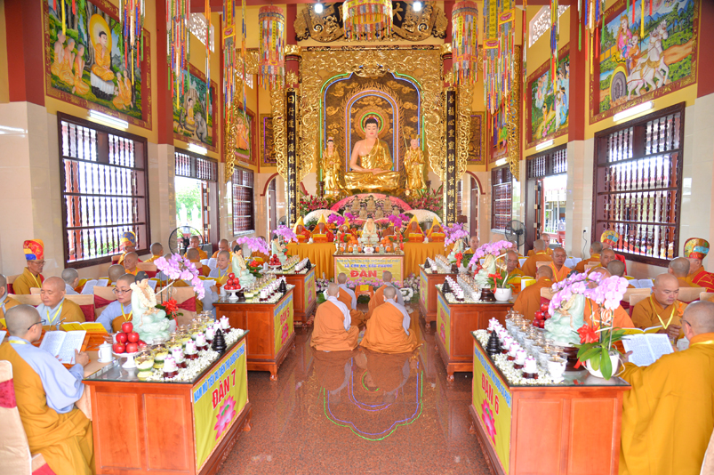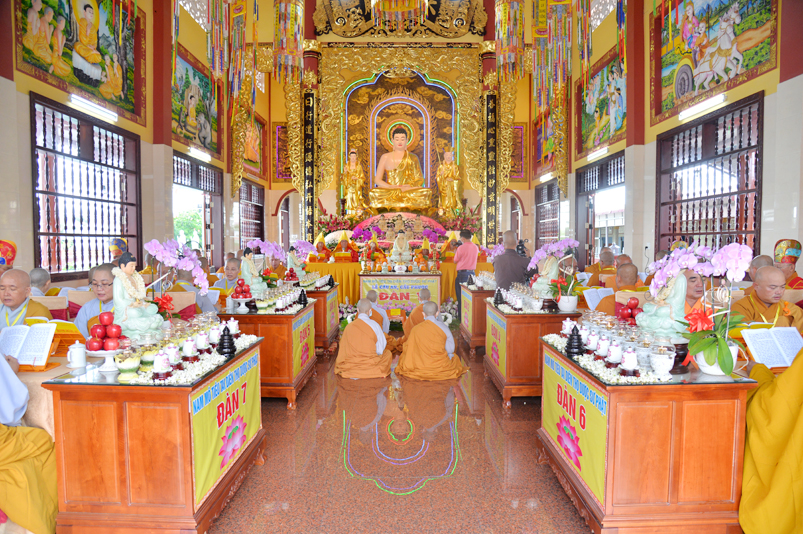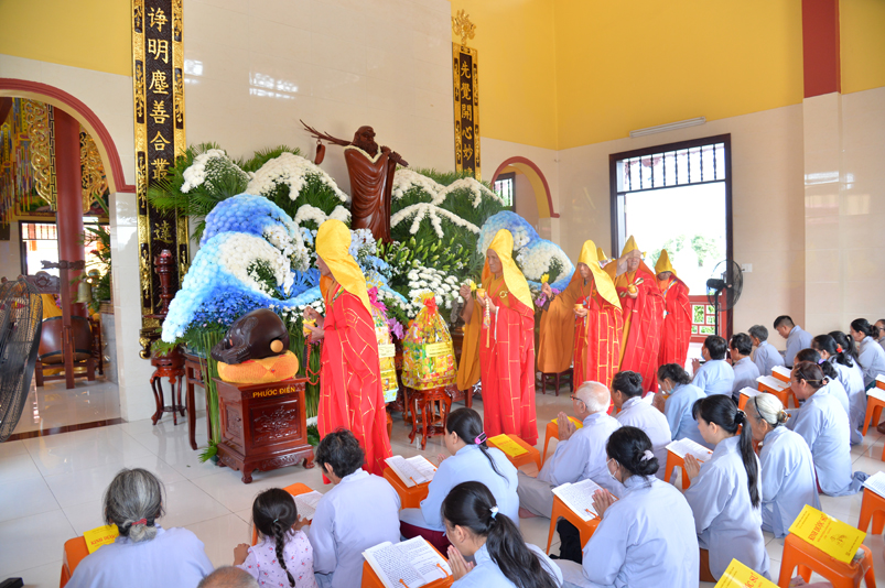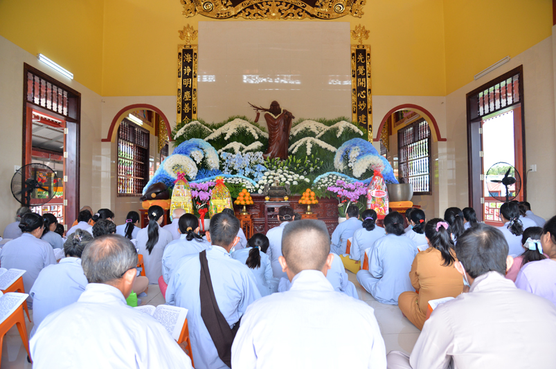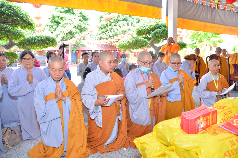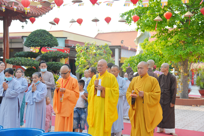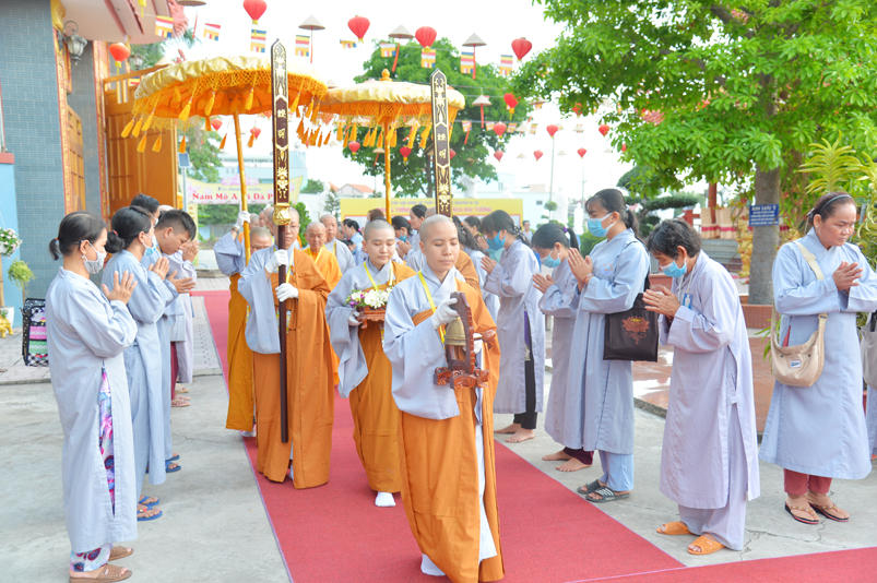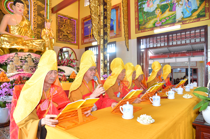 Đúng theo chương trình vào lúc 8g30, Ban nghi lễ cung nghinh chư Tôn đức giáo phẩm Thường trực Ban Trị sự Phật giáo tỉnh Long An, chư Tôn đức Trụ trì các tự viện trong địa bàn thành phố tỉnh Long An, thân lâm đàn tràng niêm hương bạch Phật, thực hiện nghi thức sái tịnh, tụng kinh Dược Sư. Chủ trì khóa lễ do Hòa thượng Thích Quảng Ý đảm nhiệm.