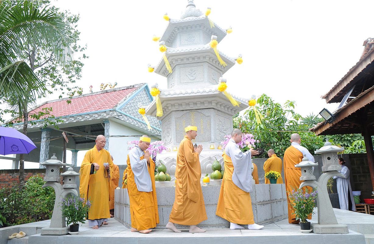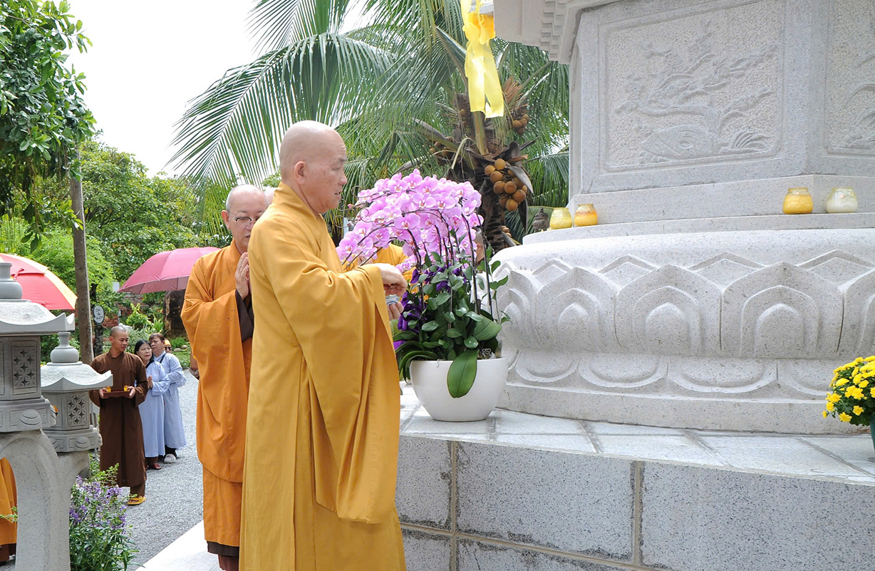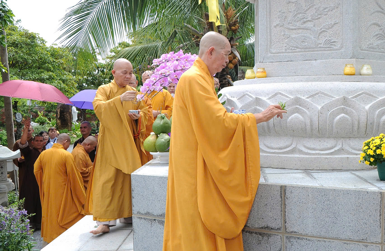 Mở đầu buổi lễ là nghi thức Cúng ngọ và Cung tiến Giác linh Cố Hòa thượng tân viên tịch. Sau đó môn đồ pháp quyến đã cung thỉnh Chư tôn Hòa thượng, Chư tôn đức Chứng minh quang lâm bảo tháp thực hiện nghi thức tạ tháp, sái tịnh, nhiễu tháp theo nghi thức truyền thống của Phật giáo.