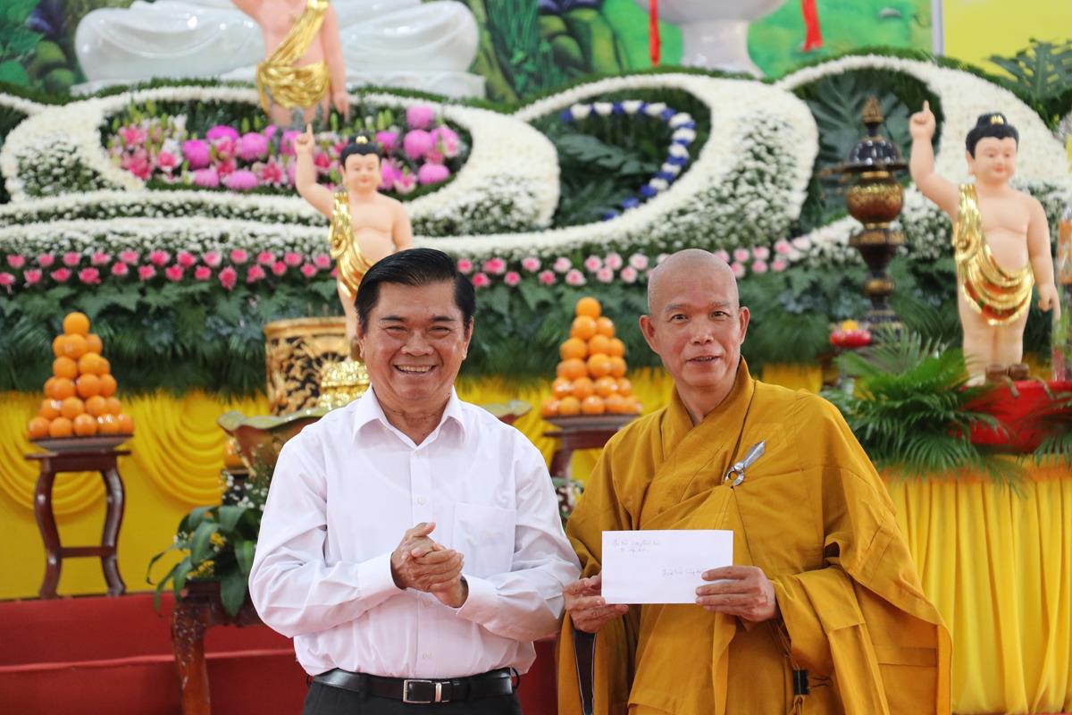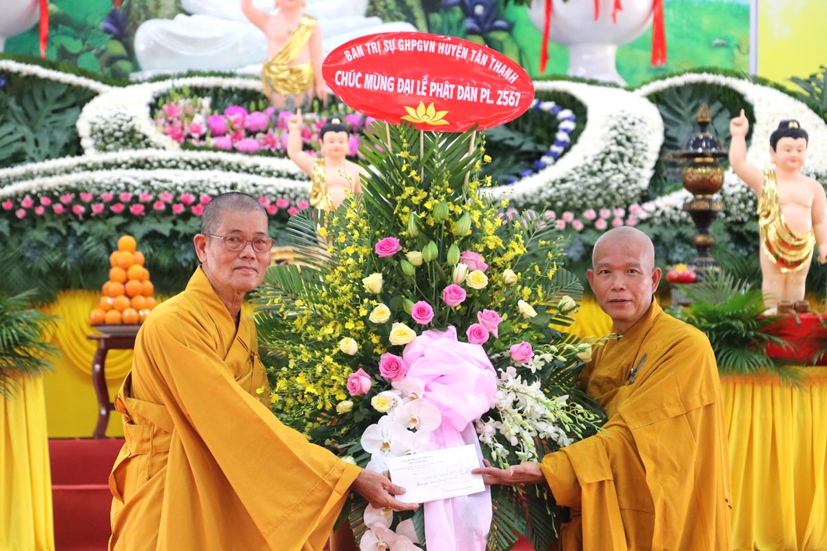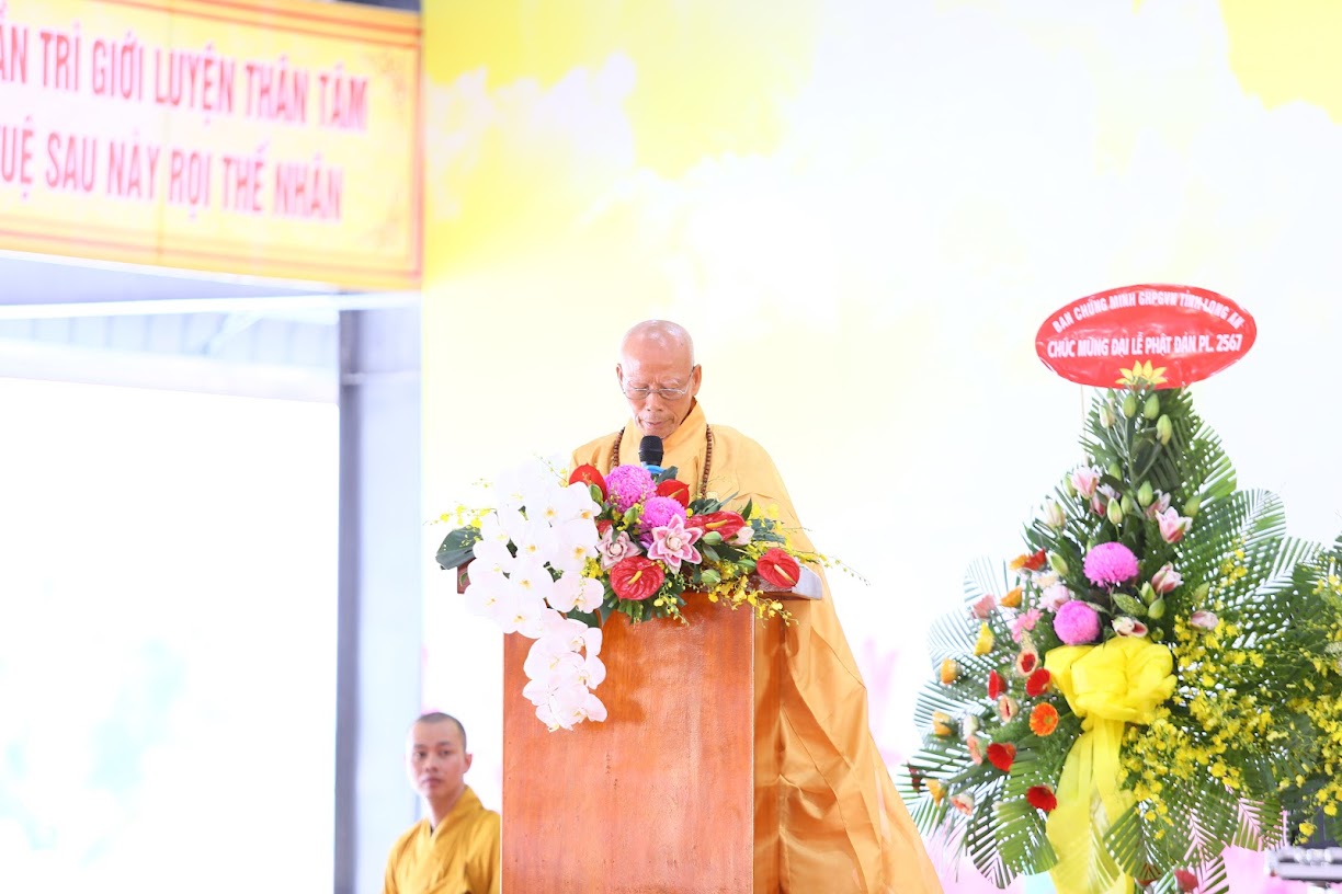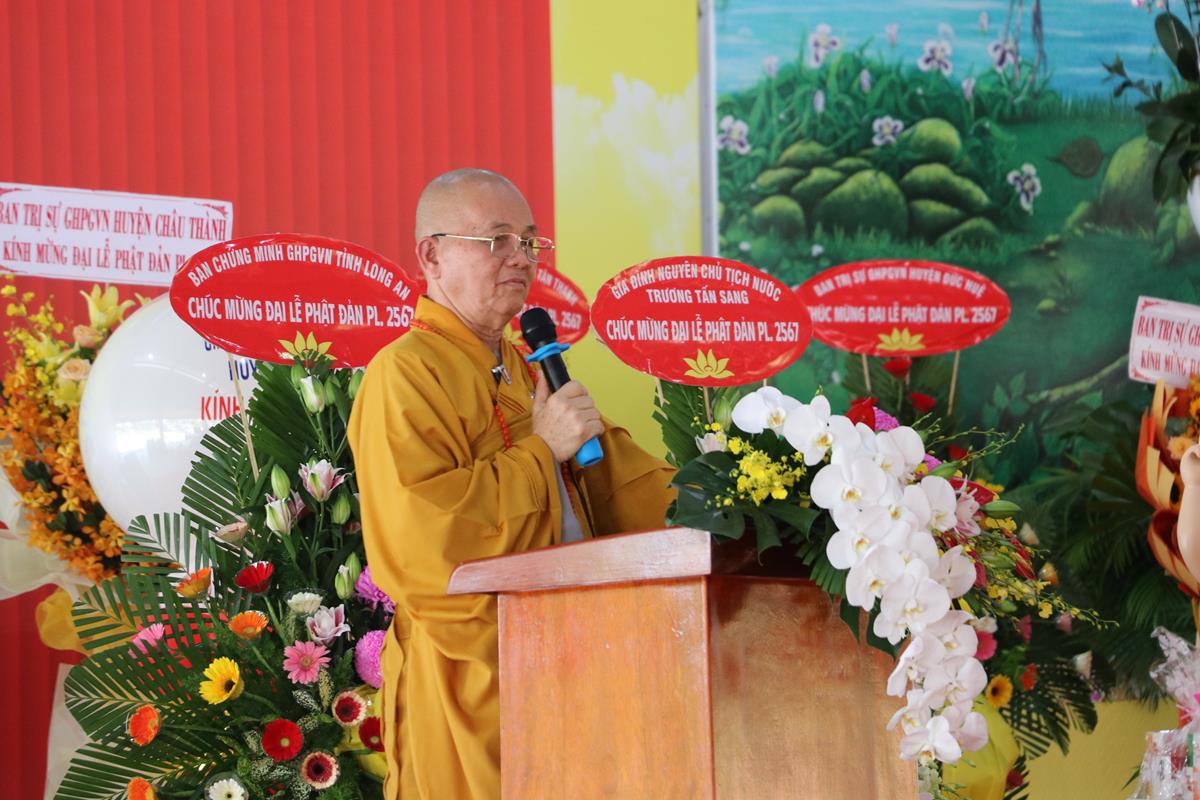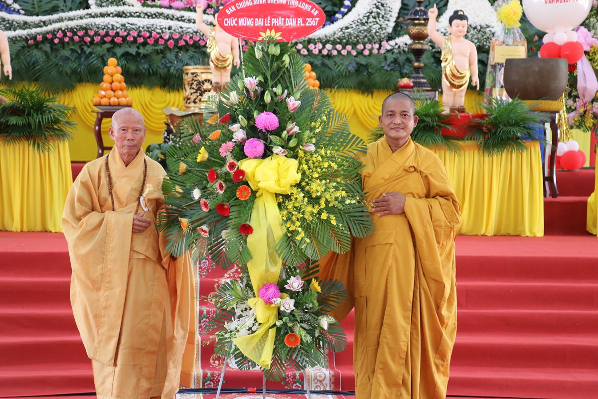 Đãi lao chư tôn đức Ban Chứng minh BTS GHPGVN tỉnh Long An, Hòa thượng Thích Huệ Hồng – Chứng minh BTS GHPGVN tỉnh Long An tuyên đọc Thông điệp Phật đản PL.2567 của Đức Pháp chủ GHPGVN. Nội dung trọng tâm được Đức Pháp Chủ nhấn mạnh trong thông điệp: “Mùa Phật đản năm nay, những người Phật tử Việt Nam chúng ta đồng thời thành kính tưởng niệm 60 năm ngày Bồ – tát Thích Quảng Đức vị pháp thiêu thân (1963-2023). Chúng ta tự hào về một giai đoạn lịch sử hào hùng của dân tộc và trong đó có dấu ấn về hạnh nguyện cao cả của Bồ – tát Thích Quảng Đức trên con đường phụng sự Đạo pháp và Dân tộc. Ngọn lửa Từ bi cùng với Trái tim bất diệt của Ngài có năng lực soi sáng và thức tỉnh lương tri của con người, hóa giải tất cả hận thù. Ngọn lửa đó đã chỉ cho mỗi người sống là phải biết vượt lên mọi chủ nghĩa cá nhân ích kỷ hẹp hòi và mọi ý niệm cực đoan. Ngài là biểu tượng sáng ngời của tinh thần Bi, Trí, Dũng của bậc Bồ – tát hiện thế và tinh thần nhập thế của Phật giáo Việt Nam”.