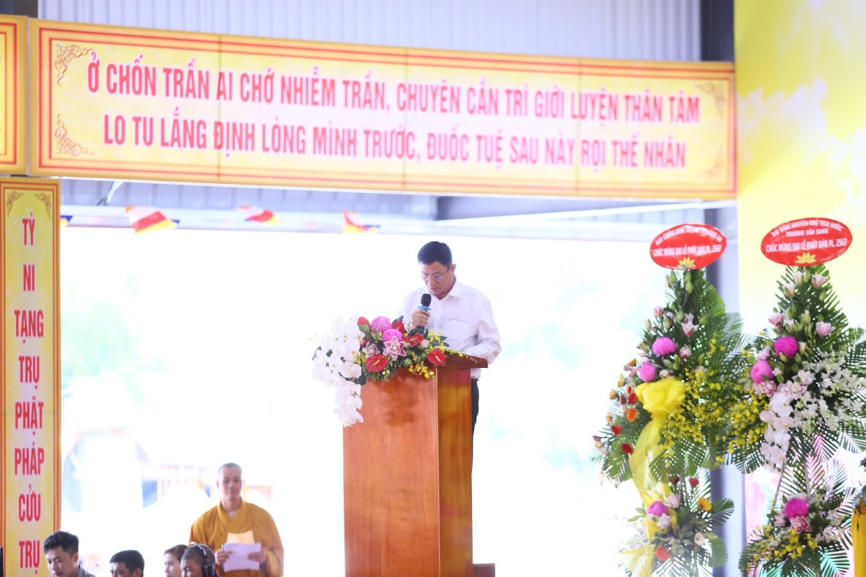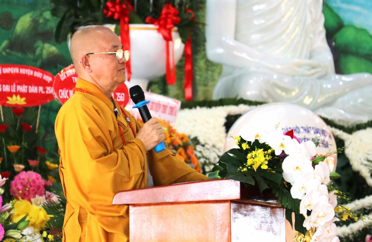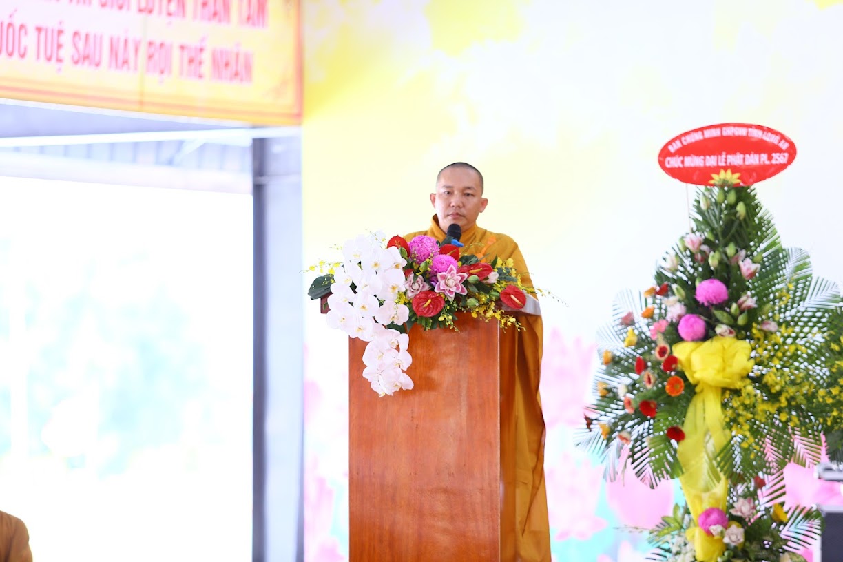 Tiếp theo, ĐĐ. Thích Lệ Duyên tuyên đọc Diễn văn Phật đản PL.2567 của Đức Hòa thượng Chủ tịch Hội đồng Trị sự GHPGVN. “Hơn lúc nào hết, những lời dạy vô giá về tình thương yêu, sự sẻ chia, lòng từ bi, tinh thần bất bạo động, con đường giải thoát khổ đau cho nhân loại chúng sinh của Đức Phật Thích Ca Mâu Ni thực sự là kim chỉ nam đưa đến các giải pháp cho những vấn đề nan giải của con người”. Diễn văn của Hòa thượng Chủ tịch Hội đồng Trị sự cũng nhắn nhủ, mong muốn toàn thể Tăng Ni, Cư sĩ, Phật tử Việt Nam ở trong nước cũng như ở nước ngoài, hãy tinh tấn tu học, nỗ lực trong tu tập Giới – Định – Tuệ; nêu cao pháp hành trì giới luật thực hiện phương châm: Kỷ cương – Trách nhiệm – Đoàn kết – Phát triển để trang nghiêm Giáo hội.
