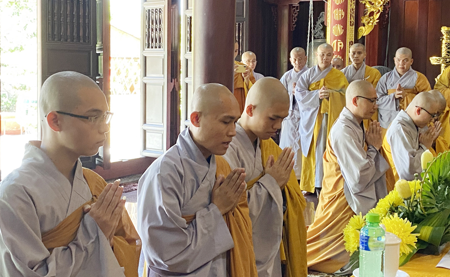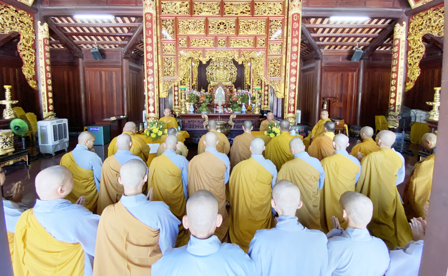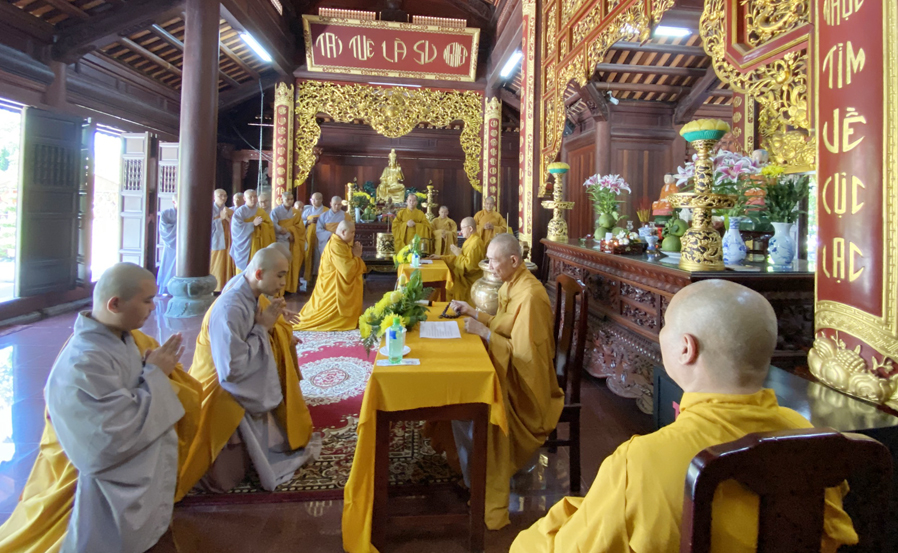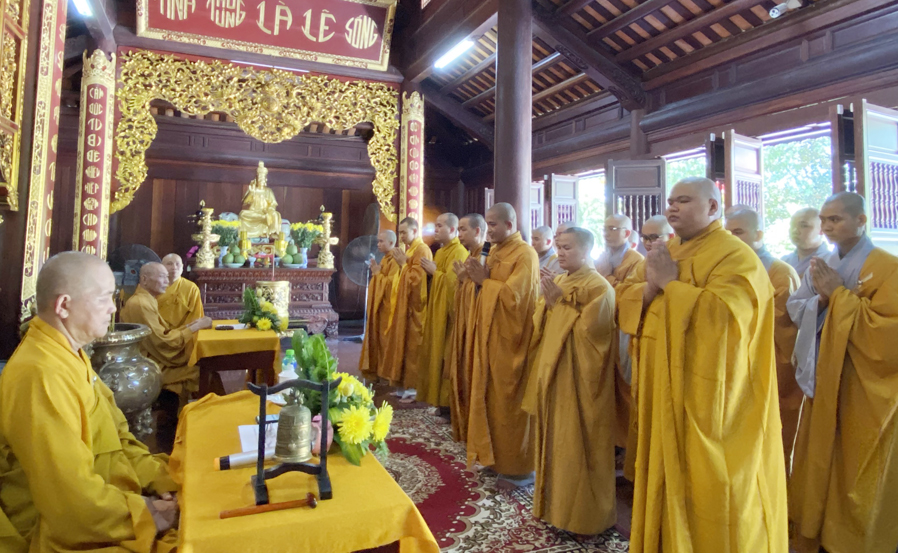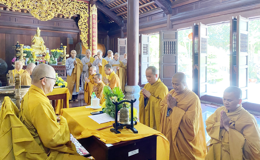 Trước khi tác pháp An cư đại chúng cùng vân tập về nơi Tổ đường niêm hương cẩn bạch và đảnh lễ chư vị Tổ sư, sau đó quang lâm về nơi chánh điện cử hành nghi lễ chính thức. Hòa thượng Thích Thiện Huệ Chứng minh Ban trị sự GHPG Việt Nam tỉnh Long An, Chứng minh Trường Sơ Trung Cấp Phật học tỉnh Long An đã niêm hương bạch Phật, đại chúng cùng đãnh lễ Tam Bảo, cử tán Dương Chi, trì tụng Đại Bi thần chú, sau đó cung thỉnh nhị vị Hòa thượng chứng minh đại chúng lần lượt thứ đệ tác pháp An cư như pháp như luật.