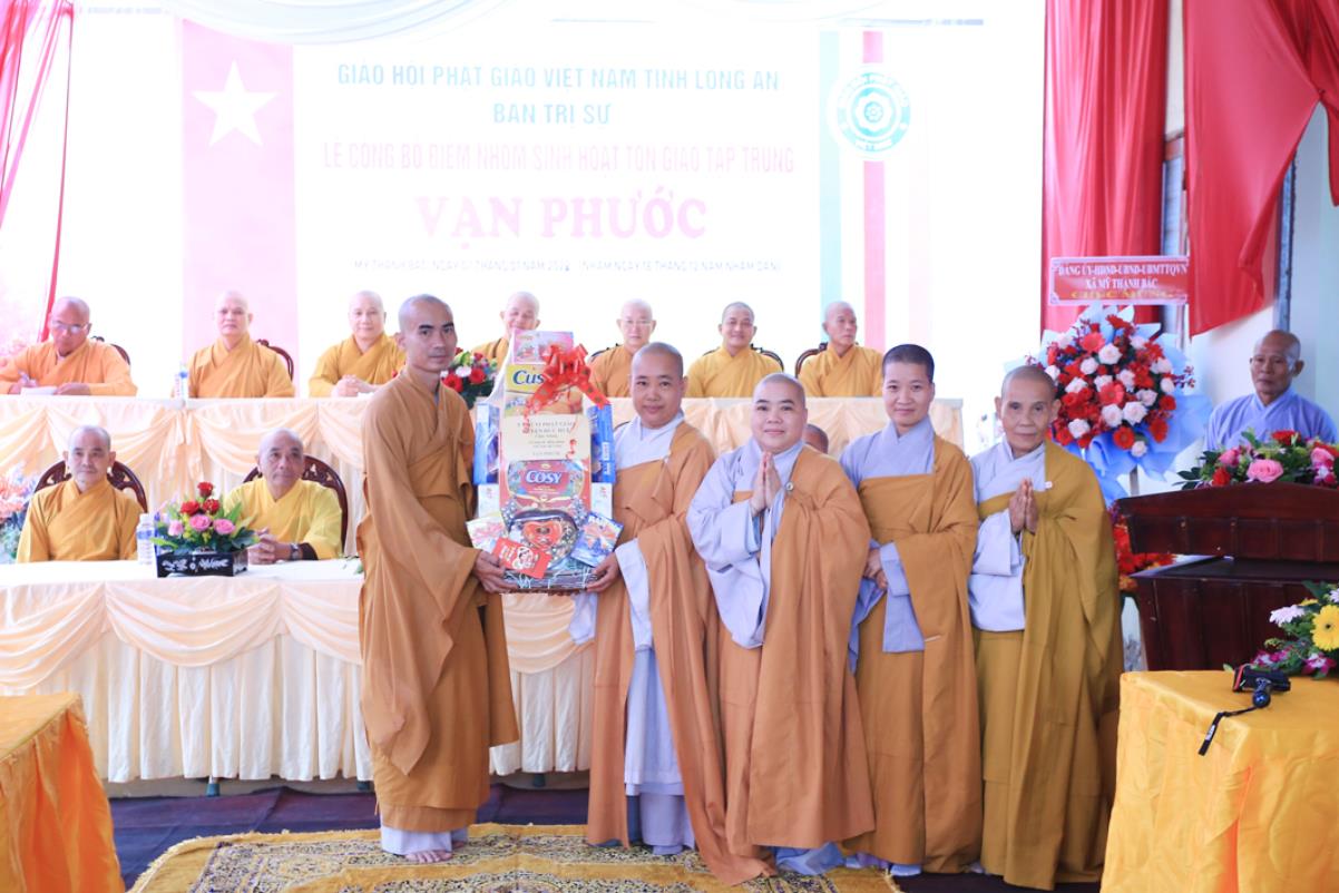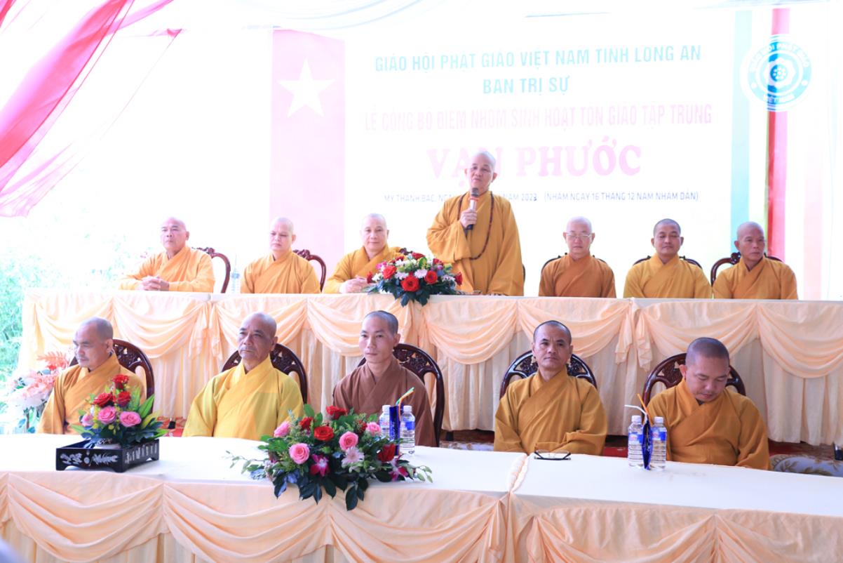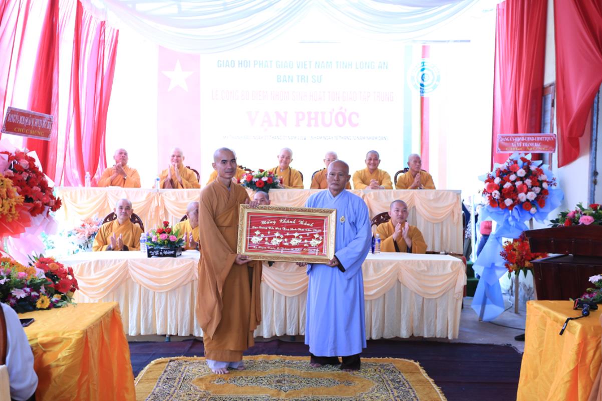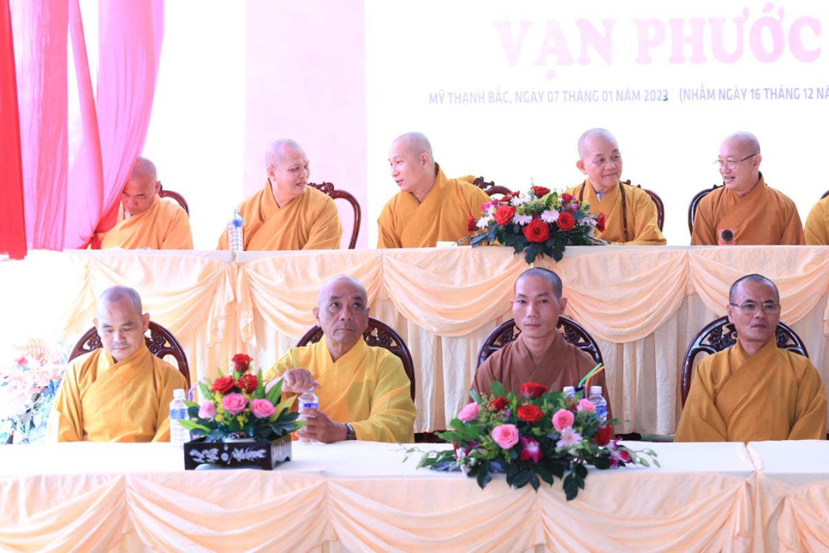 Đãi lao chư tôn đức chứng minh, HT. Thích Minh Thiện có lời đạo từ tại buổi lễ. Trước thềm xuân mới, Phật giáo Long An có thêm một điểm sinh hoạt là một điều rất quý báu. Qua lời phát biểu của chính quyền sở tại, Đạo tràng Vạn Phước cần thực hiện đúng tinh thần Hiến chương Phật giáo Việt Nam, lời chỉ đạo của BTS GHPGVN tỉnh Long An, huyện Đức Huệ và nhất nhất chấp hành Pháp luật nhà nước Việt Nam hiện hành. Vì là điểm sinh hoạt mới thành lập nơi vùng biên giới nên chư Tăng cần khéo léo trong việc truyền bá chánh pháp đến người dân. Hòa thượng nhắc lại lịch sử du nhập, truyền bá và phát triển của Phật giáo Việt Nam luôn gắn liền và đồng hành cùng Dân tộc. Hòa thượng mong muốn Đạo tràng Vạn Phước tiếp tục đồng hành cùng địa phương trong công tác an sinh xã hội, xây dựng khối đoàn kết toàn dân tộc. Đồng thời Hòa thượng đã chúc nguyện cho ngôi Tam bảo đạo tràng Vạn Phước được trang nghiêm, thanh tịnh, thành tựu như pháp. Nhân đây, Hòa thượng chuyển lời khánh chúc và phần tịnh tài của Hòa thượng Thích Thiện Huệ – Thành viên HĐCM, Chứng minh BTS GHPGVN tỉnh Long An gửi tặng.