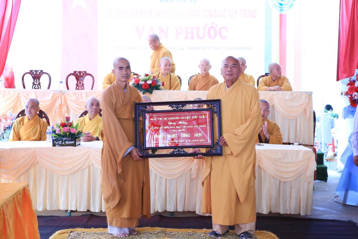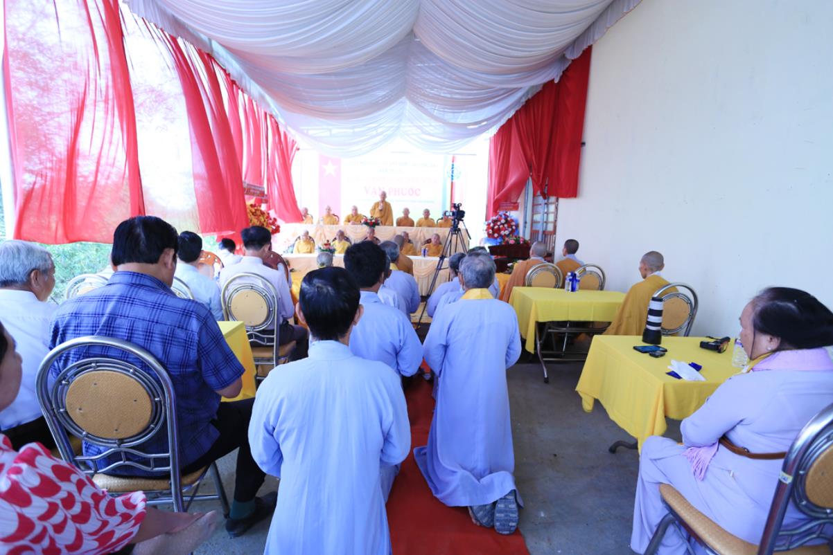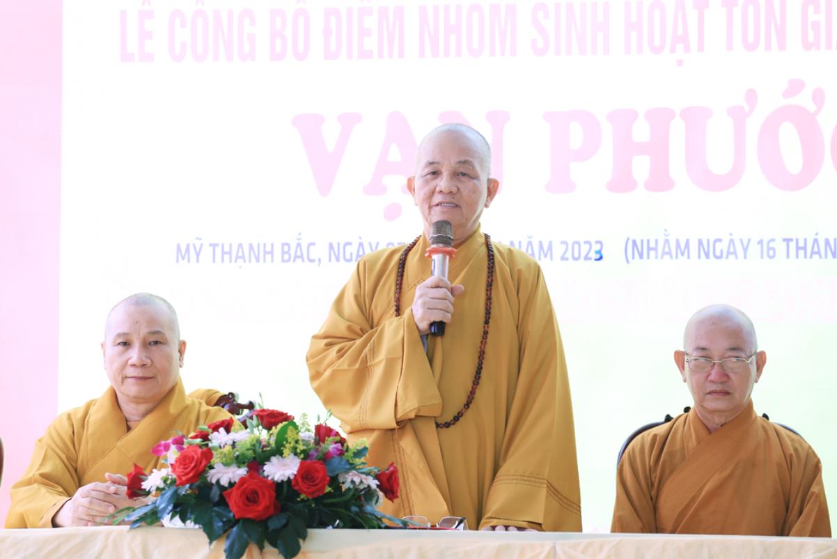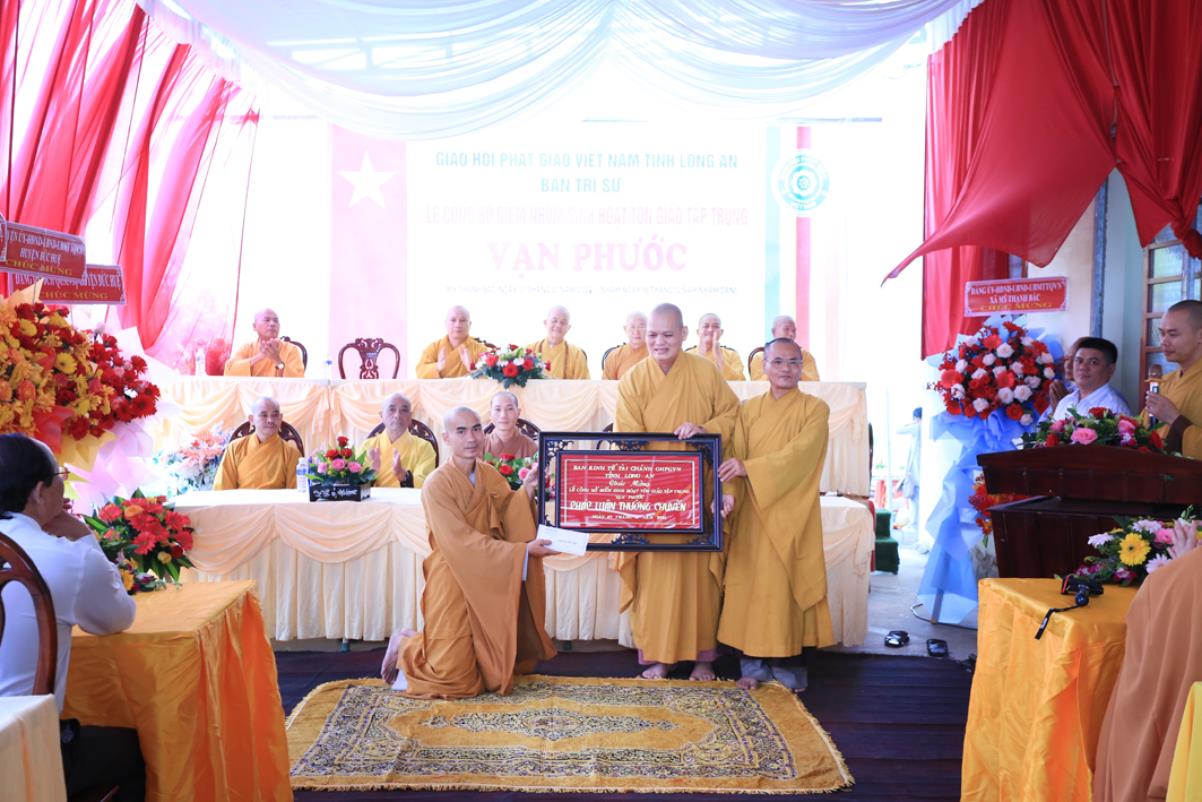 Đãi lao chư tôn đức chứng minh, HT. Thích Minh Thiện có lời đạo từ tại buổi lễ. Trước thềm xuân mới, Phật giáo Long An có thêm một điểm sinh hoạt là một điều rất quý báu. Qua lời phát biểu của chính quyền sở tại, Đạo tràng Vạn Phước cần thực hiện đúng tinh thần Hiến chương Phật giáo Việt Nam, lời chỉ đạo của BTS GHPGVN tỉnh Long An, huyện Đức Huệ và nhất nhất chấp hành Pháp luật nhà nước Việt Nam hiện hành. Vì là điểm sinh hoạt mới thành lập nơi vùng biên giới nên chư Tăng cần khéo léo trong việc truyền bá chánh pháp đến người dân. Hòa thượng nhắc lại lịch sử du nhập, truyền bá và phát triển của Phật giáo Việt Nam luôn gắn liền và đồng hành cùng Dân tộc. Hòa thượng mong muốn Đạo tràng Vạn Phước tiếp tục đồng hành cùng địa phương trong công tác an sinh xã hội, xây dựng khối đoàn kết toàn dân tộc. Đồng thời Hòa thượng đã chúc nguyện cho ngôi Tam bảo đạo tràng Vạn Phước được trang nghiêm, thanh tịnh, thành tựu như pháp. Nhân đây, Hòa thượng chuyển lời khánh chúc và phần tịnh tài của Hòa thượng Thích Thiện Huệ – Thành viên HĐCM, Chứng minh BTS GHPGVN tỉnh Long An gửi tặng.