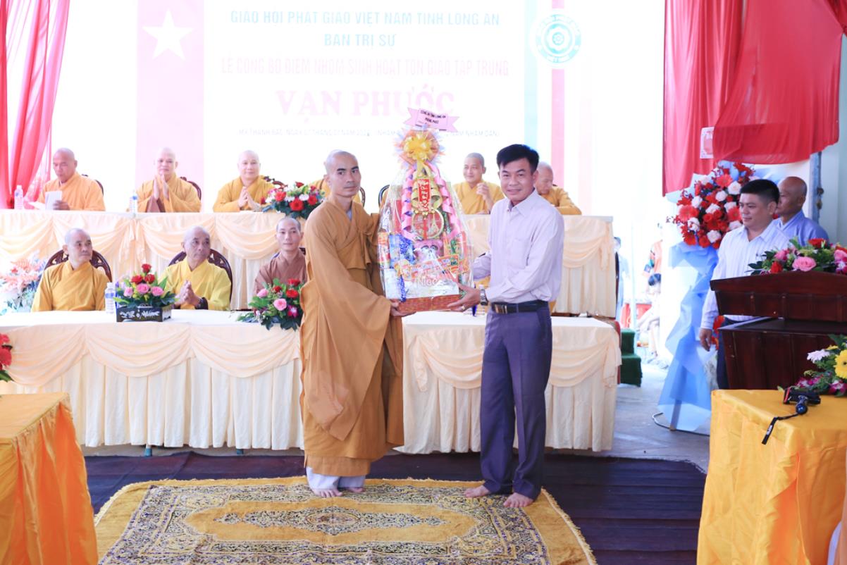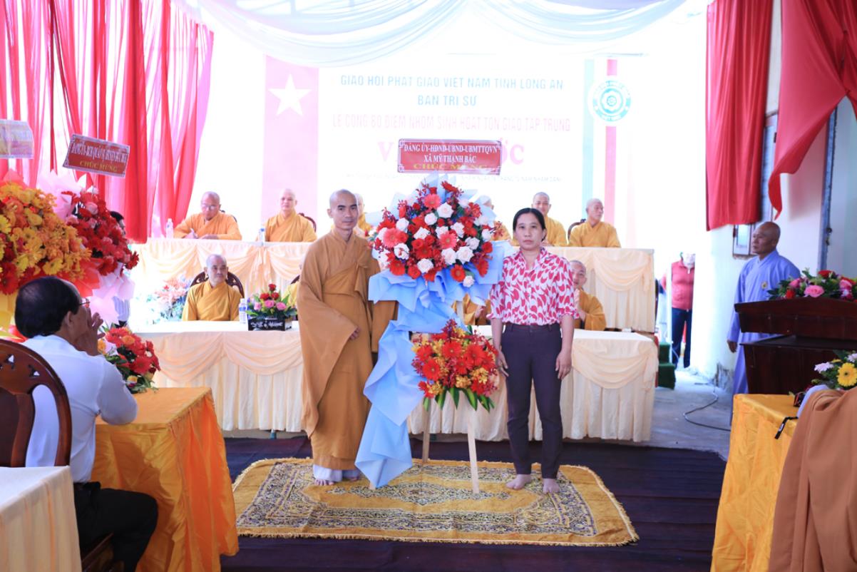 Thay lời các cấp lãnh đạo chính quyền, Phó Chủ tịch UBND xã Mỹ Thạnh Bắc – bà Võ Thị Cẩm Vân có lời phát biểu tại buổi lễ. Bà có lời chúc mừng Phật giáo tỉnh Long An đã có thêm một điểm sinh hoạt tôn giáo tại đại phương. Thay mặt lãnh đạo xã Mỹ Thạnh Bắc, bà ghi nhận đóng góp của ĐĐ. Thích Đức Thiện trong thời gian qua và mong muốn tiếp tục nhận được sự hỗ trợ của chư Tăng và Phật tử huyện Đức Huệ nói chung, điểm sinh hoạt tôn giáo Vạn Phước nói riêng trong thời gian tới. Với những lời chúc tốt đẹp nhất của mình Bà đã khép lại lời phát biểu.