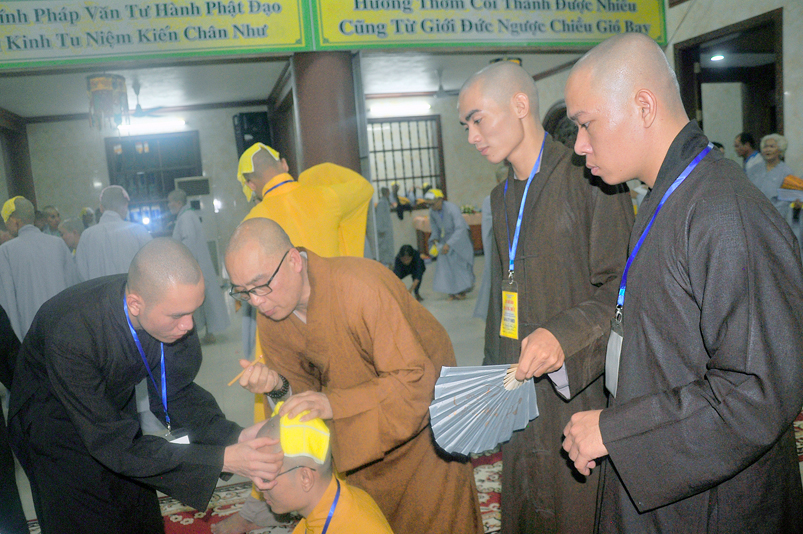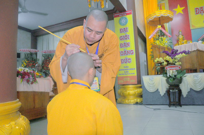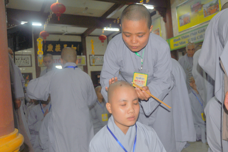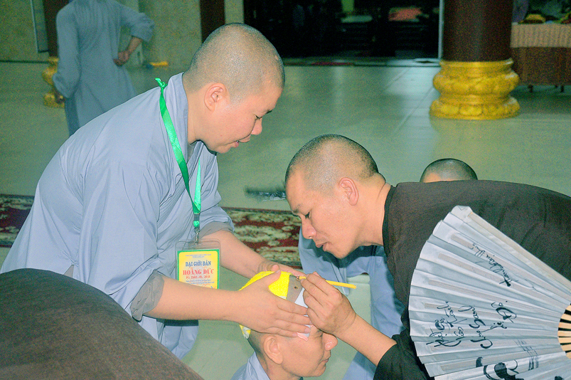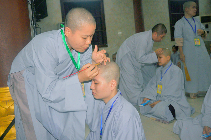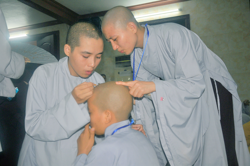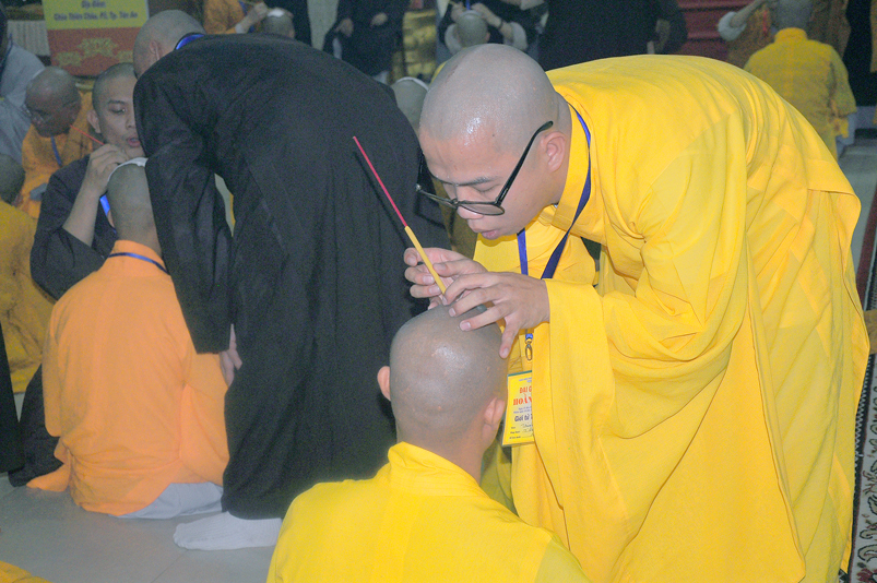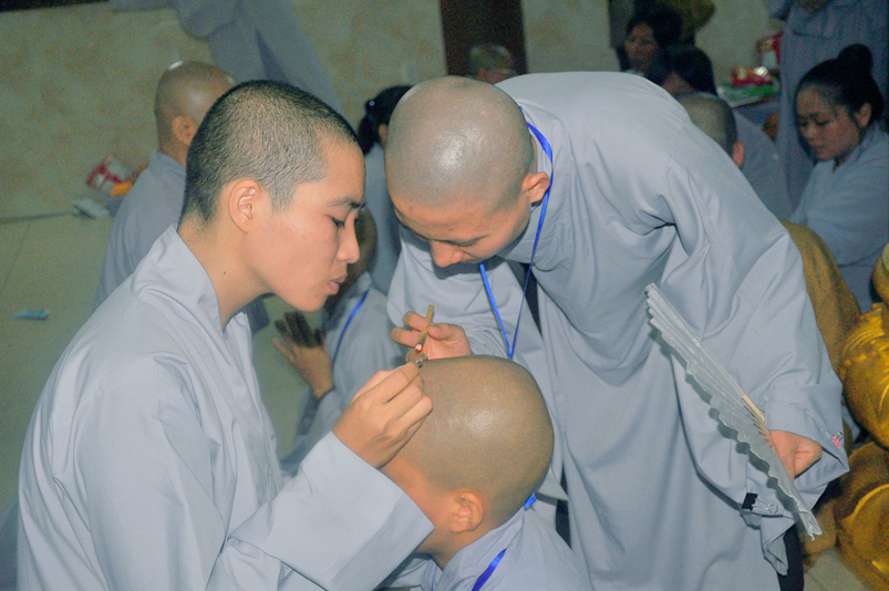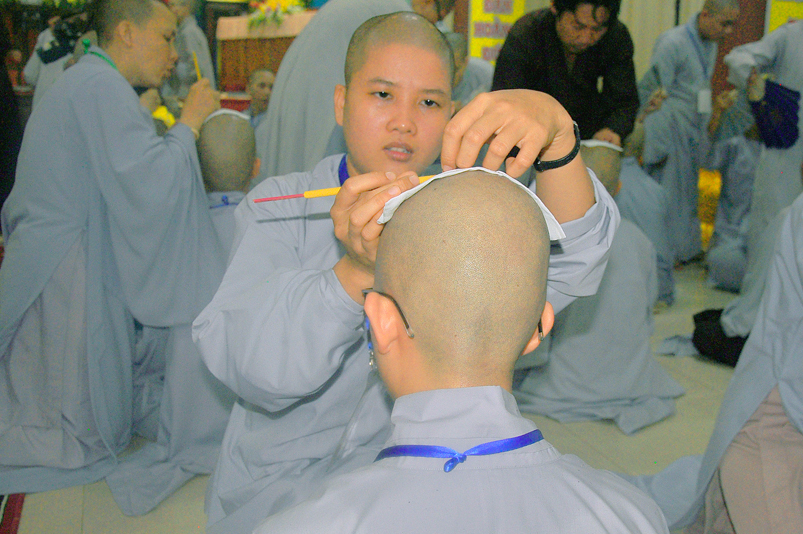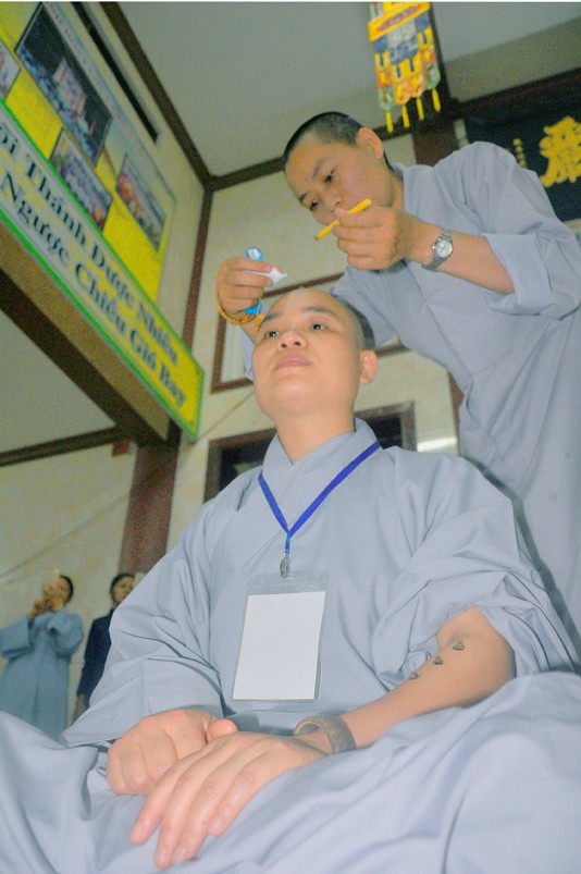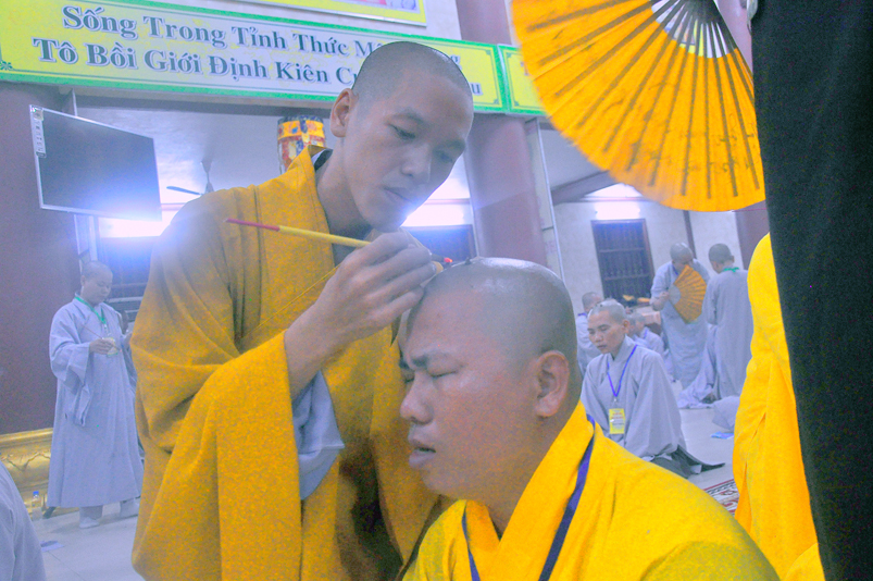 Quý giới tử được hướng dẫn cẩn thận, chi tiết trước khi được phát nguyện tấn hương. Các giới tử nhiếp tâm trong tiếng niệm Phật và hòa quyện trong tiếng trống bát nhã để vượt qua thử thách đau đớn của việc tấn hương.