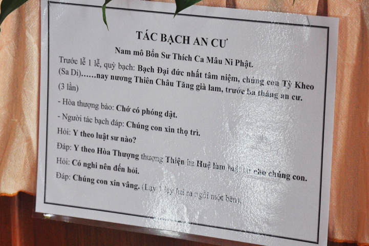 “Đại đức nhất tâm niệm. Tôi Tỳ kheo,… nay y (tên của trú xứ an cư) Tăng già-lam, an cư ba tháng đầu của mùa hạ. Nếu phòng xá có hư hại, sẽ tu bổ”(7) (Bạch ba lần).