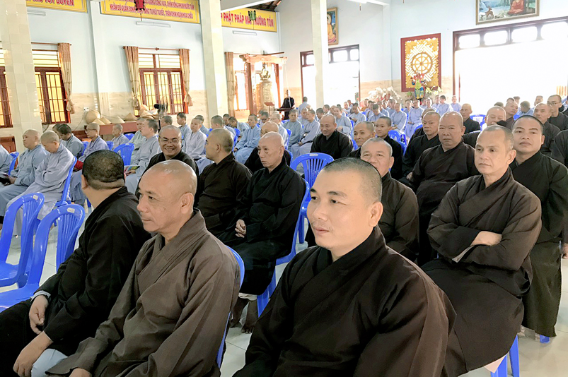 Mở đầu bài Pháp thoại Hòa Thượng nhắc về sự hình thành nên Sáu chúng – về Nguyên Nhân và ý nghĩa An Cư Kiết Hạ và làm như thế nào để phát triển sự nghiệp hoằng pháp. Với trí tuệ và nhiều trăn trở Ngài đã nhẹ nhàng chia sẻ dù ở bất cứ nơi đâu, vào thời đại nào“Giới luật Đức Phật chế là yếu tố quyết định nên nhân cách đạo đức của người tu sĩ Phật giáo cũng như người tại gia cư sĩ Phật giáo. Hành trì giới luật ta có được chánh niệm tỉnh giác, ngăn những điều sai quái, ngừa những điều tội lỗi “Phòng phi, chỉ ác”, hoàn thiện chính mình, để từ đó có lối sống đẹp, cách ứng xử trong giao tiếp nhẹ nhàng từ hòa nhưng đầy trí tuệ của một bậc mô phạm, làm gương sáng cho hậu học và Phật tử tin tưởng được nương về.” Và Người nói thêm việc tôn trọng sự sống của muôn loài, nếp sống lục hòa cộng trụ là điều kiện tiên quyết cho sự hình thành và phát triển bền vững của Phật giáo “Ở nơi đâu có sự khen tặng nhau, nâng đỡ nhau, hỗ tương nhau, thương yêu nhau, đoàn kết nhau ở nơi đó chắc chắn Phật pháp đang rất phát triển”. Ngài mong mỏi, tất cả chúng ta là những con ưu tú của Đức Phật hãy trân trọng giữ gìn và phát huy những gì mà Đức Phật đã cố công gầy dựng, Tổ tổ truyền nhau vì đó chính là tuyệt tác của cuộc đời, là con đường trải đầy hoa của an lạc, từ bi, trí tuệ và giác ngộ giải thoát. Cuối thời pháp thoại Ngài gởi lời chúc cát tường đến Chư tôn đức BTSGHPGVN Liên huyện Đức Hòa-Đức Huệ- Ban Chức Sự hai trú xứ Tổ Đình Linh Nguyên và Chùa Long Thành, Ngài gởi lời cảm ơn đến Ban Hoằng Pháp tỉnh Long An đã rất quan tâm sâu sát đến sự tu học của hành giả các trường hạ và Ngài không quên gởi lời chúc tinh tấn đầy an lạc đến Tăng Ni hành giả An cư hai trường hạ.