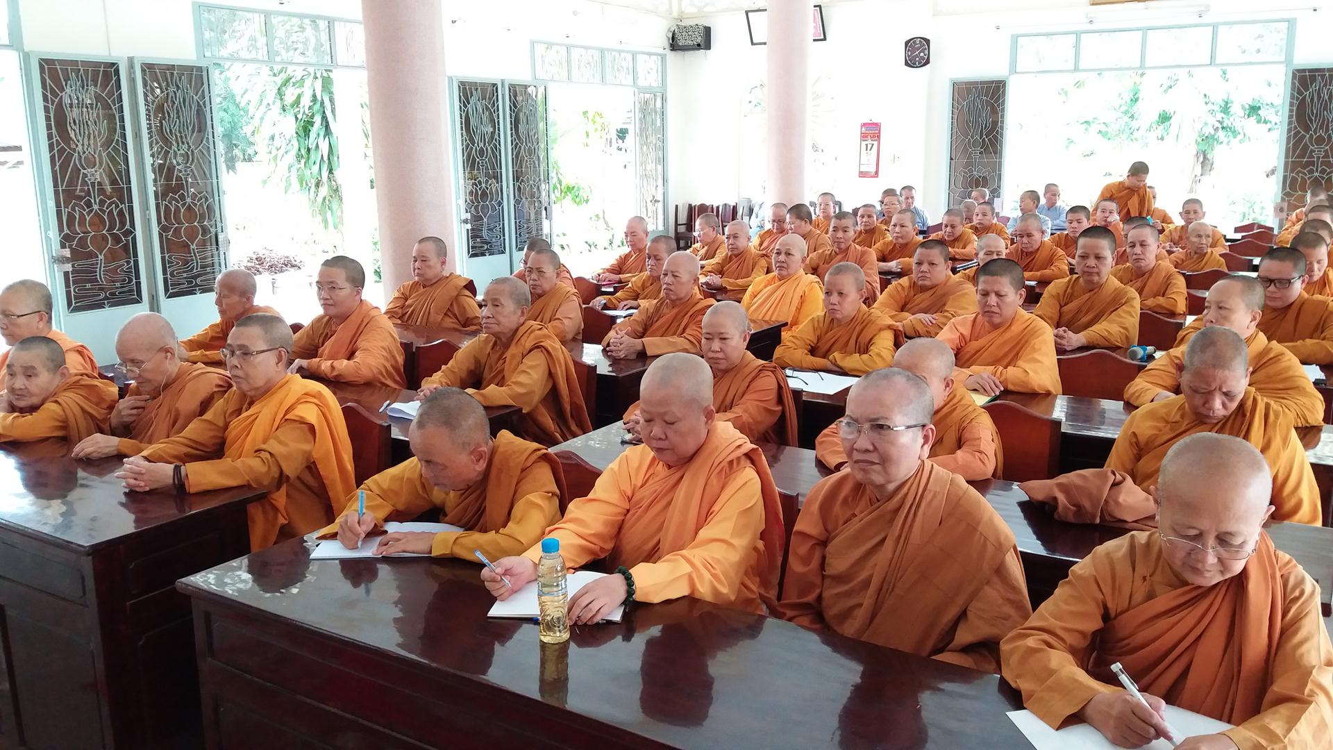 Tiếp theo, hòa thượng khái quát quá trình đồng hành và gắn bó của Phật giáo đối với dân tộc. Phật giáo thời kỳ nào cũng thể hiện tinh thần “hộ quốc an dân”. Tiếp nối theo truyền thống ấy, Phật giáo Long An từ khi thành lập (1983) cho đến nay trải qua 34 năm hình và phát triển đã thành tựu được nhiều Phật sự quan trọng. Sự thành tựu ấy, là do lãnh đạo chánh quyền đã tạo điều kiện thuận lợi, sự nỗ lực của toàn thể Tăng Ni, Phật tử đoàn kết hòa hợp chung lo Phật sự. Hòa thượng cũng ghi nhận sự đóng góp của hệ phái khất sĩ, tiêu biểu là Ni trưởng TN Minh Liên luôn hưởng ứng, ủng hộ Phật sự của tỉnh nhà, Ni trưởng TN Gương Liên duy trì và phát triển bếp ăn từ thiện suốt hơn 10 năm qua, góp phần quan trọng vào hoạt động từ thiện của Phật giáo tỉnh nhà. Hòa thượng khẳng định trong nhiệm kỳ mới sẽ tạo điều kiện thuận lợi để hệ phái phát triển và thành lập thêm cơ sở mới.