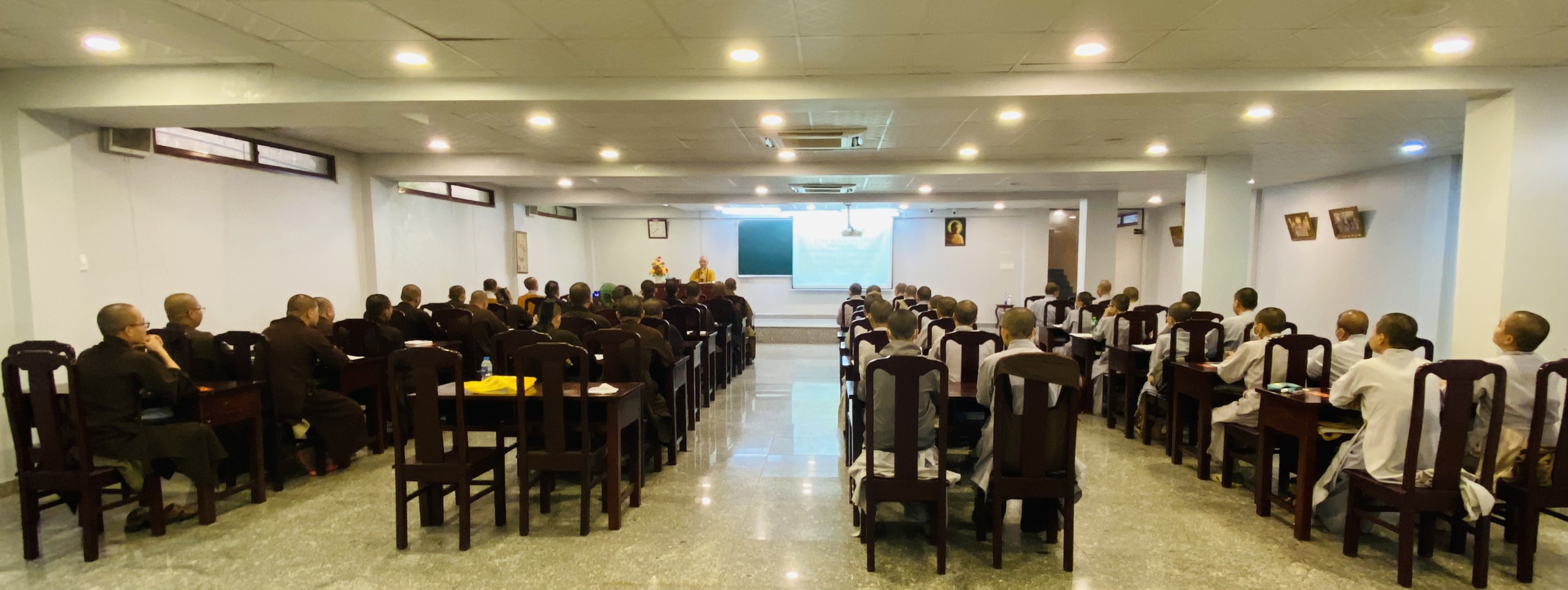 Lấy ý nghĩa từ bài Kinh “Ví Dụ Lõi Cây” trích Trung bộ Kinh, Hòa thượng Hiệu trưởng đã nhắc lại lý tưởng và nhiệm vụ của người xuất gia phải được trân trọng và nuôi dưỡng bằng các thiện pháp. Ngài nhấn mạnh môi trường Đại chúng cần lấy pháp Lục hòa làm trọng vì người xuất gia vốn dĩ đã lìa bỏ ngôi nhà nhỏ của thế tục để trở về với bản thể của Tăng già, sống trong sự hòa hợp và thanh tịnh, tiếp cận kho tàng giáo lý của Phật đà để chuyển hóa những phiền não trói buộc thành sự an vui và giải thoát. “ Bất vọng sơ tâm” là kim chỉ nam giúp hành giả làm tròn được sứ mạng của người xuất gia “thượng cầu Phật đạo hạ hóa chúng sanh”, thực hành theo hạnh Bồ tát, lấy công hạnh của các bậc Tổ thầy làm tấm gương mà nổ lực tinh tấn tu học. Nhất là Tăng ni sinh cần phấn đấu nhiều hơn nửa để đạt được kết quả tốt nhất trong kì thi sắp tới.