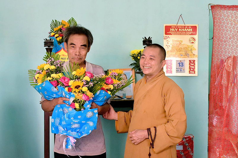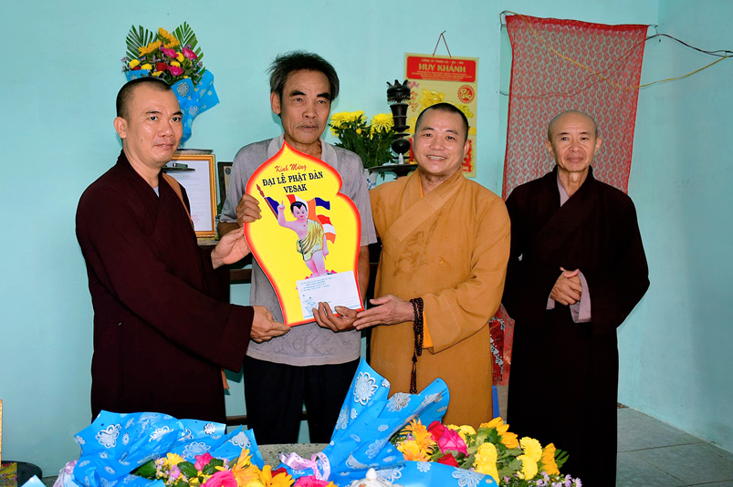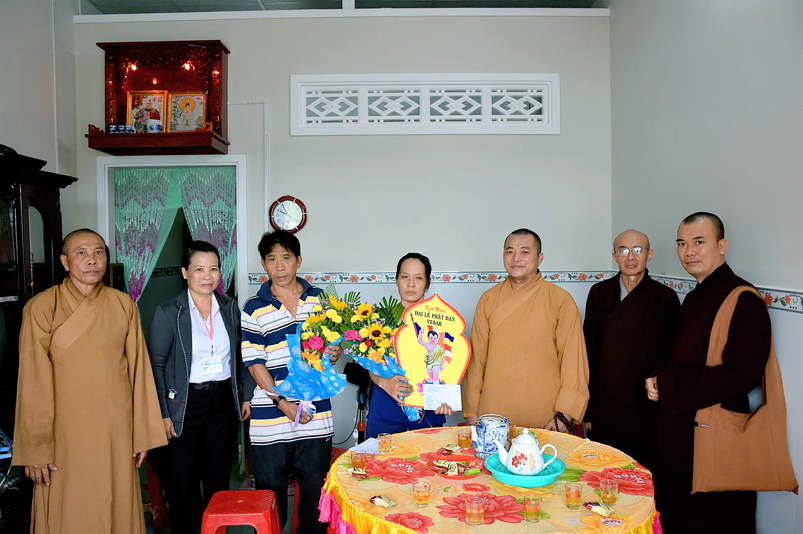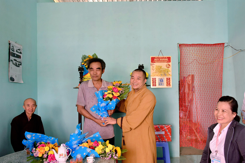 Tại buổi lễ trao nhà, Đại đức Thích Huệ Phát thay mặt cho ban thường trực Ban Trị sự GHPGVN huyện Cần Giuộc gởi lời chúc mừng Phật đản An lành hạnh phúc đến quý vị lãnh đạo Chính quyền và tặng ảnh Đức Phật Đản sanh chúc phúc cho hai hộ gia đình được xây nhà mới.